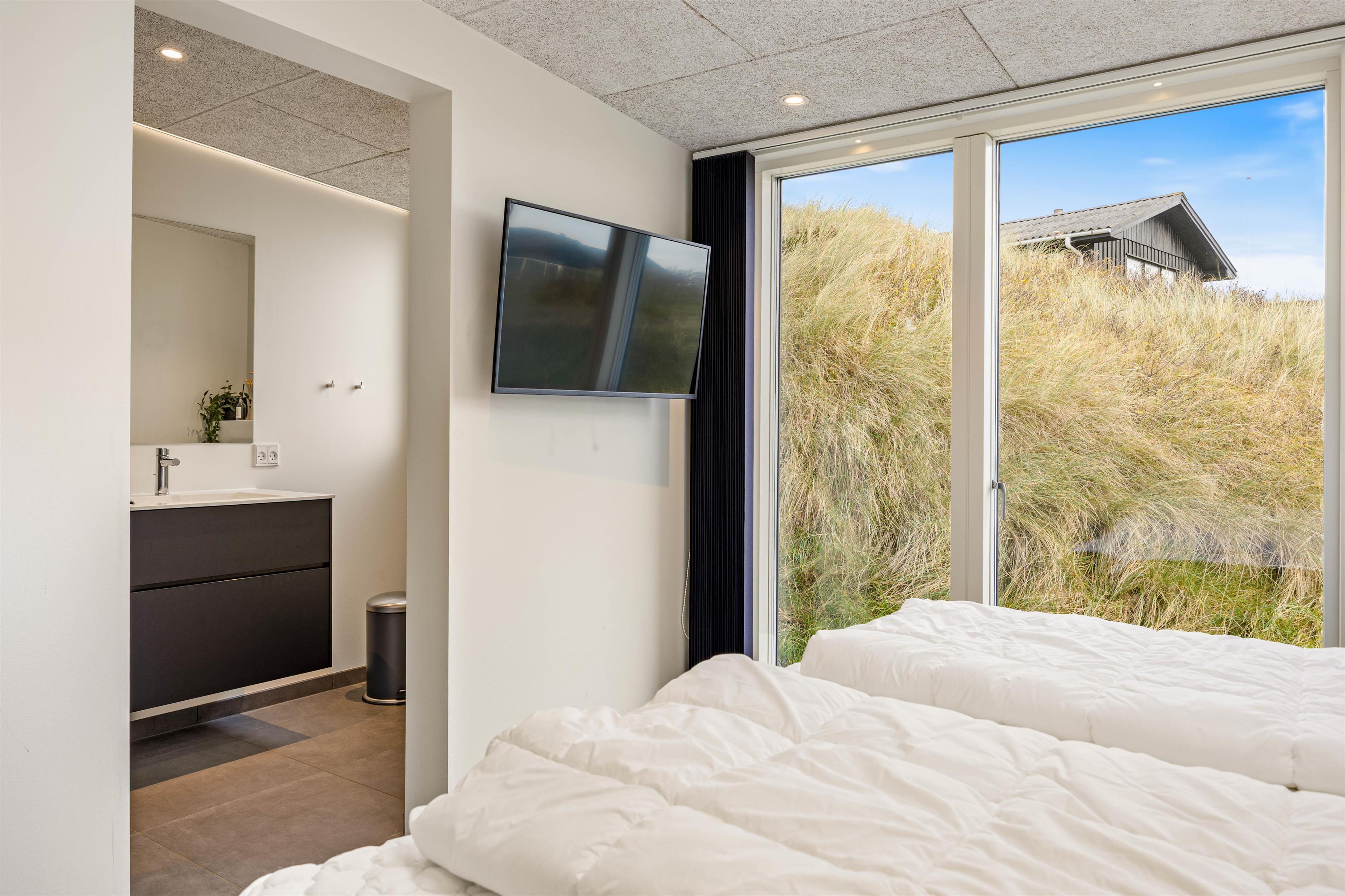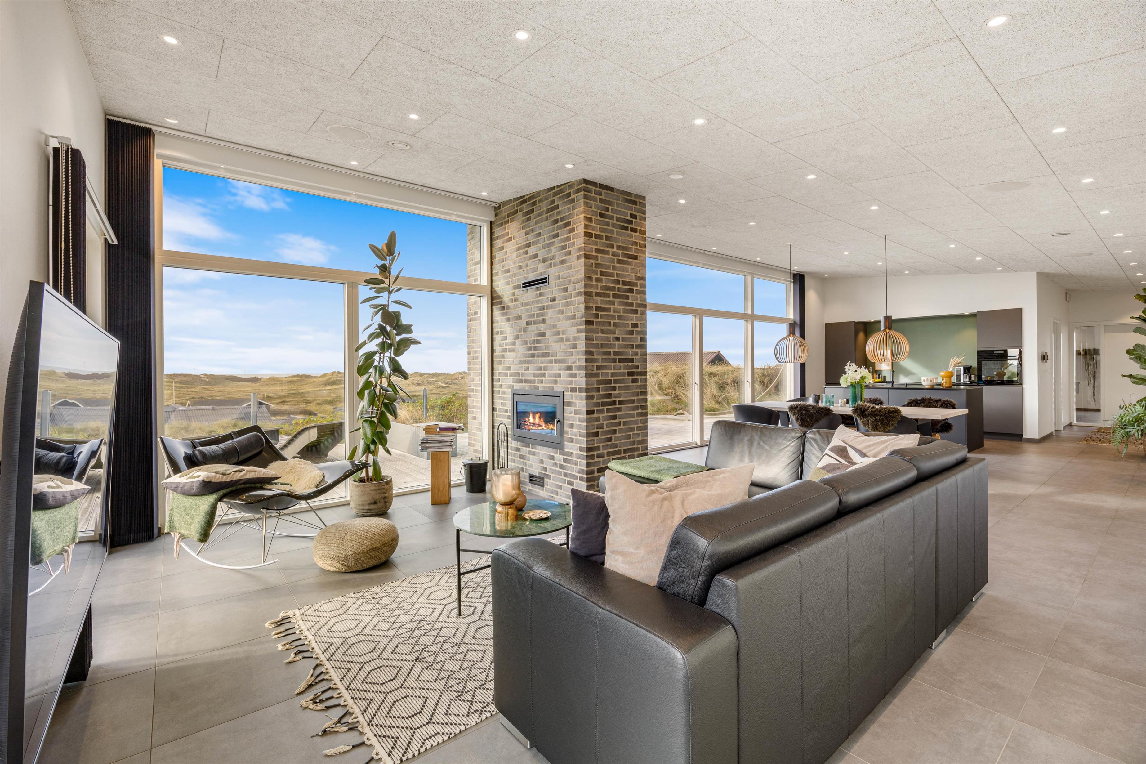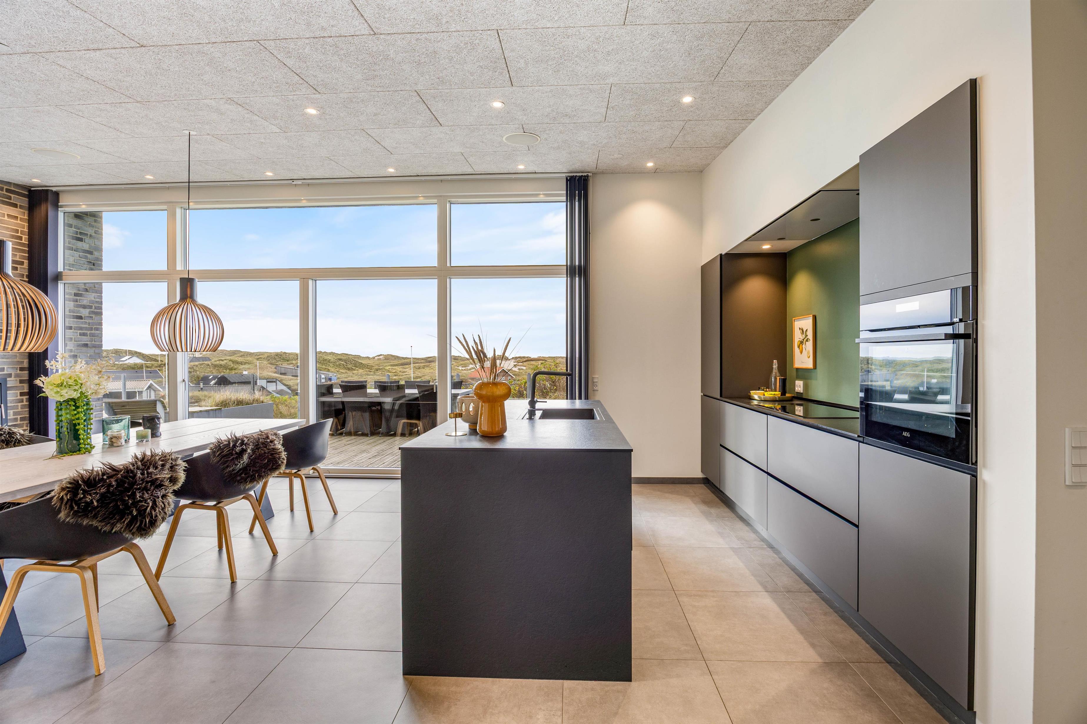 Det naturlige samlingspunkt i sommerhuset er det åbne køkken-alrum, hvor store vinduespartier skaber et behageligt lysindfald og giver en smuk udsigt over klitterne. For at gøre ferien så bekvem som muligt, er sommerhuset udstyret med opvaskemaskine, vaskemaskine og tørretumbler – praktiske faciliteter, der gør hverdagen lettere under opholdet.