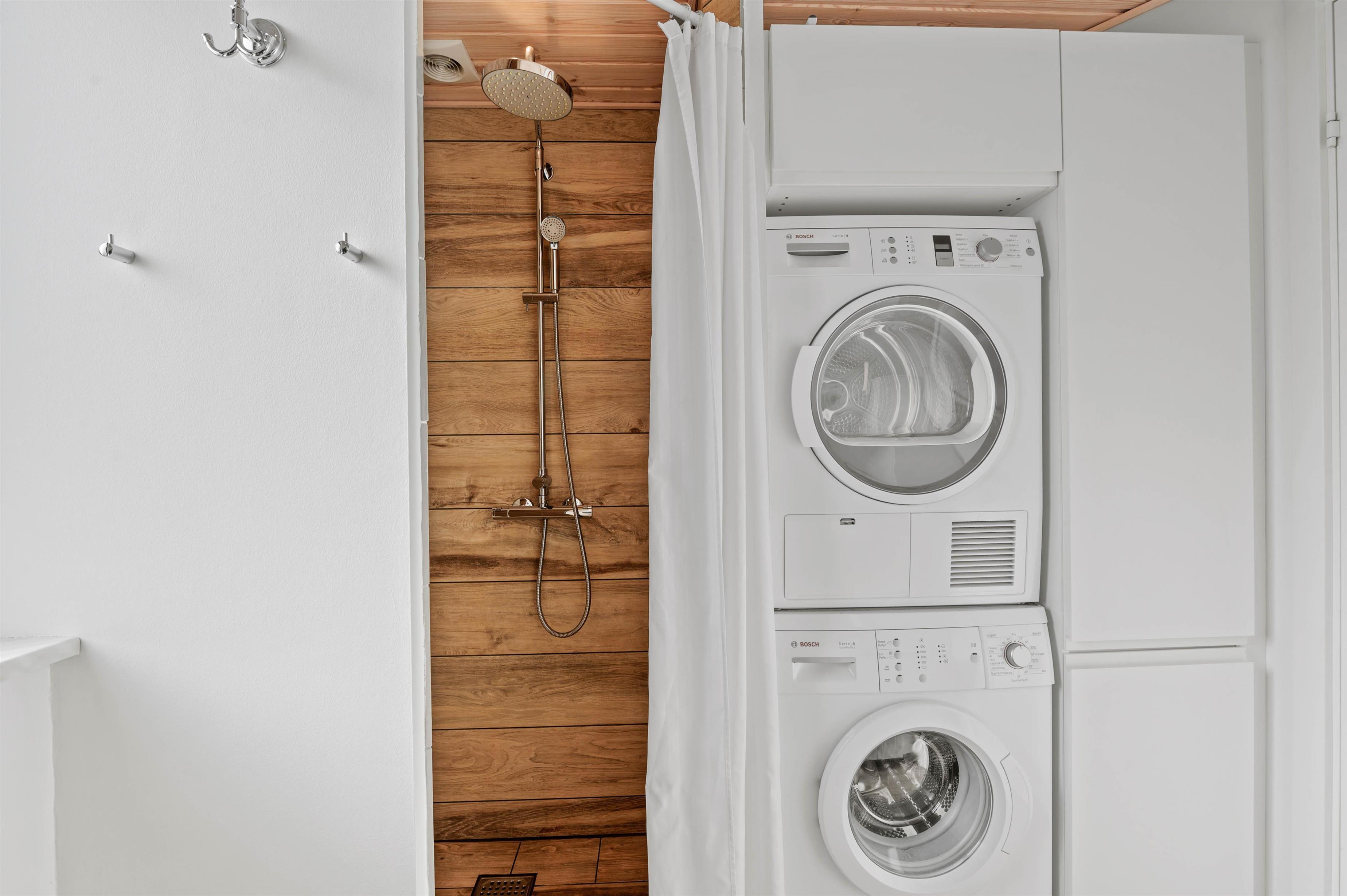 Overalt i huset er der et smukt, rengøringsvenligt og opvarmet flisegulv, og igennem hele huset går den røde tråd igen. Feriehuset bærer præg af en lys, kvalitetsbevidst og moderne indretning, der er med til give jer en behagelig fornemmelse og få jer til at føle jer hjemme. Der er også et rigtig flot badeværelse, der også er med en vaskesøjle, hvilket gør det nemmere for jer at pakke til jeres ferie, da I kan nøjes med at tage alt jeres favorit tøj med på ferien.