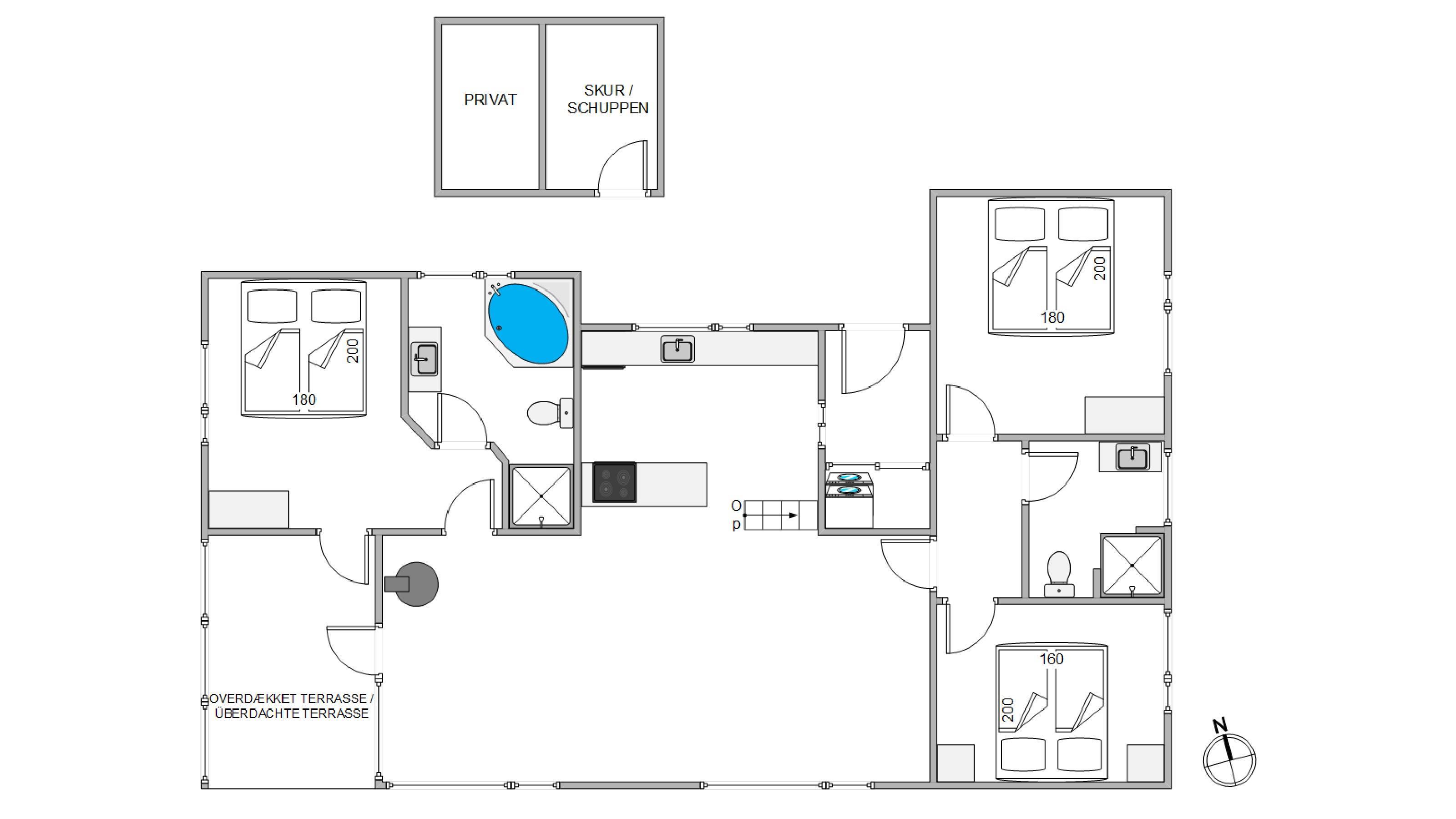 Den overdækkede terrasse er indhegnet , hvilket giver en ekstra følelse af privatliv og sikkerhed, især hvis man har børn eller hund med sig. Det er den ideelle løsning for dem, der ønsker at slappe af og nyde deres ferie uden at skulle bekymre sig om at holde øje med børn eller kæledyr. Der er også behagelige havemøbler og liggestole, som gør det ekstra komfortabelt at slappe af. Der er også mulighed for at grille og tilberede lækre måltider på terrassen, hvilket gør det til et fantastisk sted at samles med venner og familie.
