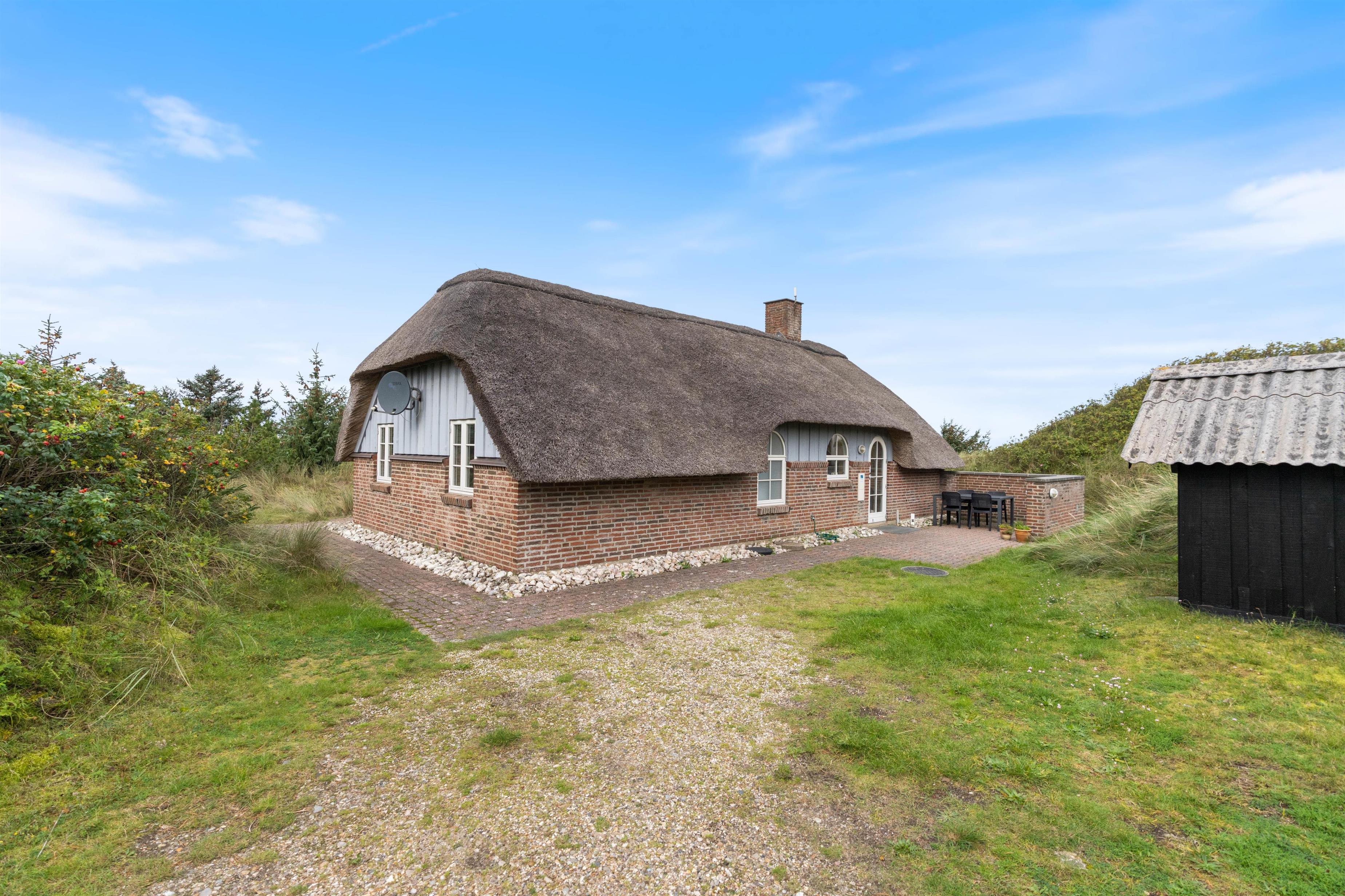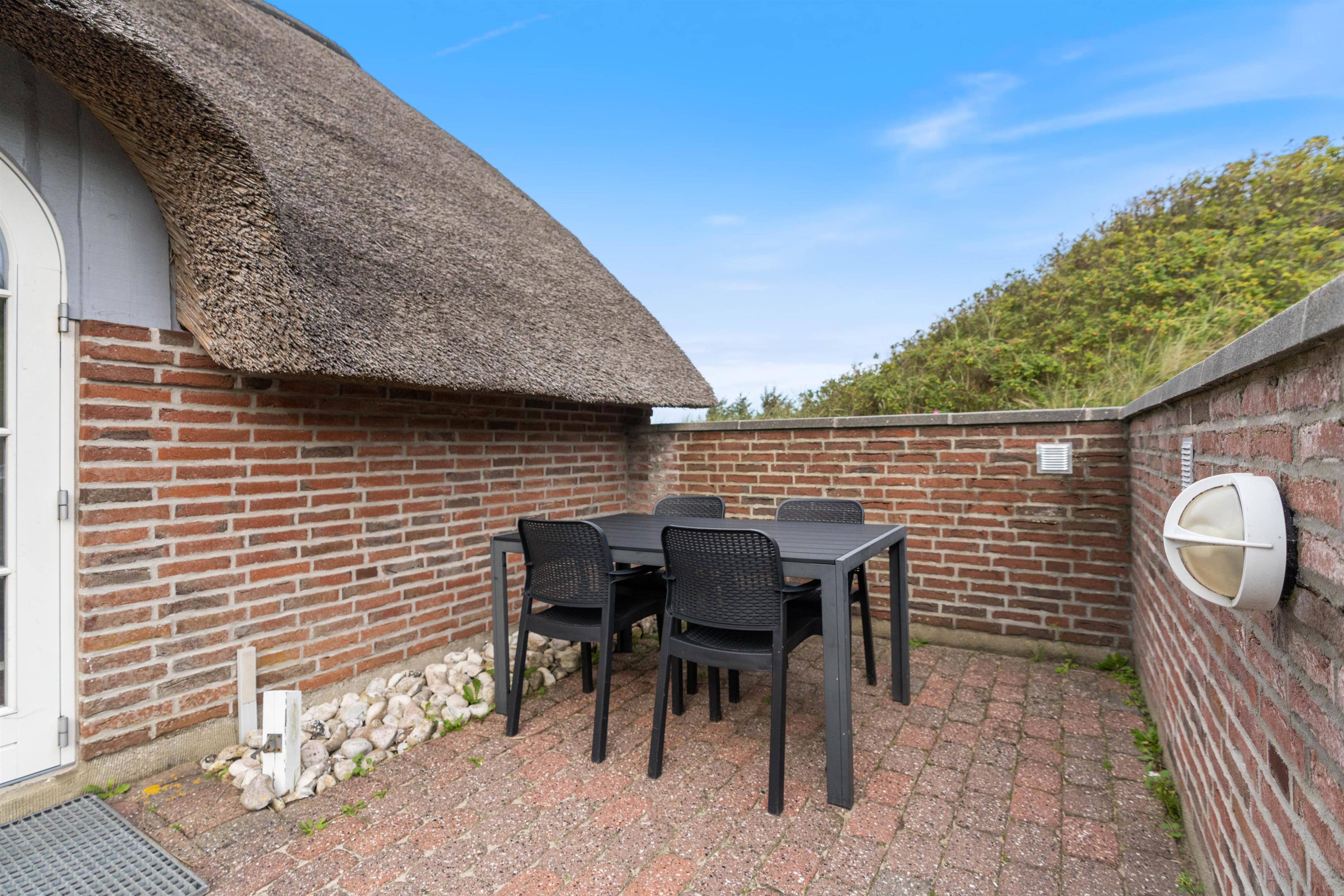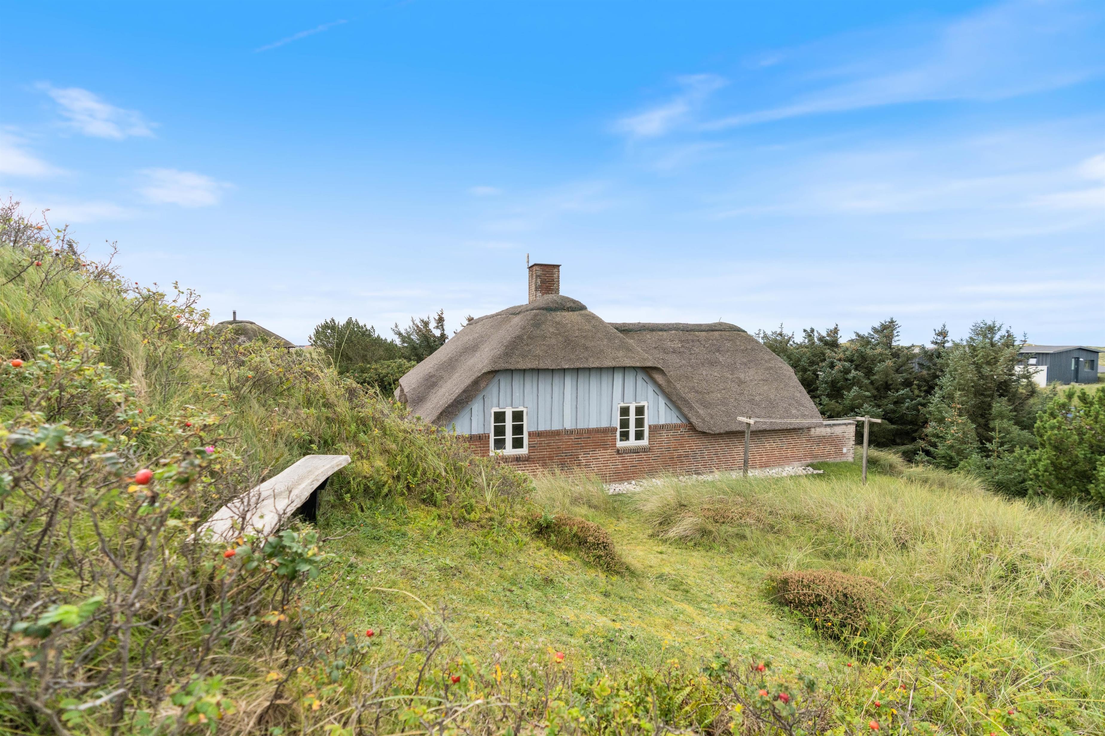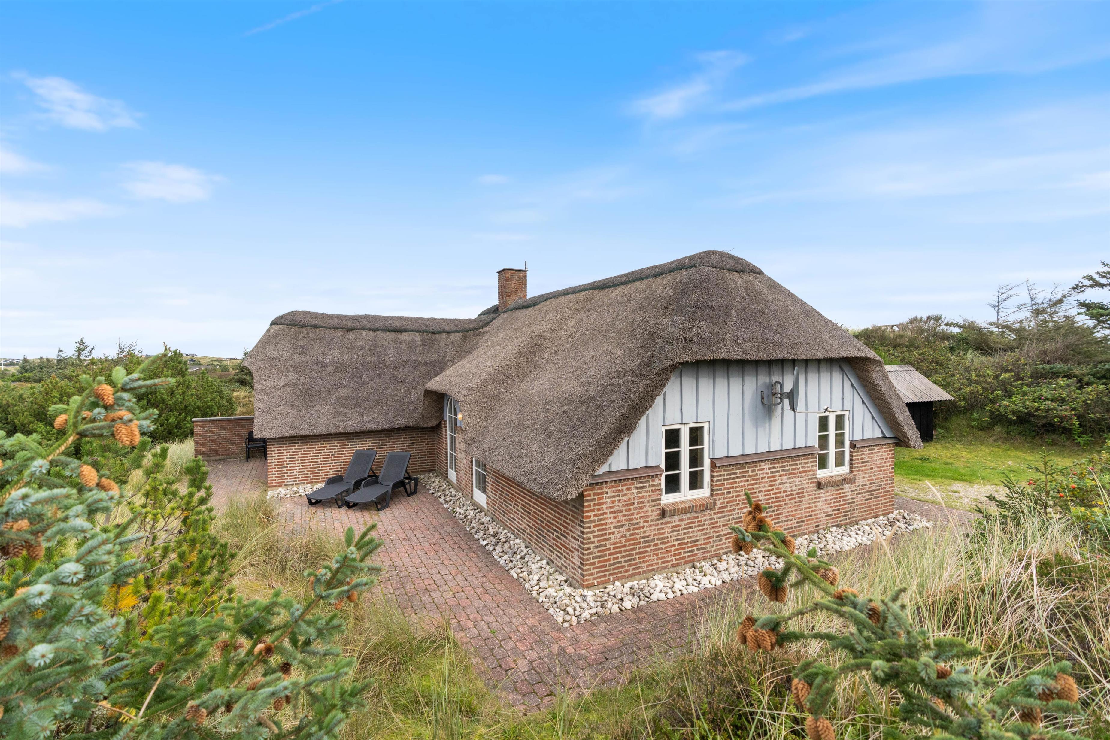 Dette dejlige stråtækte sommerhus i Houvig er lyst og indbydende. Og I vil øjeblikkeligt føle jer hjemme i de nye omgivelser. Kombinationen af stråtækt tag, rå murstensvægge, synlige loftsbjælker og brændeovnen bidrager til den hyggelige sommerhusstemning. Det er den helt rigtige ramme for familieferien.