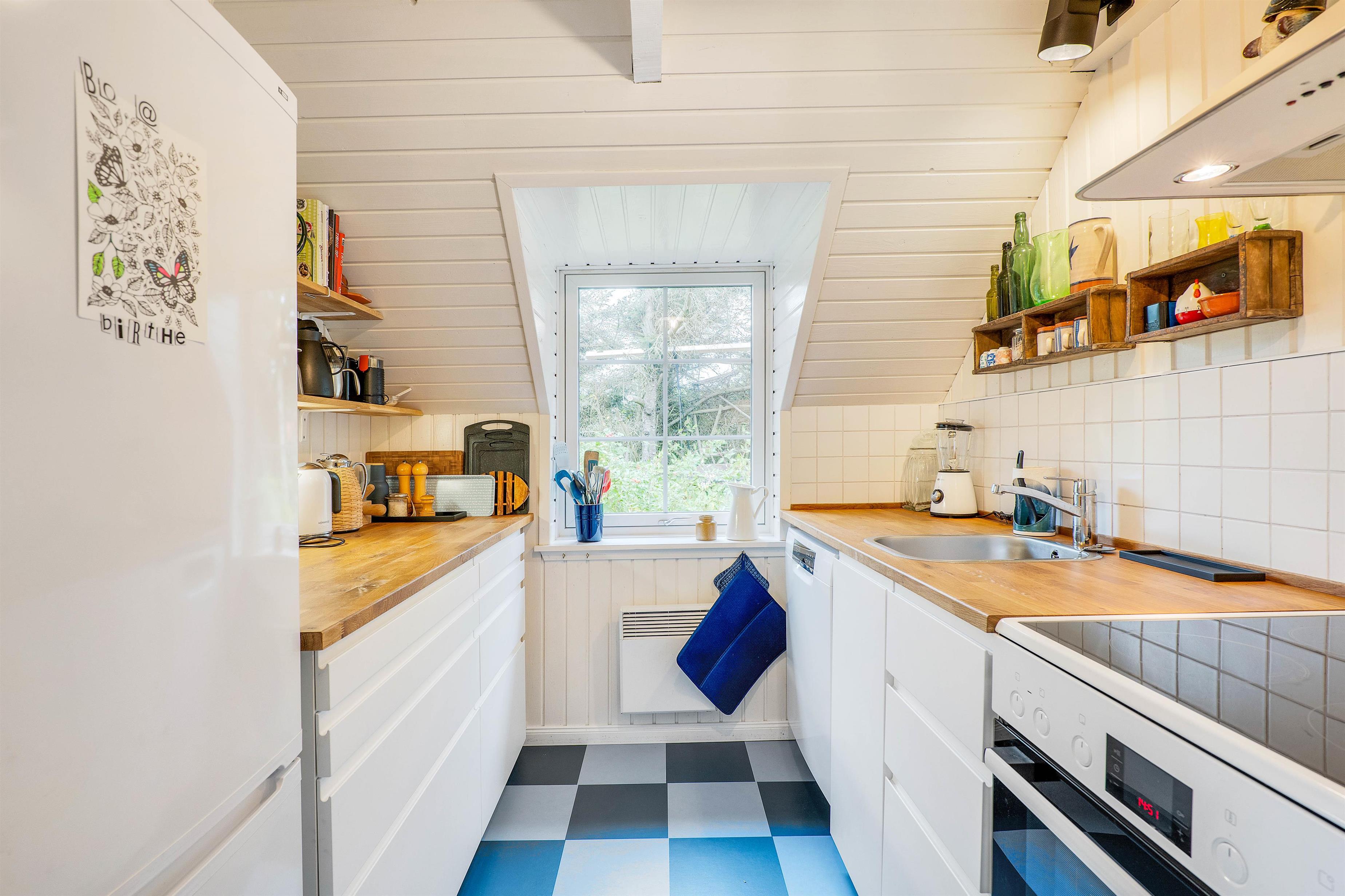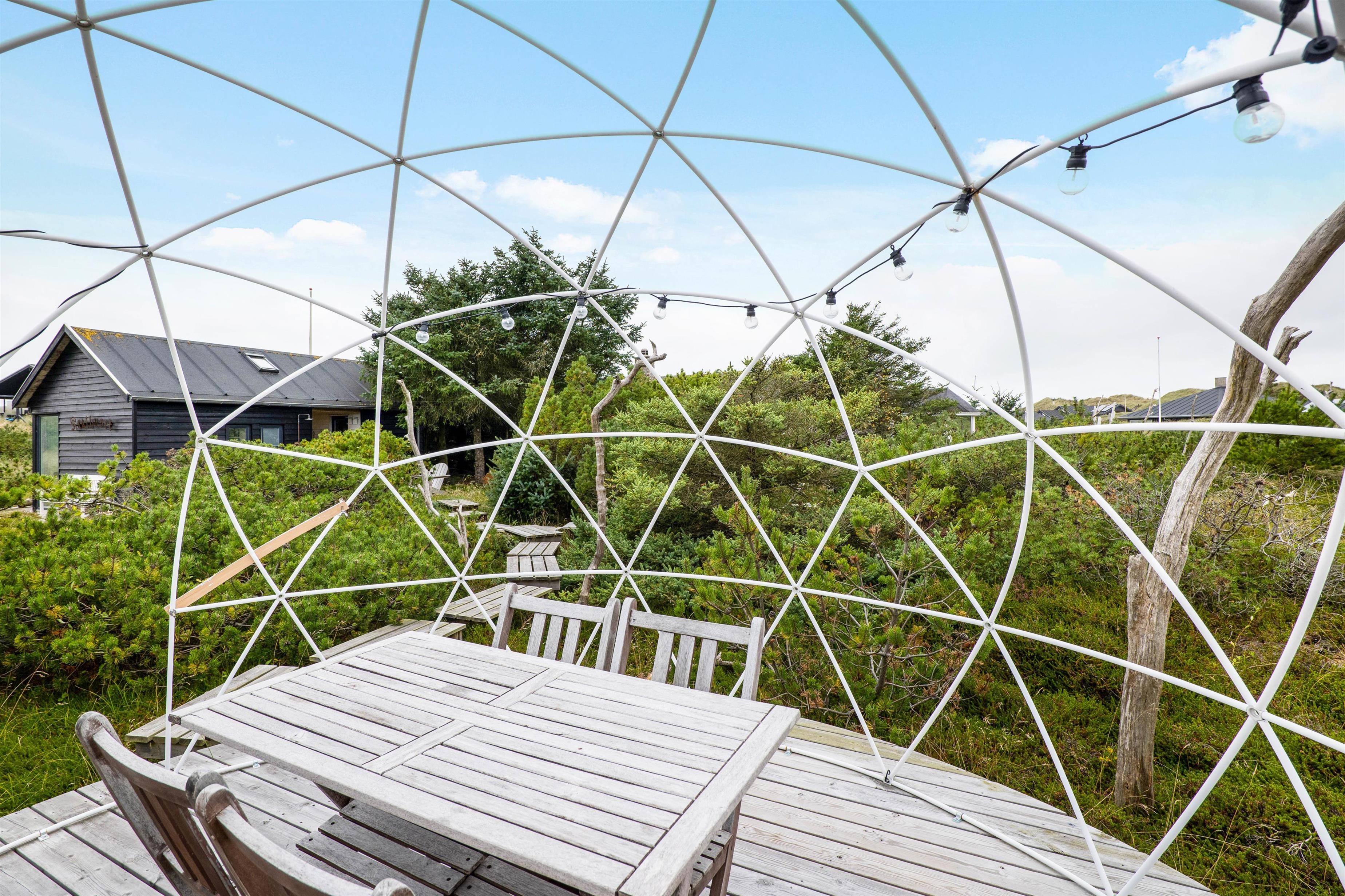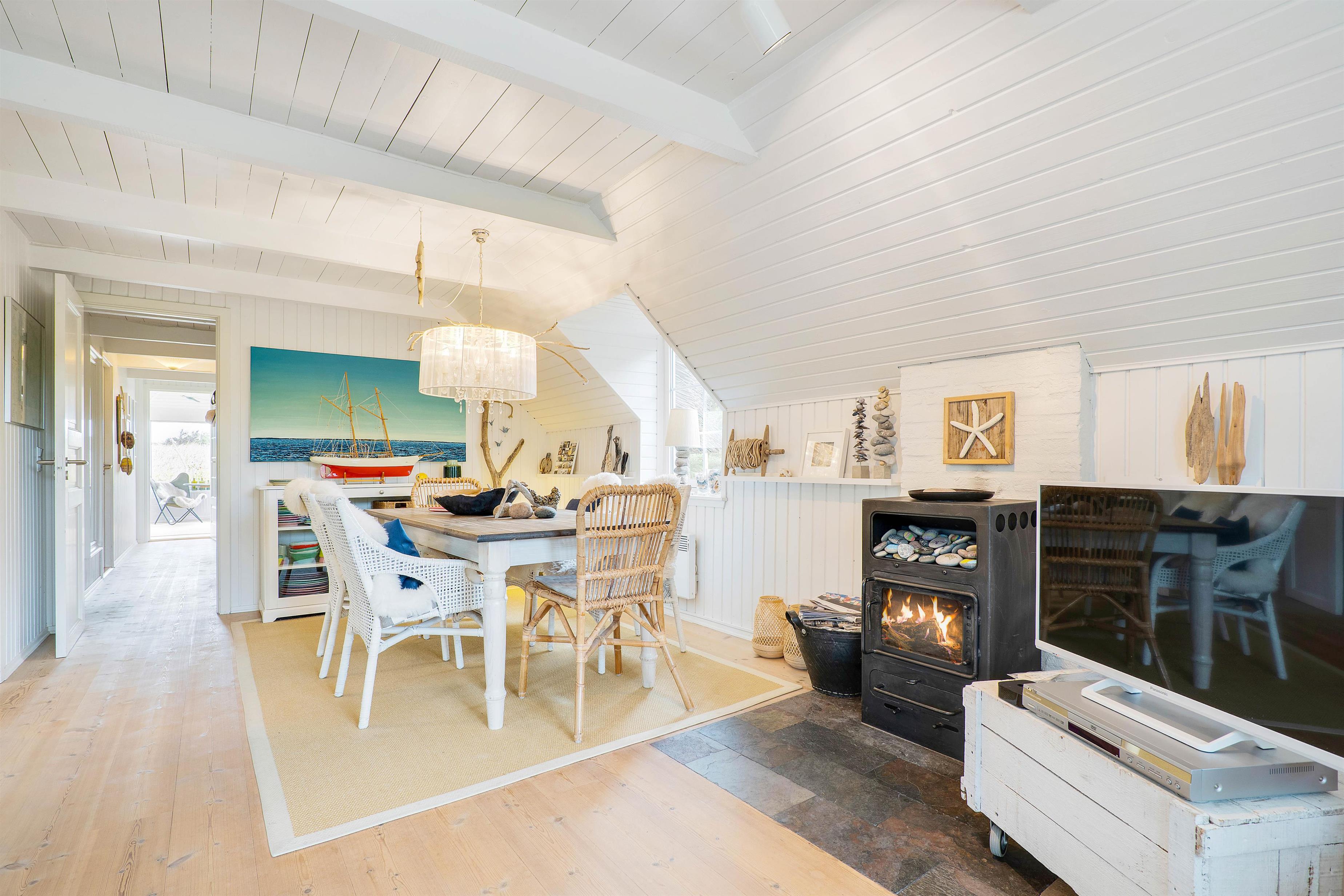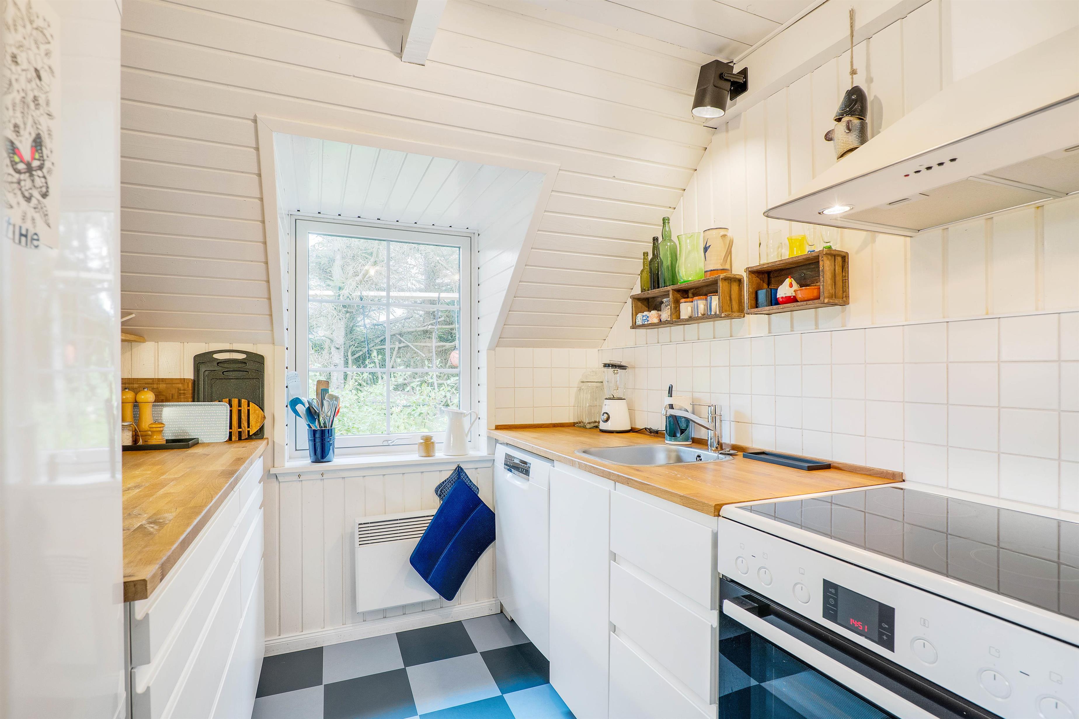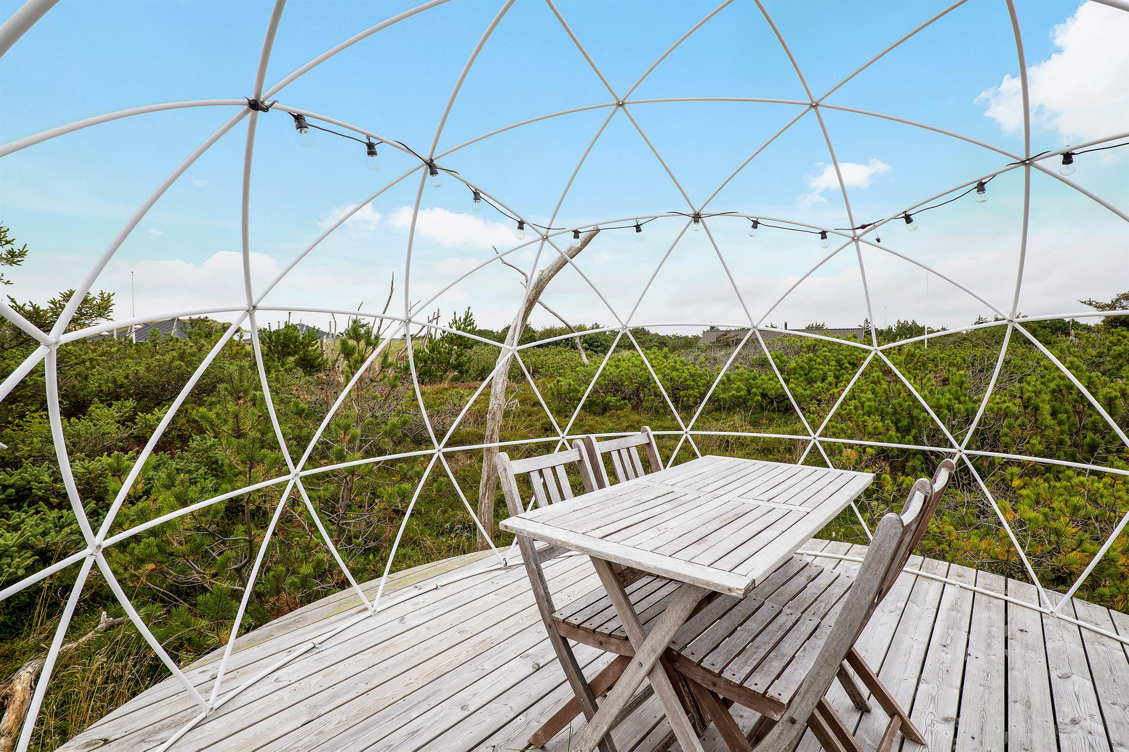 Sommerhusets mindre, men funktionelle køkken, er i åben forbindelse med den hyggelige stue og spisestue, hvor I også finder feriehusets brændeovn. Her kan I sidde og følge med i madlavningen og ferieplanlægningen. Efter en dejlig middag kan I sætte jer i stolene i udestuen – som husejer kalder for ”Agterstuen” – og her kan I nyde en drink eller en kop kaffe, mens I kigger ud i klitlandskabet og solnedgangen over den jyske hede. Udestuen er en lille kuppelformet stue i forlængelse af en træterrasse.