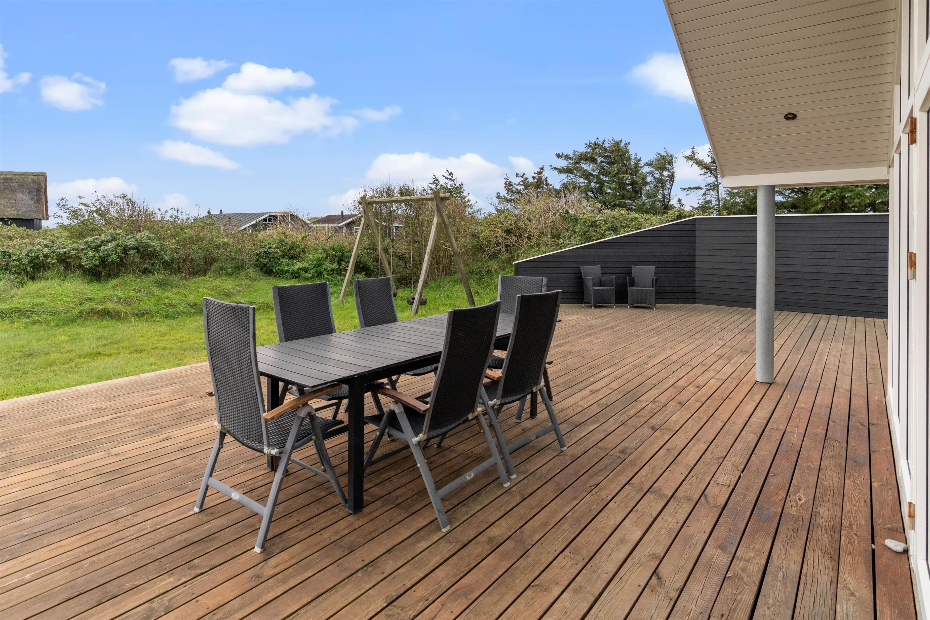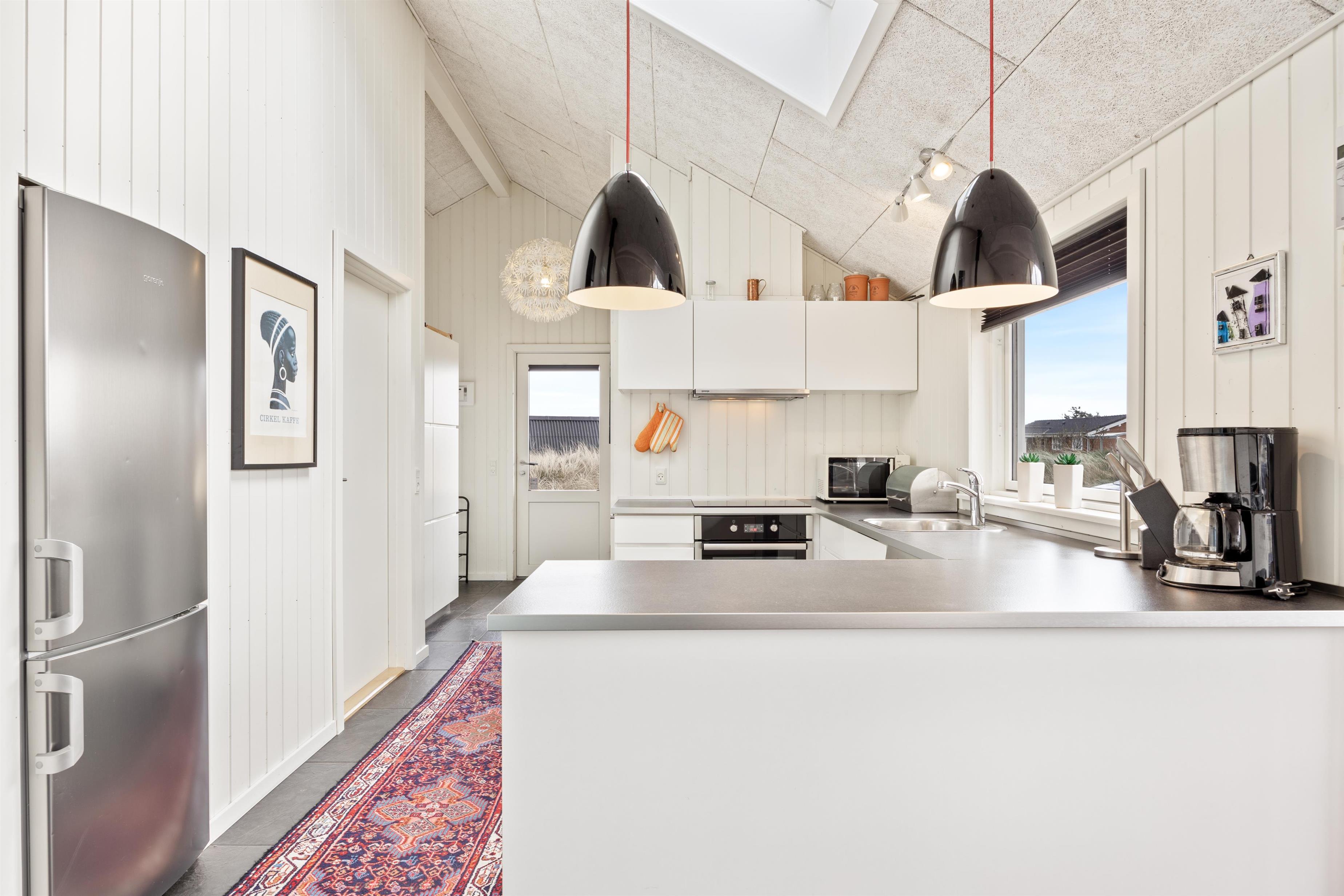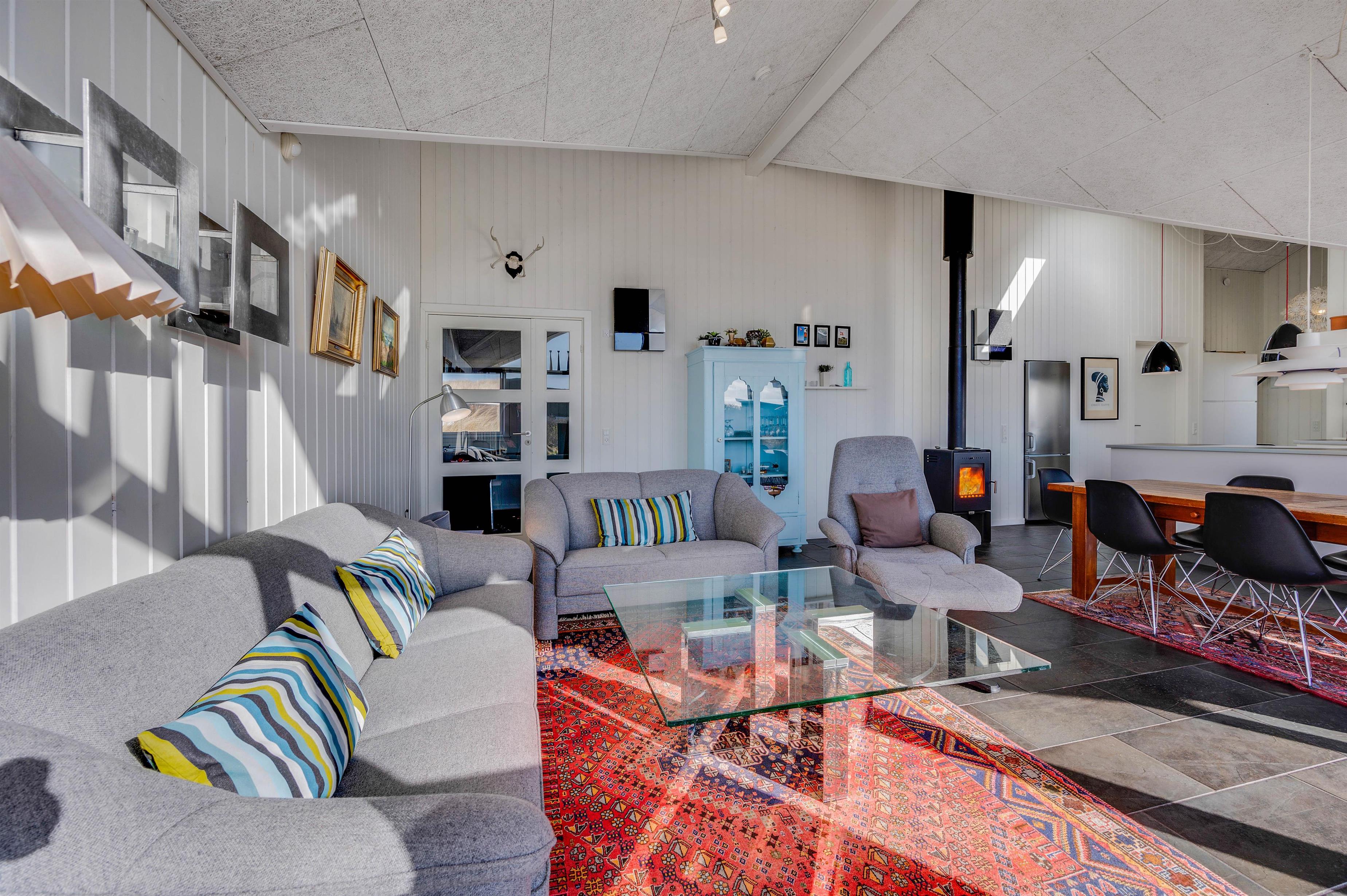 I det flotte sommerhus i Houvig bliver I mødt af en lys og imødekommende indretning, der oser af god kvalitet, komfort og personlighed. Klassiske elementer som panelvægge, behagelige møbler og en lun brændeovn er på fineste vis kombineret med detaljer med masser af karakter. Blandt andet de fine billeder væggene, flotte og iøjefaldende tæpper og eksklusive materialer.