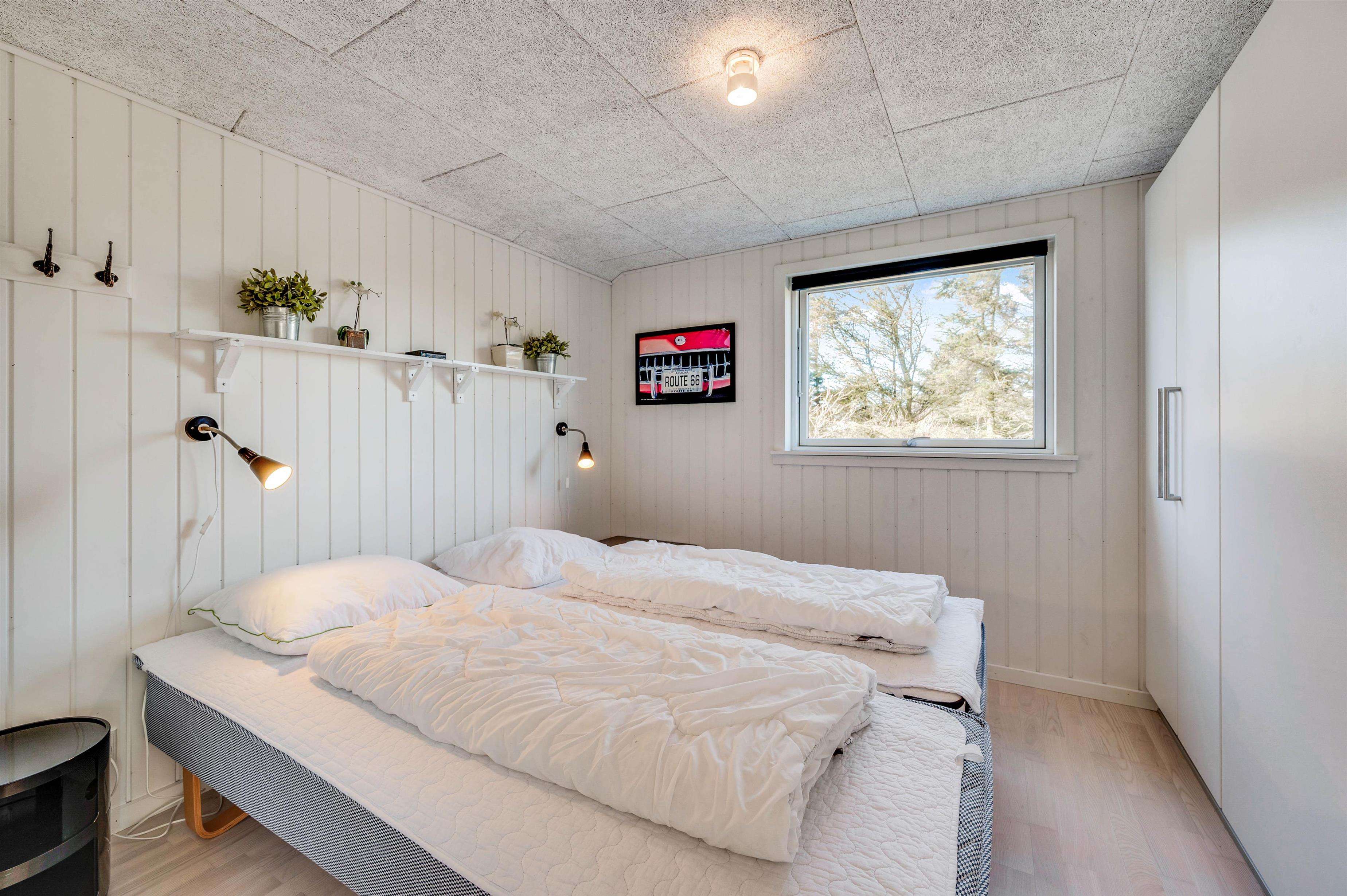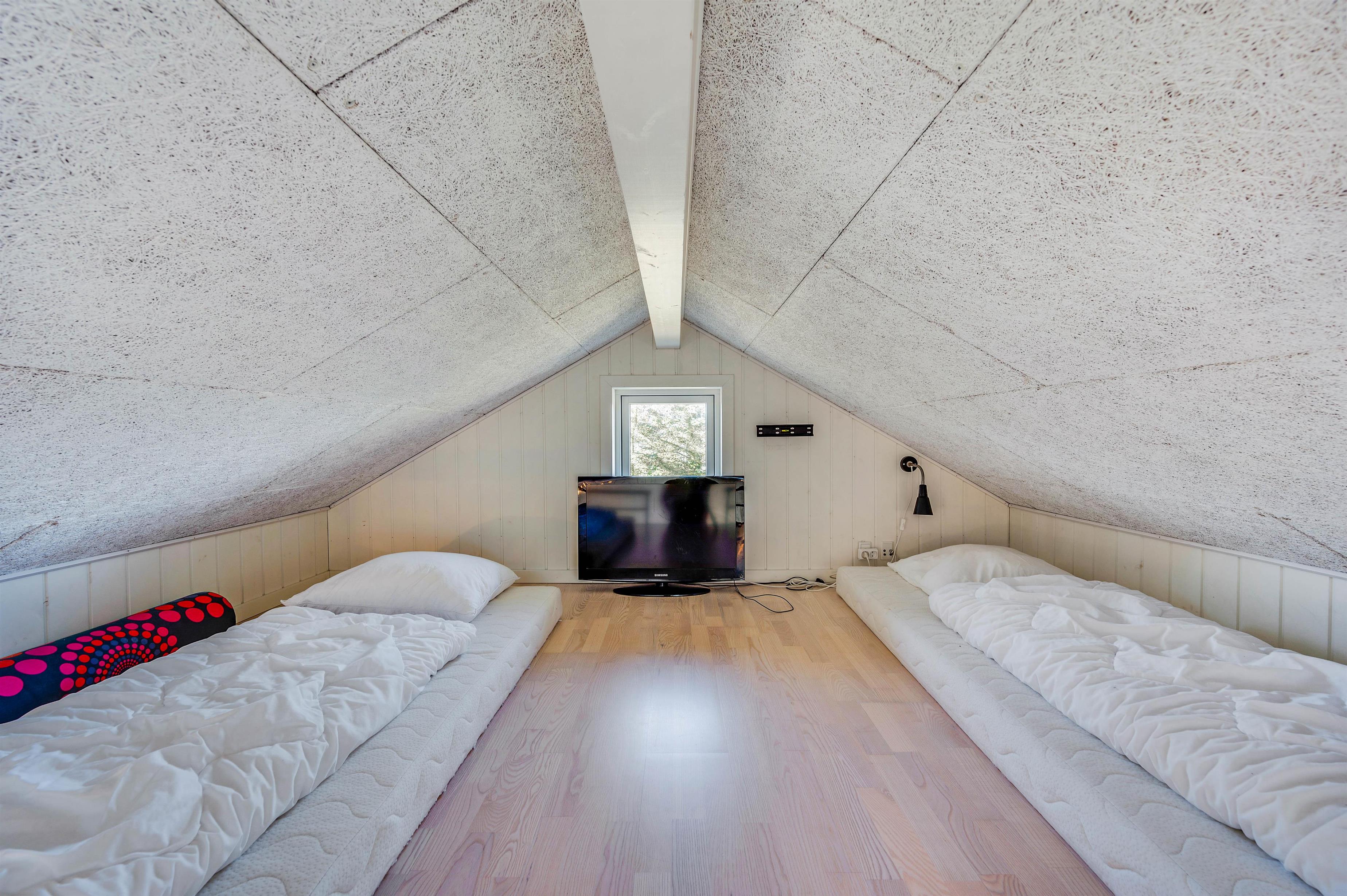 Der er i alt 8 sengepladser i huset – fordelt på 3 værelser og en hems. Alle værelser er indrettet med dobbeltseng, mens hemsen er udstyret med to enkeltmadrasser, der kan sættes sammen, hvis I ønsker det. I får adgang til hemsen via en trappestige i aktivitetsrummet. Om mon ikke familiens teenagere vil gøre krav på dette område?