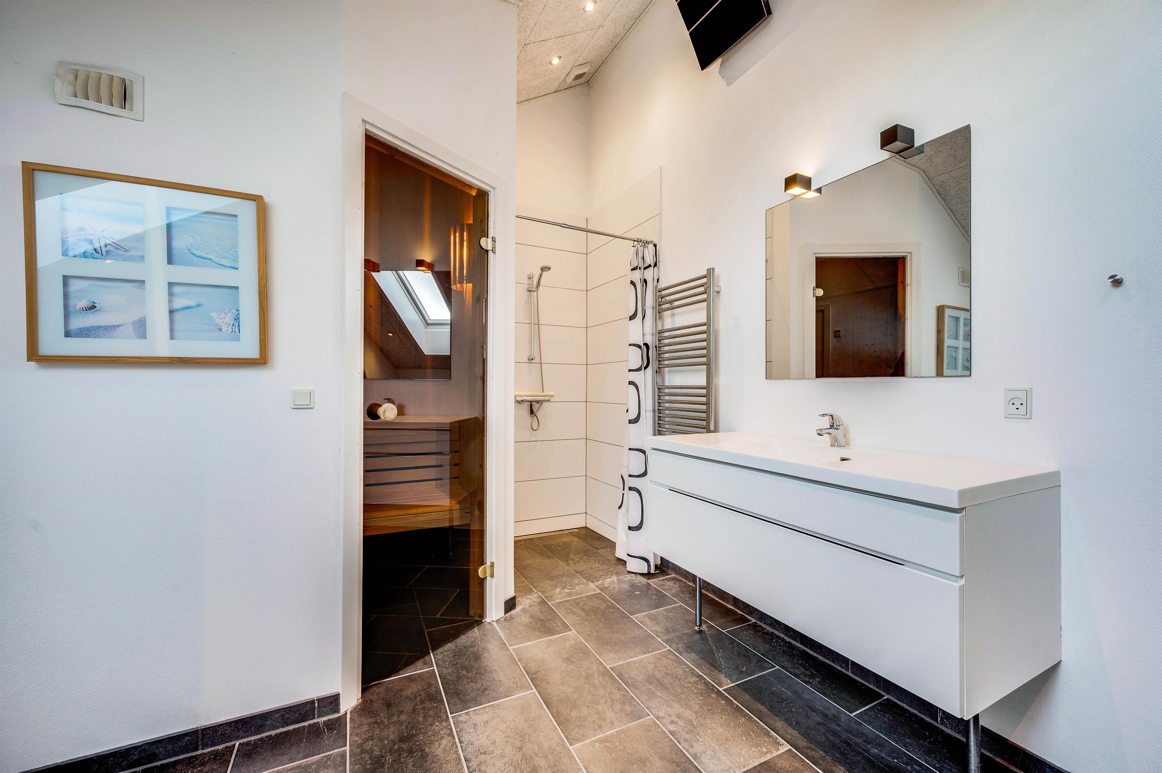 Det flotte lyse badeværelse er nemlig et sandt mekka, når det kommer til wellness og afslapning. Her er der blandt andet en lækker sauna og et skønt nedsænket spabad med nakkestøtte. Og musikanlægget sørger for at akkompagnere jeres hyggestunder på badeværelset med skønne toner. Der er desuden et pænt gæstetoilet med bruseniche, vaskemaskine og tørretumbler.