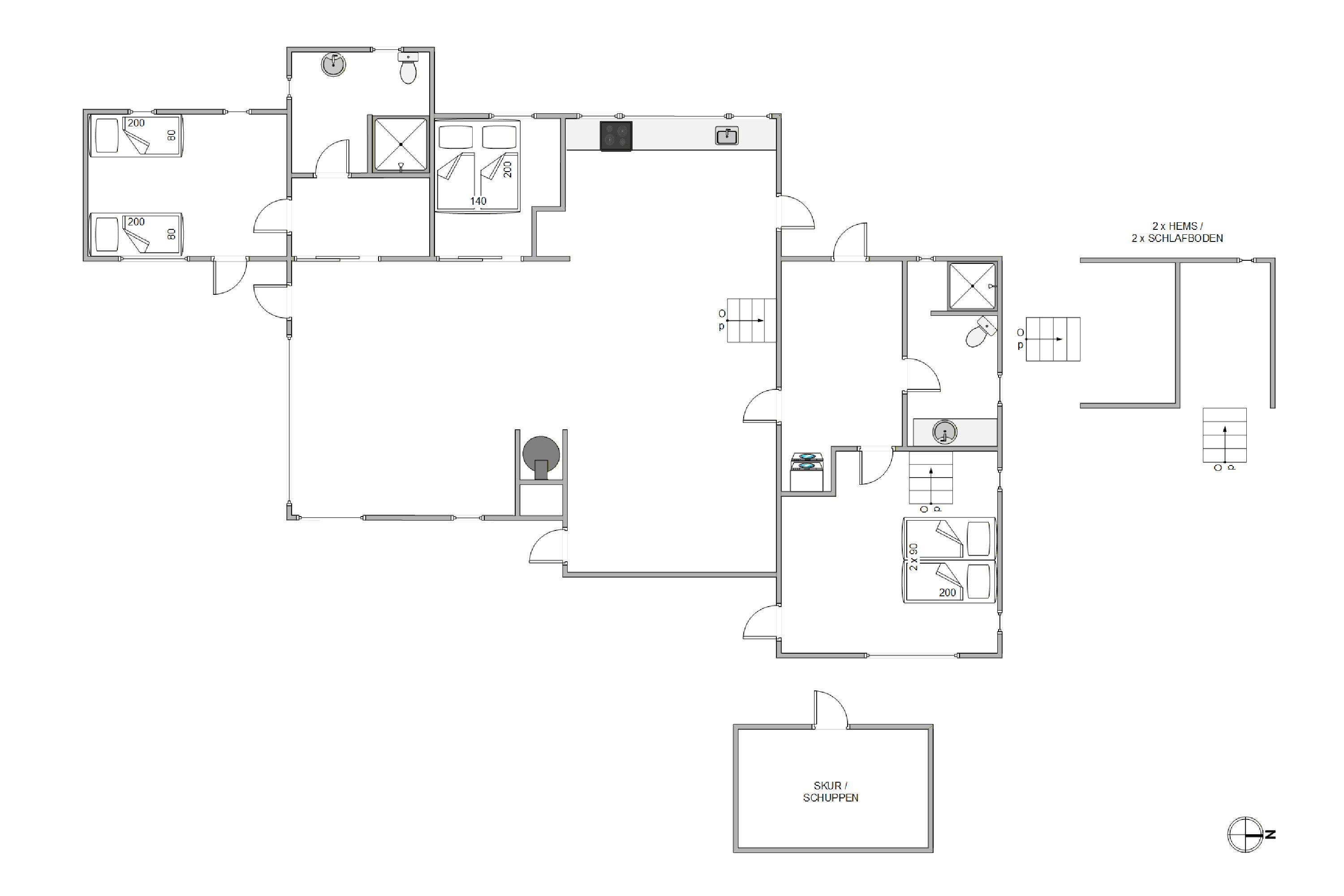 I vil opleve når I træder ind i feriehuset, at det hele vejen igennem er gennemfært og at det er et lækkert og spændende feriehus i Houvig, der er bygget i gode og eksklusive materialer. Der er rengøringsvenlige og dejlige klinkegulve, hvor der også er gulvvarme i. Indretningen og møbleringen er indbydende, hvor det store køkkenalrum fungerer som feriehusets hjerte, hvor hele kan familien samles. Her er hyggeligt og funktionen med loft til kip, bidrager til at rummet føles endnu større.Feriehusets 2 hemse er helt sikkert tiltalende for de yngre gæster, da de her kan lege uforstyrret og måske bygge en hyggelig hule.