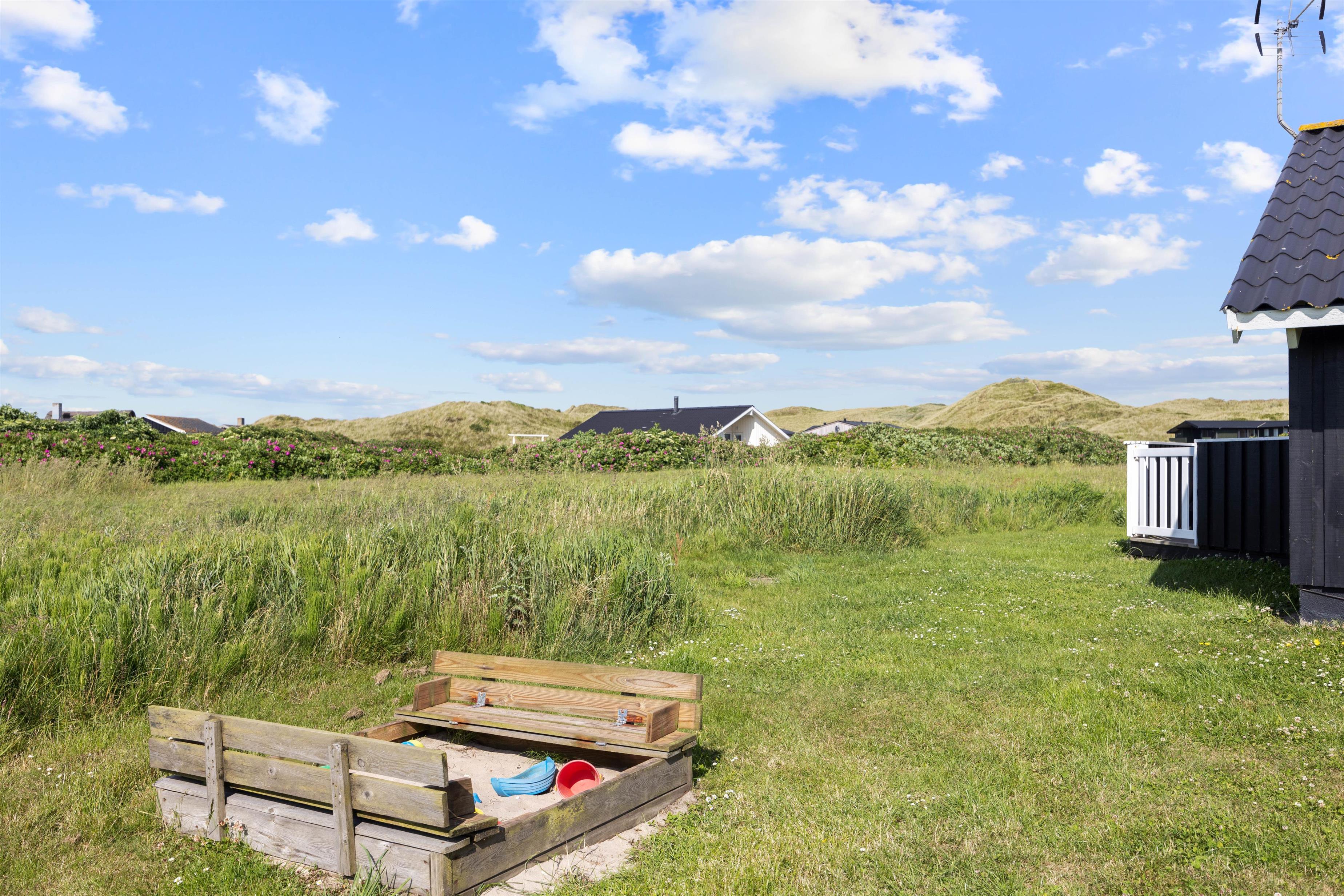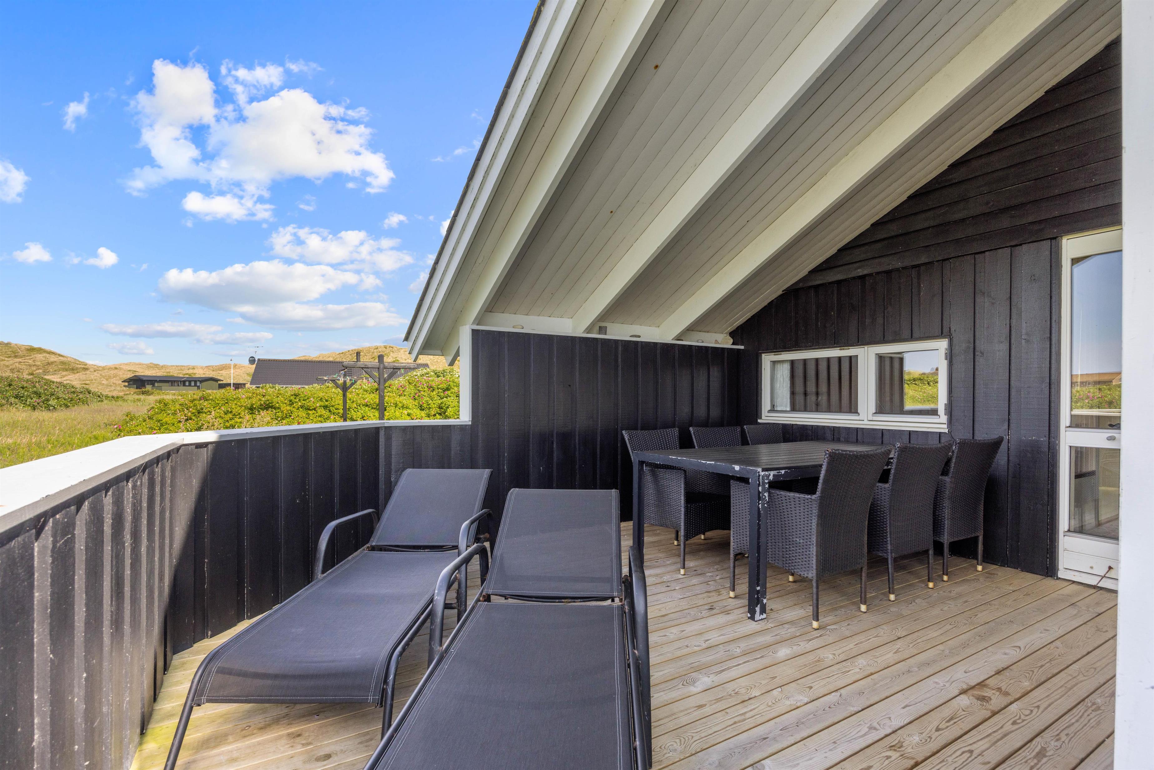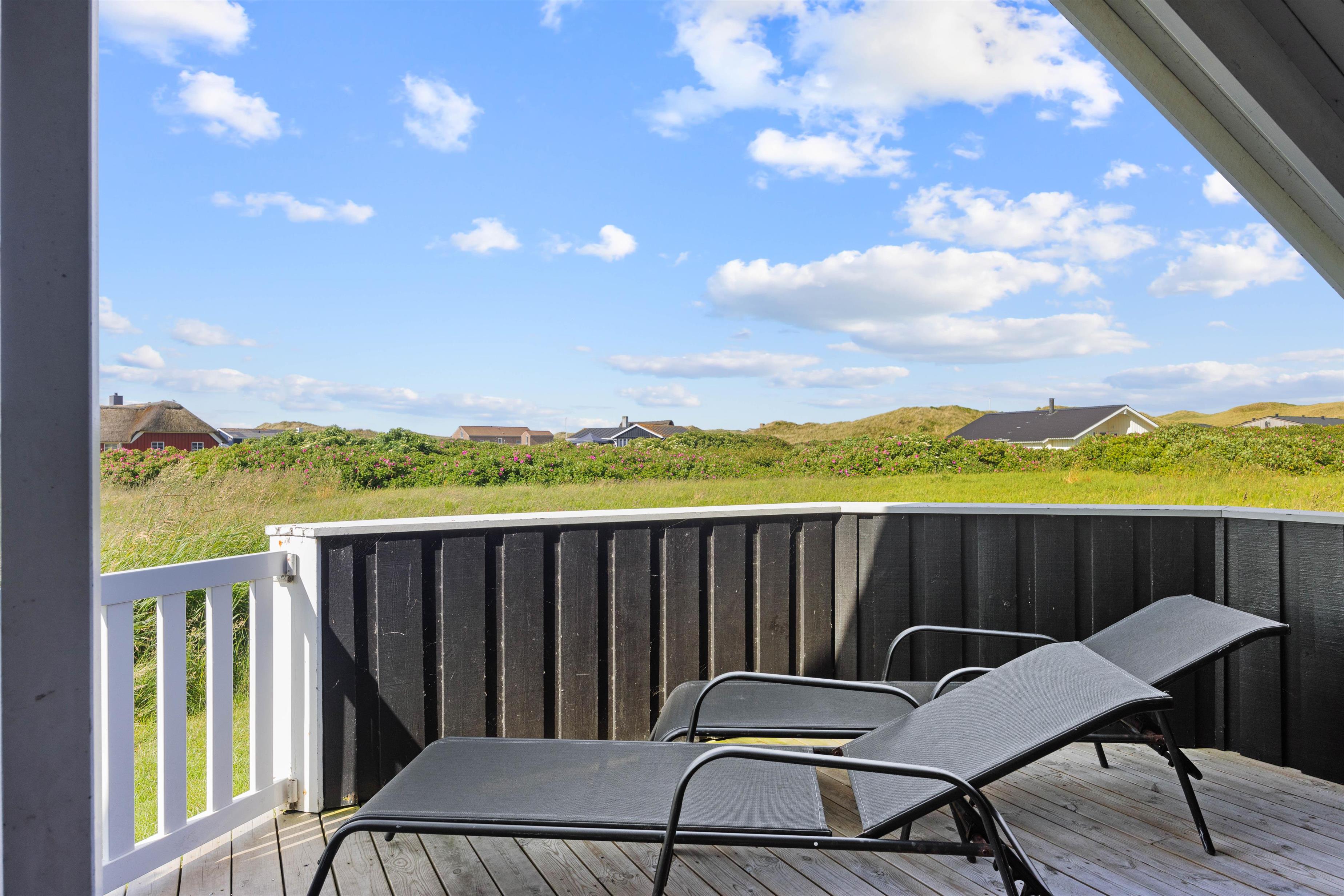 I dette fine feriehus har du en super skøn lukket terrasse – lad din hund nyde at gå frit ind og ud af huset, uden du behøver at bekymre dig om at den løber væk. Læn dig tilbage og nyd den friske luft fra Vesterhavet i huset havemøbler eller smid stegen på grillen alt imens du læser en god bog eller leger med hunden eller børnende på den skønne græsplæne. Fordi terrassen vender mod vest, er den helt perfekt til de lange sommeraftenener, hvor I fra terrassen kan betragte solen der stiller går ned bag klitterne.