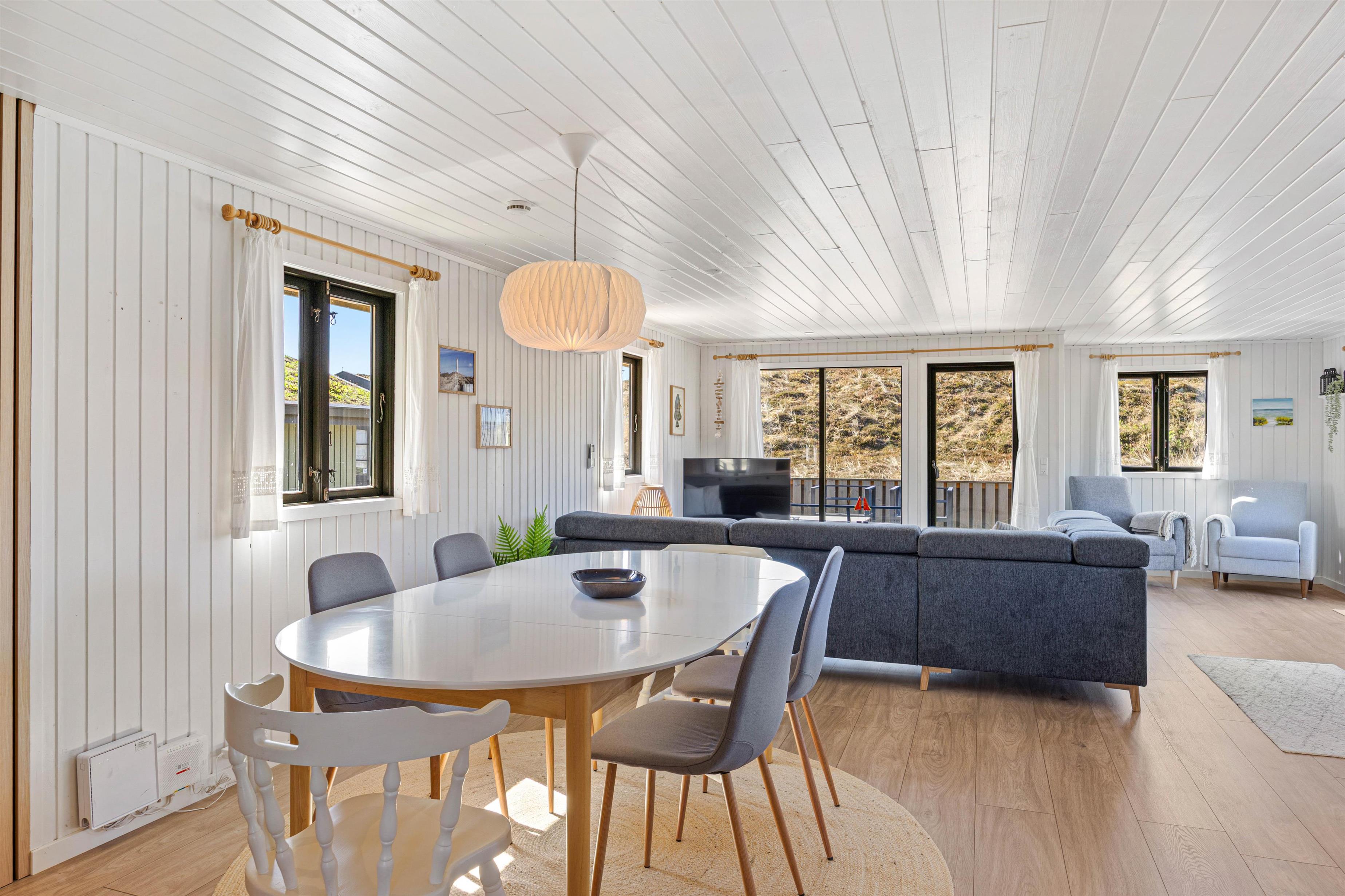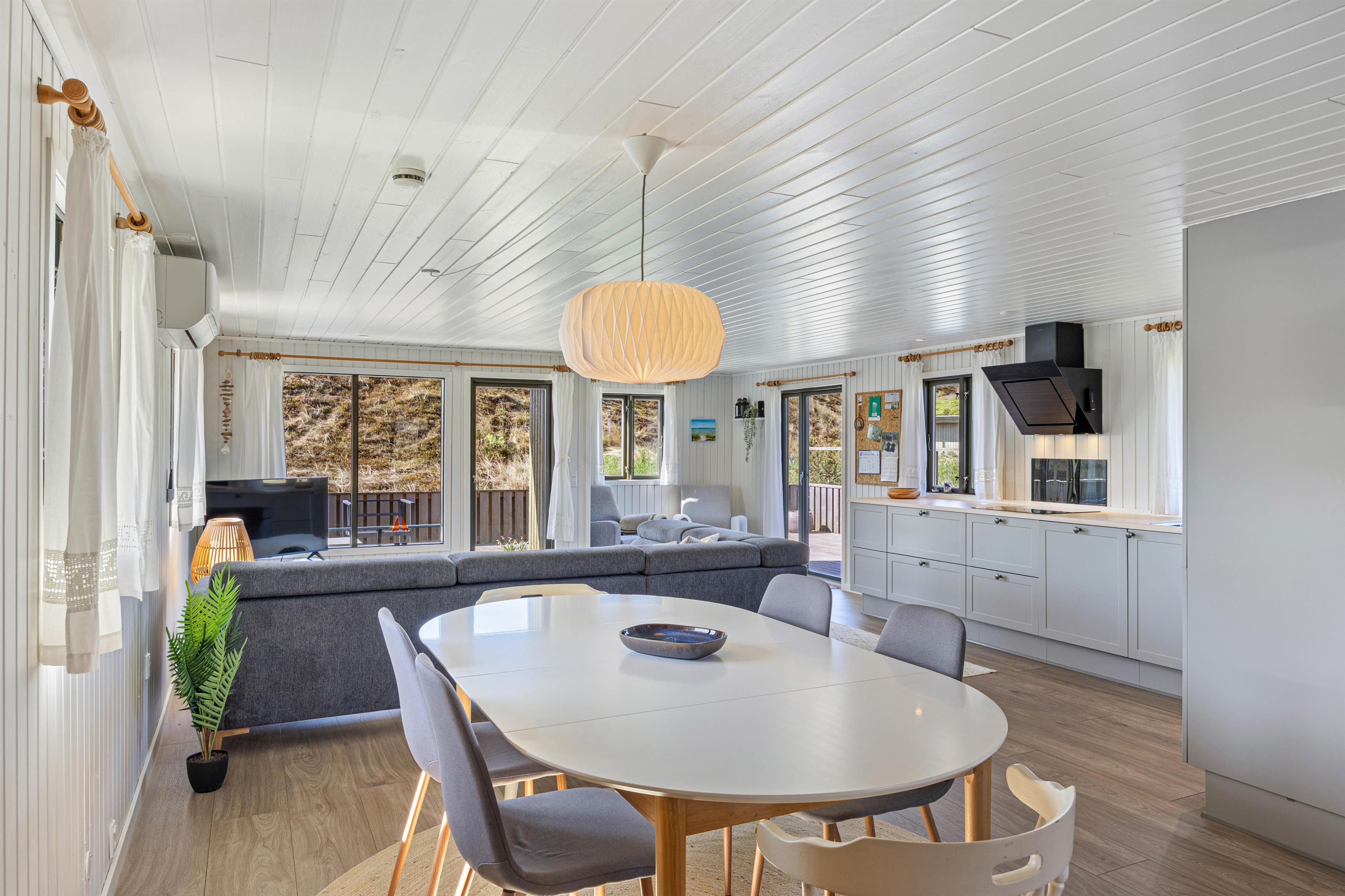 I sommerhus på Sortebærdalen 57 vil I føle jer godt tilpas, så snart I ankommer på ferieadressen. Når I træder indenfor i sommerhuset, bliver I mødt af en lys og indbydende indretning med komfortable møbler. I alrummet, hvor køkken, stue og spisestue er samlet i ét, vil I tilbringe mange timer af jeres ferie med madlavning, spil og film. Et ekstra plus ved det dejlige opholdsrum, er at det opvarmes af en energivenlig luft-til-luft varmepumpe.