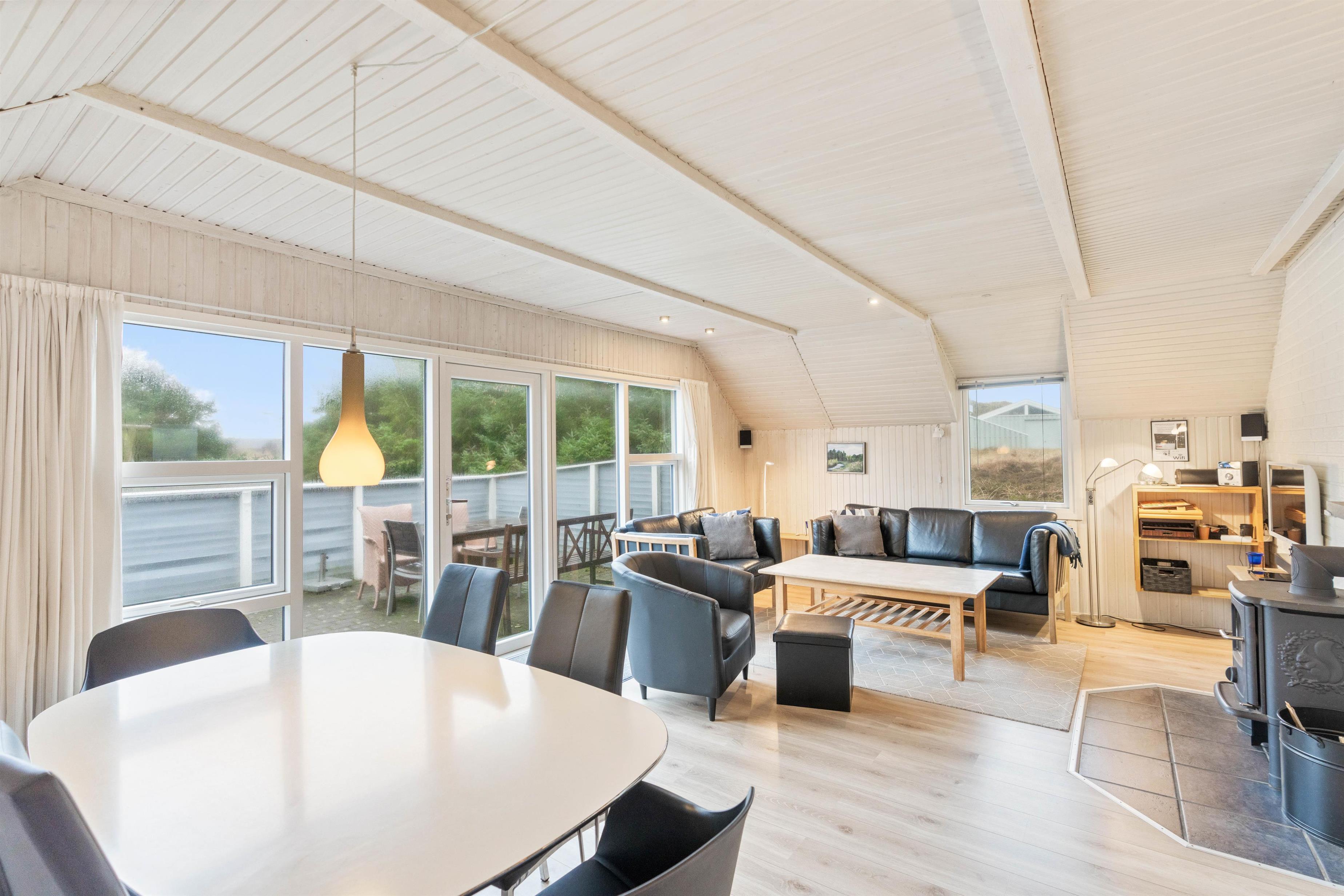 Så snart I træder ind i sommerhuset i Houvig, vil I mærke skuldrene sænke sig. Her hersker en dejlig ro, der er fuldkommen smittende på sine besøgende. Husets hjerte er det skønne opholdsrum, hvor stue, spiseplads og køkken smelter sammen. I er derfor aldrig langt væk fra hinanden, når I opholder jer i huset.
