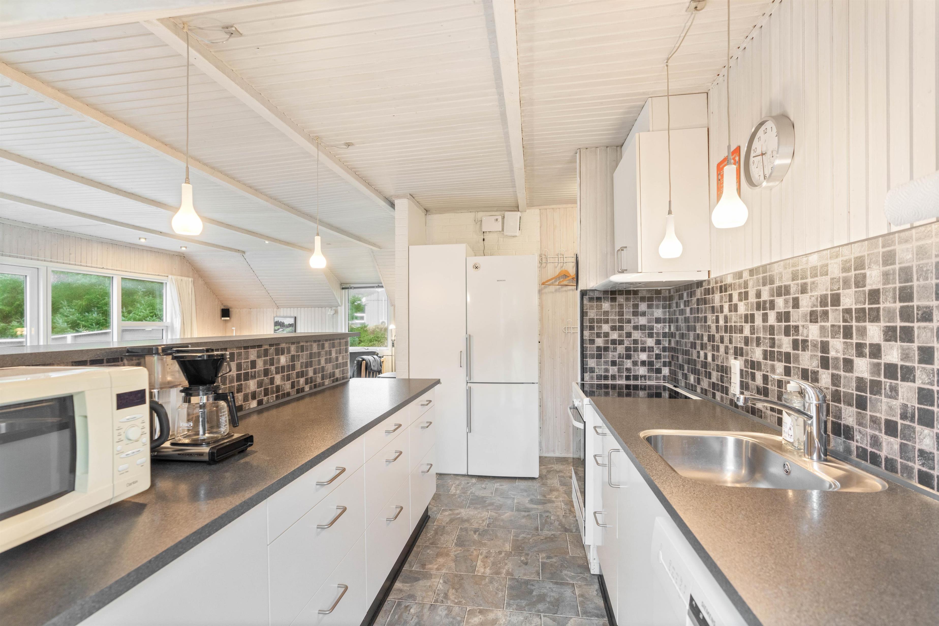 I køkkenet er der god plads til madlavningen, og I har blandt andet opvaskemaskine, mikroovn samt køleskab med 87 liters frysekapacitet til jeres rådighed (samt 90 L ekstra fryser i skuret). Herudover finder I 2 gode soveværelser med dobbeltseng samt et pænt og velfungerende badeværelse med bruseniche og gulvvarme.