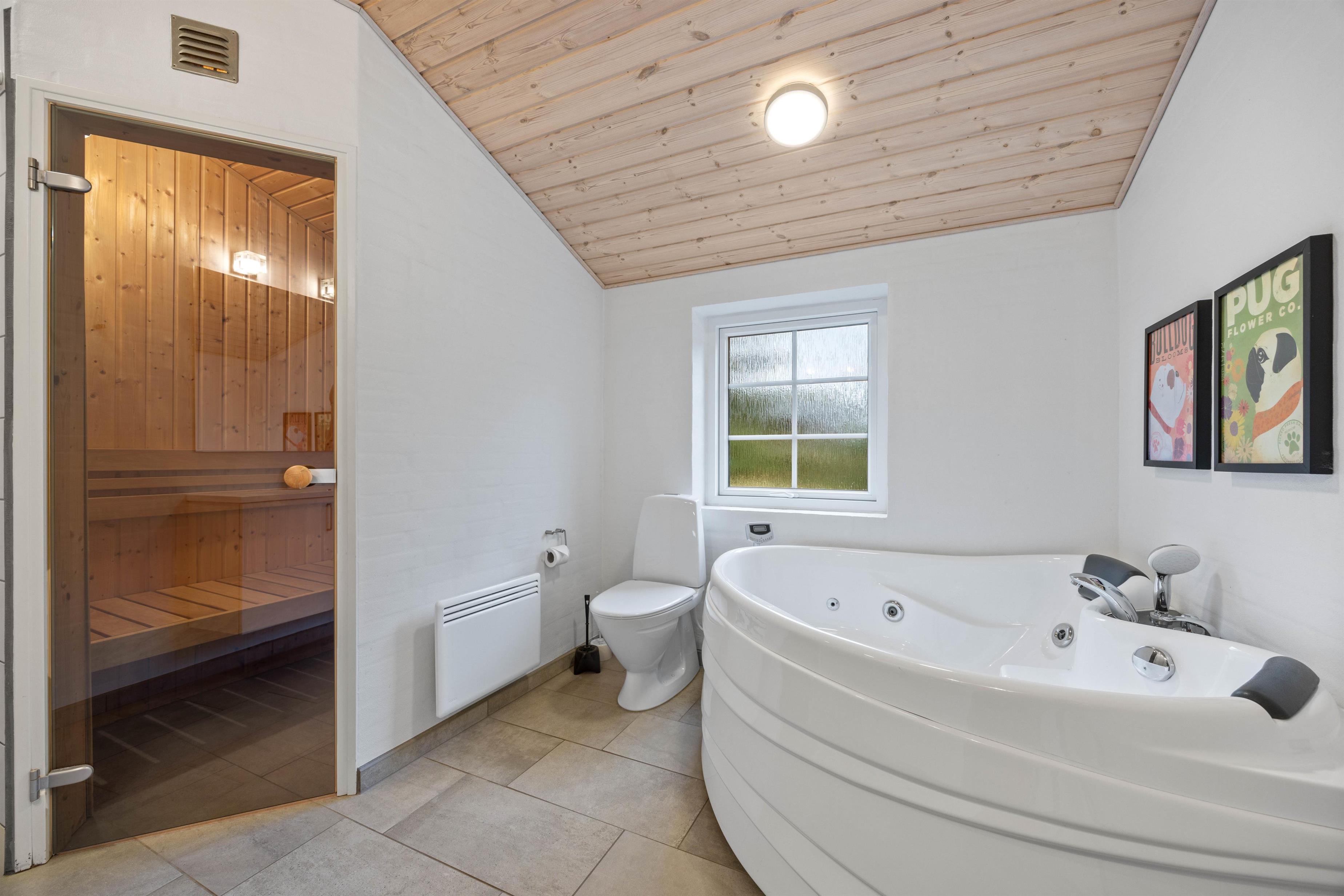 Feriehuset danner de bedste rammer om en skøn ferie, hvor du kan slappe af og nyde tiden med familien eller vennerne. Her er der lavet to rigtig dejlige badeværelser, hvilket altid er praktisk og sikrer at I undgår lange køer om morgenen. På det ene af badeværelser finder I både et spabad og en sauna, hvor I kan sætte jer godt tilrette og bare slappe helt af, mens ungerne hygger sig med et spil.