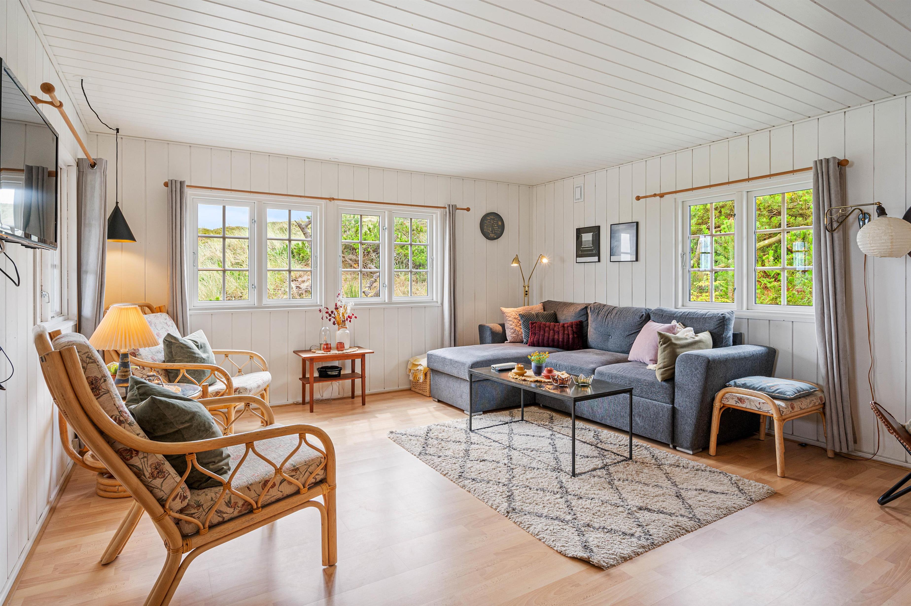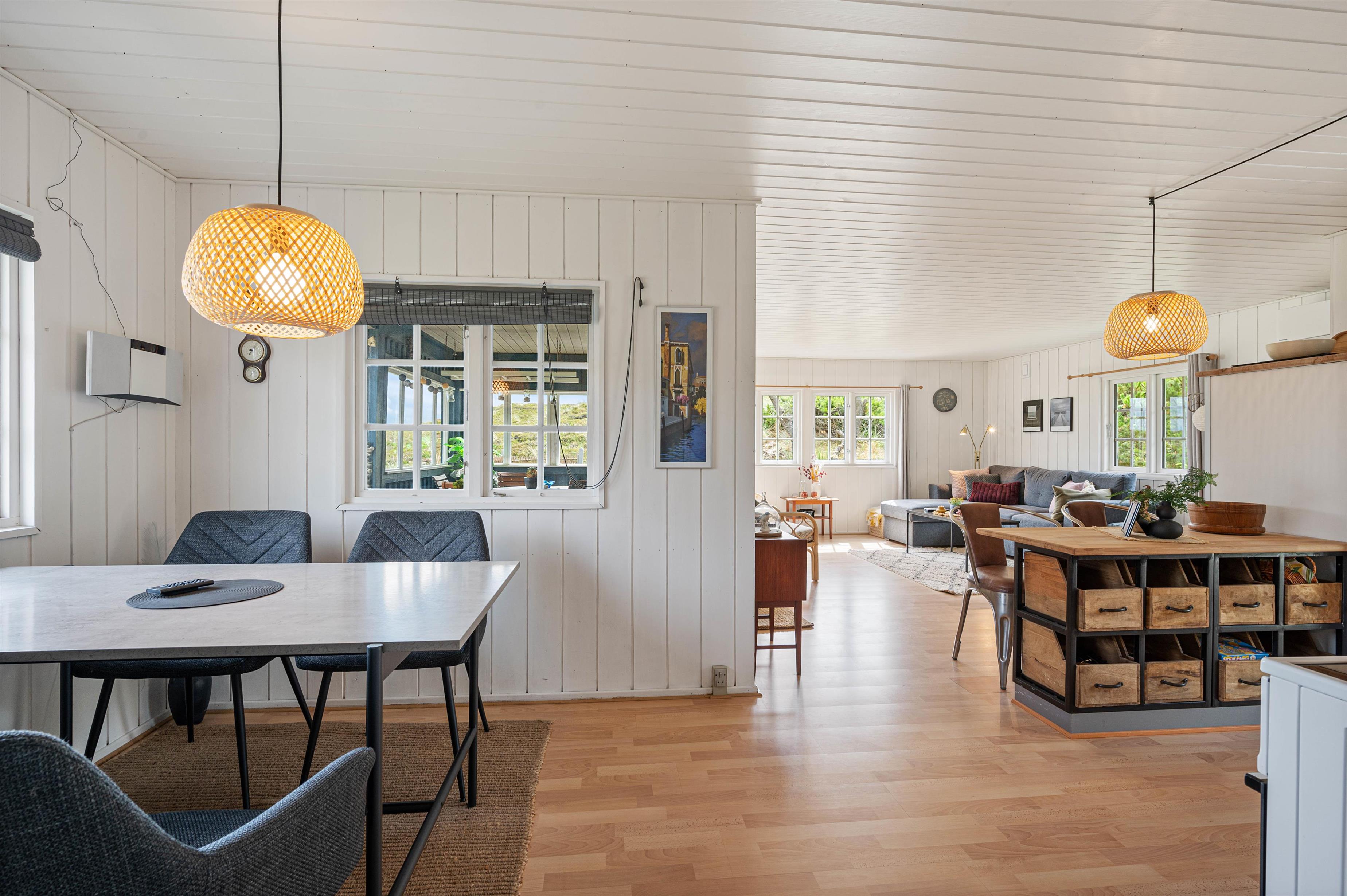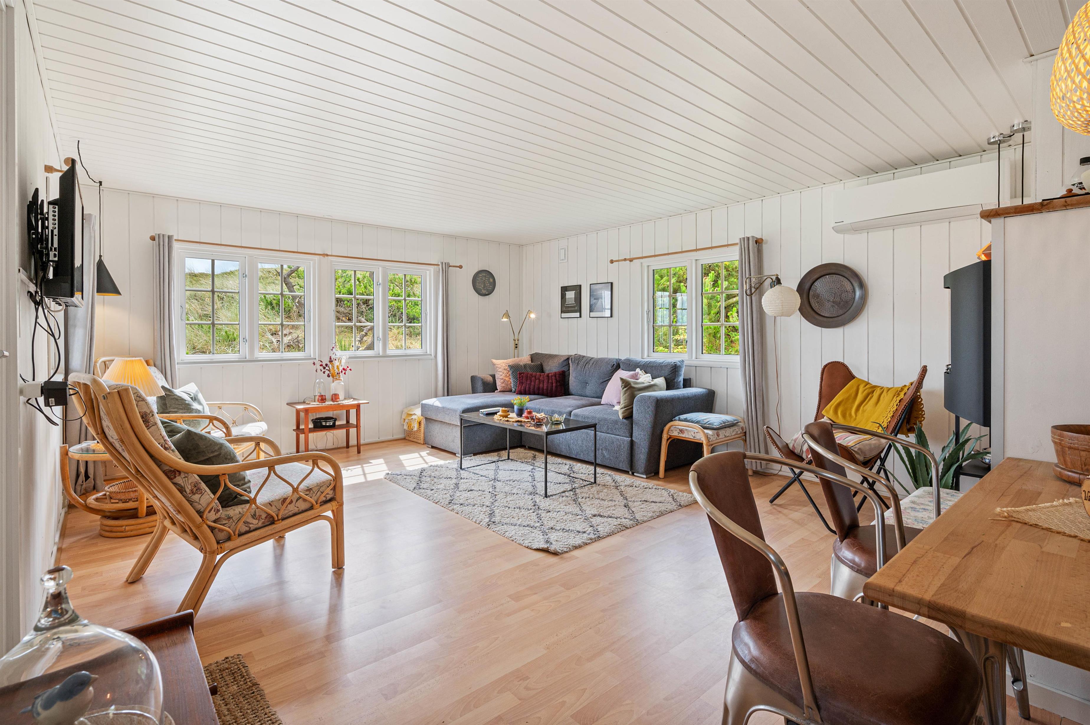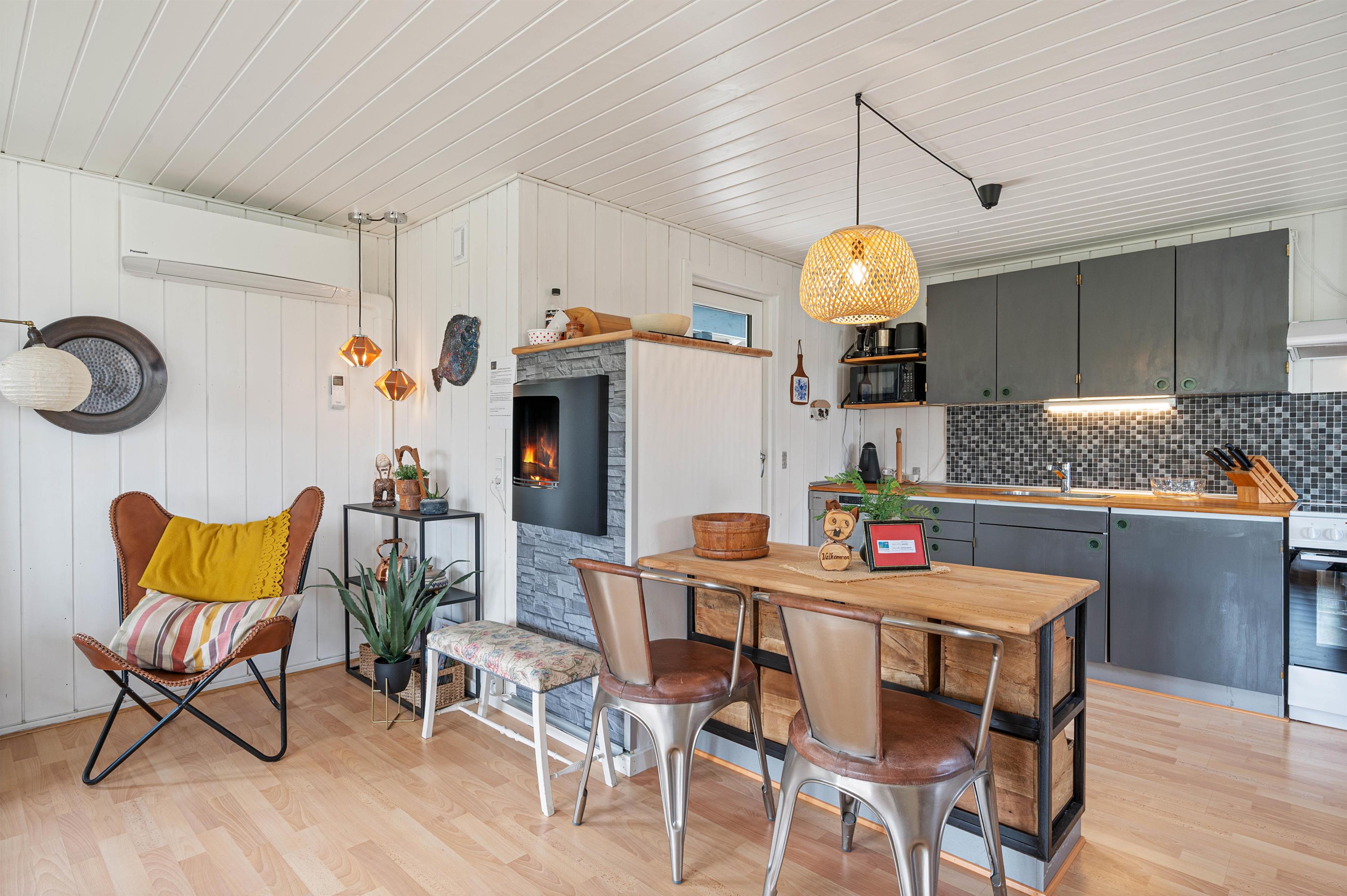 Fra entréen træder I ind i feriehusets hjerte – nemlig stuen, som ligger i åben forbindelse med køkkenalrummet. Her kan alle give en hånd med, når der skal kokkereres og dækkes op til dagens lækre feriemiddag. I stueafdelingen er der lagt i kakkelovnen til masser af kvalitetstid med filmhygge og afslapning på sofaen.