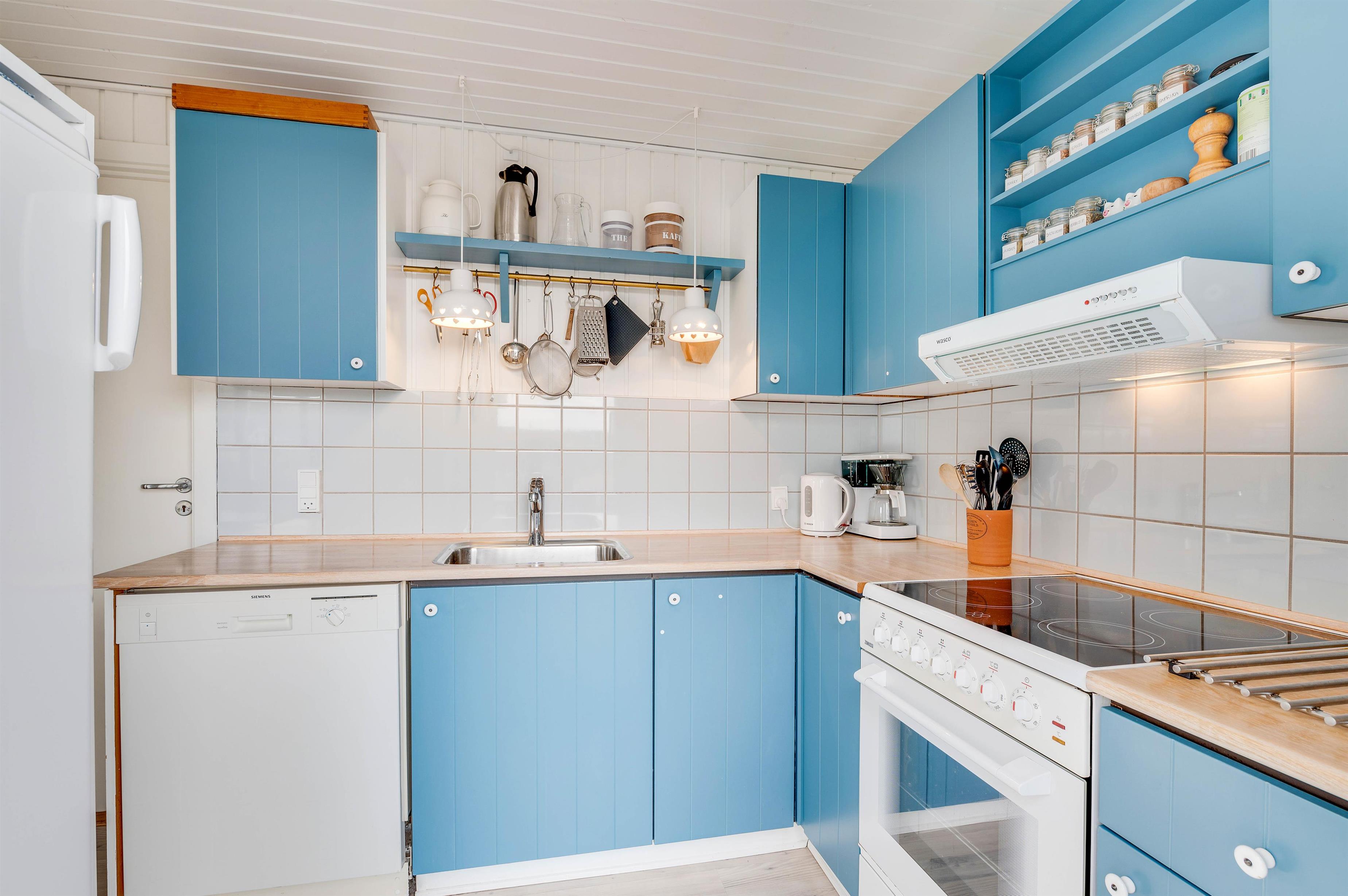 Det lille træsommerhus har en helt speciel ferieatmosfære over sig. Huset er indrettet med kærlighed, og indretningen bærer stort præg af den klassiske og charmerende sommerhusstil med lyse, afdæmpede farver og søde, personlige detaljer. Alle møblerne er nøje valgt, og den røde trød går igen i samtlige rum. Alle de hvidmalede facader giver rummene en dejlig fornemmelse, mens der sammentidig er skabt et fedt farvemodspil med de pæne blå skabsfronter i køkkenet og værelset, der er med til at give huset det personlige præg.