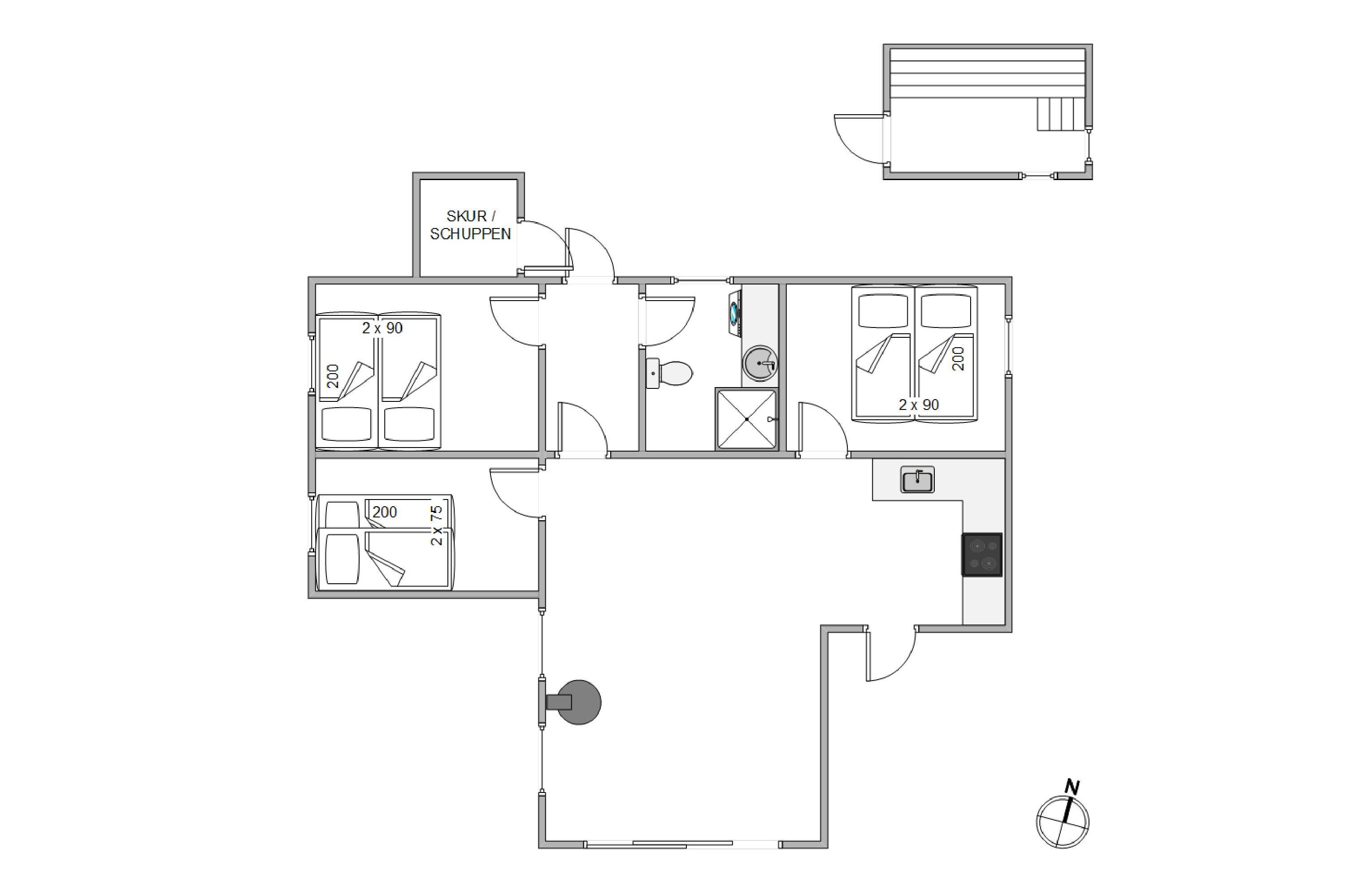 Feriehuset har en skøn, delvist overdækket træterrasse, som går halvvejs rundt om huset med siddepladser både på øst- og vestsiden, så I kan følge solen dagen lang. Der er masser af hyggelige kroge, hvor I kan sidde i ro og fred med en god bog og en friskbrygget kop kaffe.