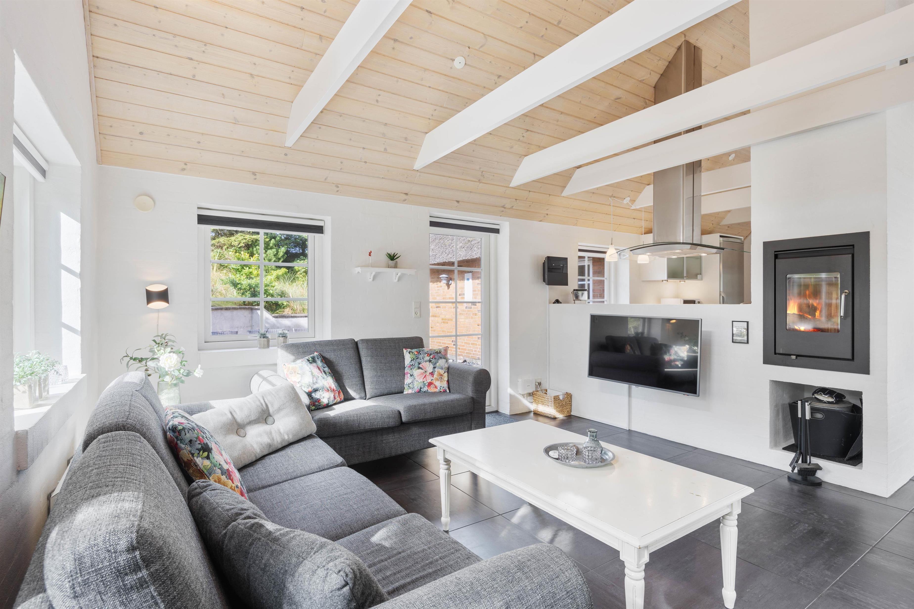 I dette feriehus føler man sig straks hjemme, og det er et sted, man har lyst til at opholde sig og tilbringe en dejlig tid med familien. Der er gjort meget ud af indretningen, så ikke alene er huset flot, det er også rigtigt hyggeligt. Inden i stuen er loftet ført helt op til kip, og her er fritliggende loftsbjælker, der både giver indretningen et lækkert twist og selve rummet en dejlig rumfornemmelse. Stue, køkken og spisestue ligger i åben forbindelse med hinanden, og her kan hele familien være samlet, mens der er tændt op i brændeovnen, så varmen og hyggen, der strømmer ud i rummet rigtig kan nydes.