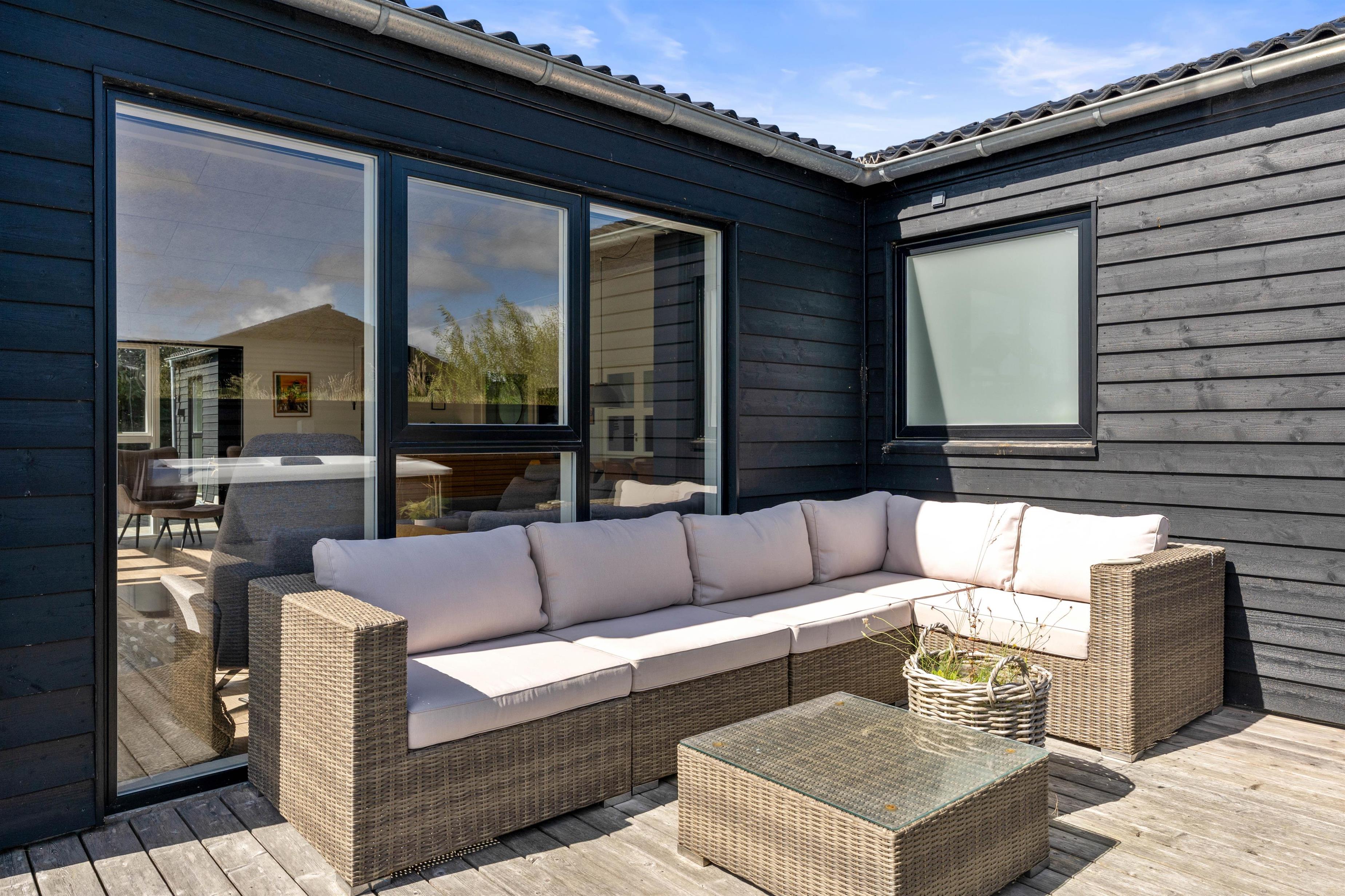Sommerhuset byder på et dejligt udeområde med en stor terrasse, der er delvist afskærmet og overdækket, samt en selvstændig overdækket terrasse. Her er der god mulighed for at finde en plads i enten sol eller skygge, alt efter hvad I foretrækker, hvor I kan sætte jer til rette i havemøbler og liggestole.