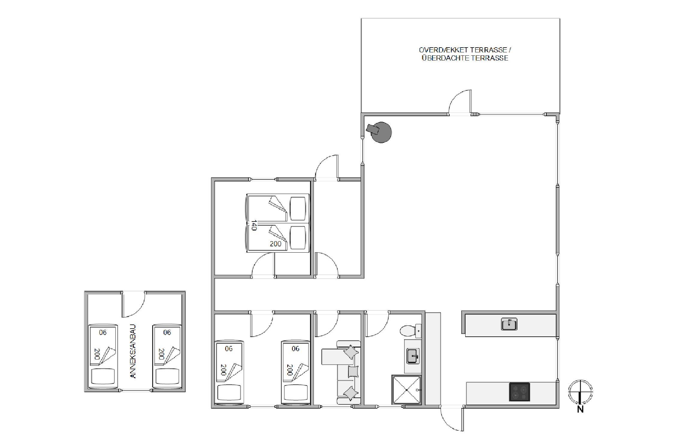 Huset råder over 6 sengepladser fordelt på 3 værelser, hvoraf ét værelse udgøres af det dejlige anneks på grunden. Herudover er der et mindre værelse, der er indrettet med en sovesofa. Sommerhusets badeværelse er flot og lyst med bruseniche og gulvvarme.