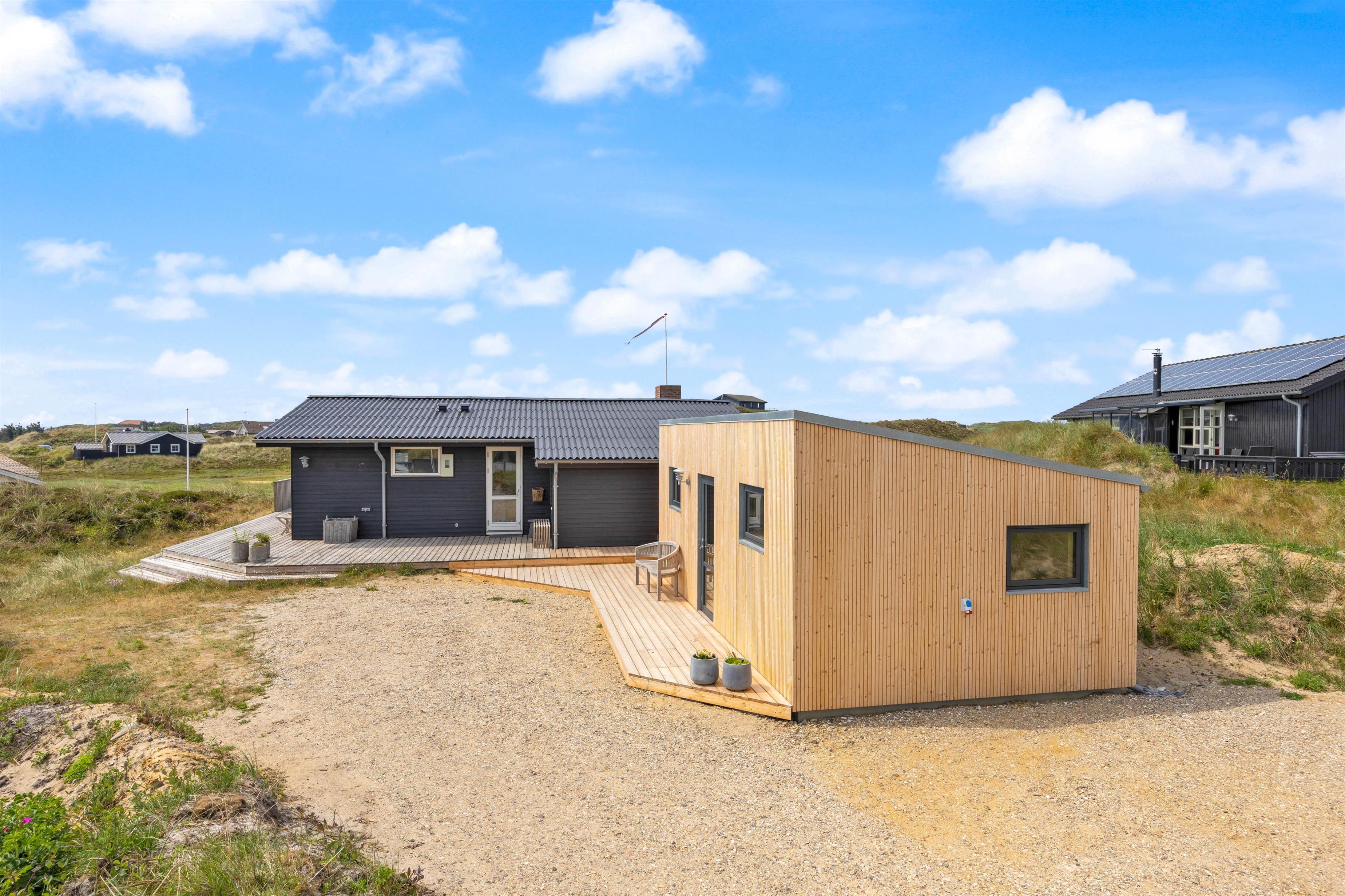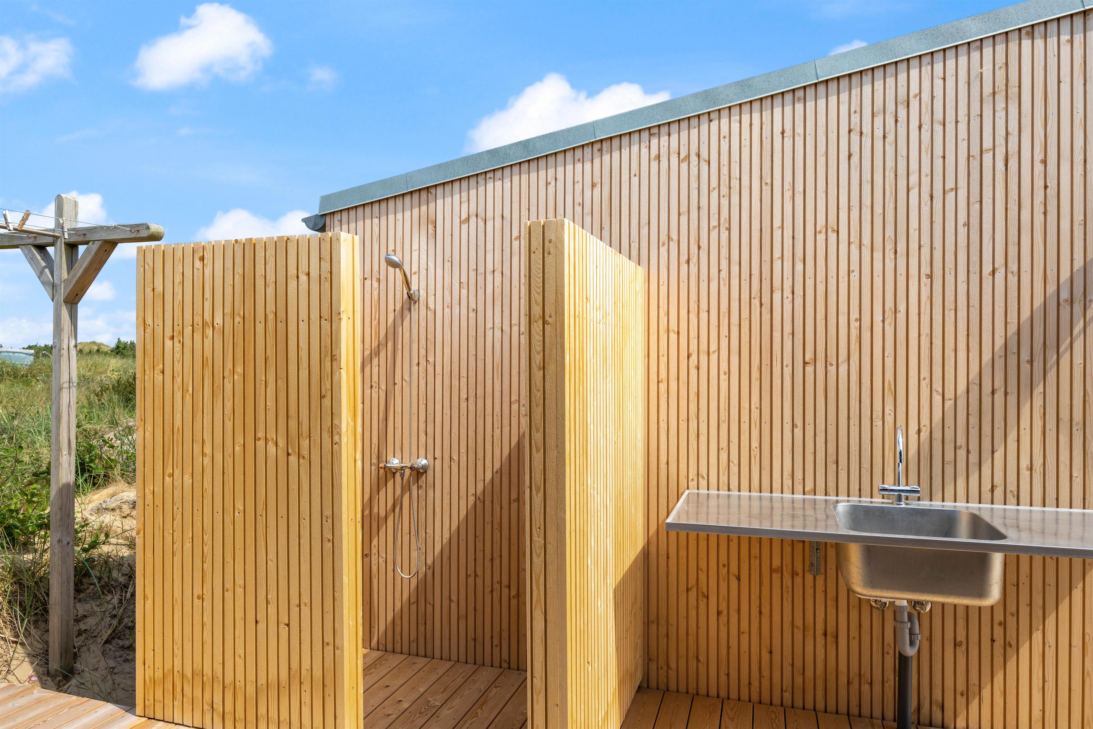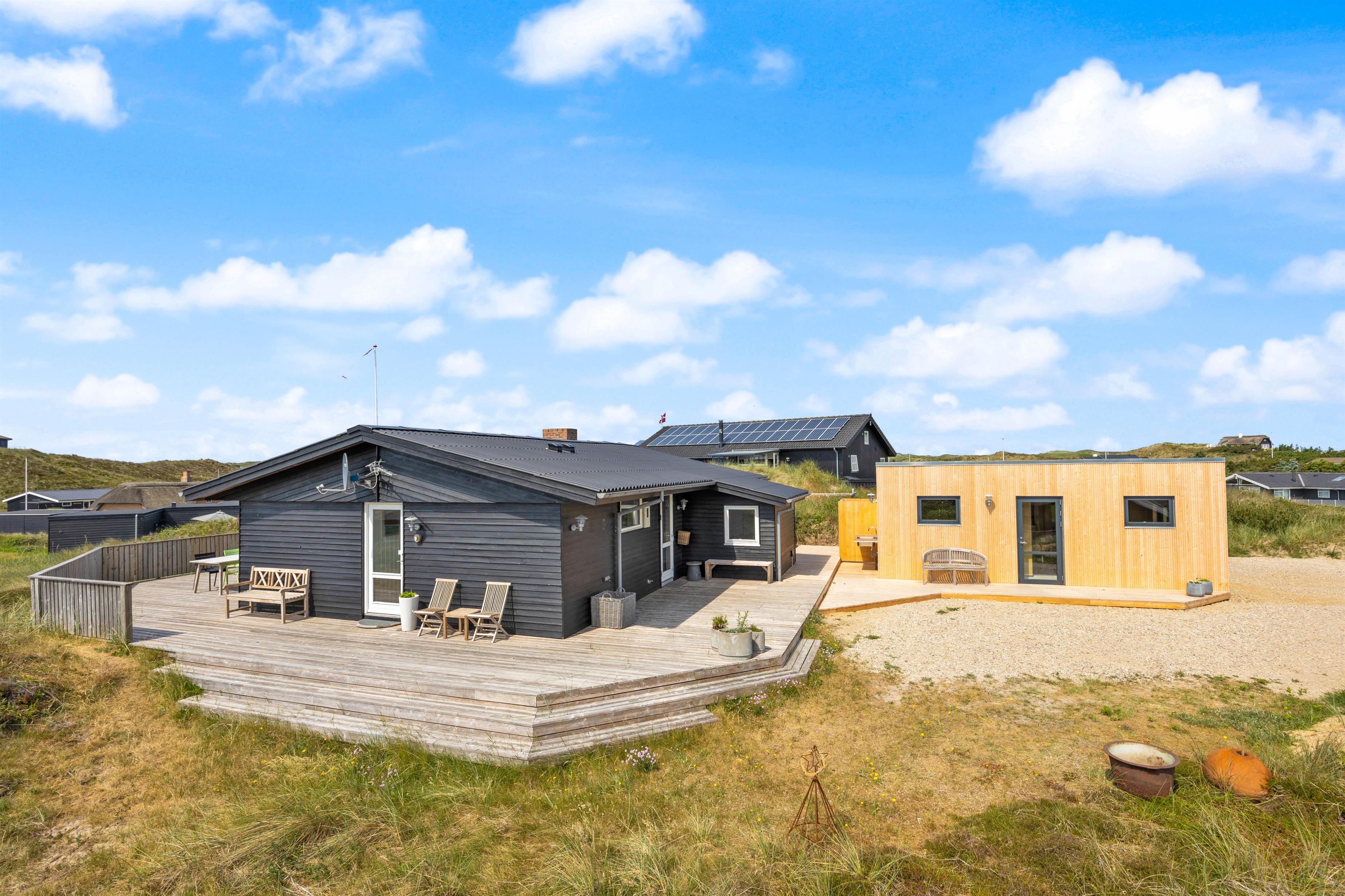 Fra stuen har I udgang til en dejlig afskærmet træterrasse med havemøbler, liggestole og grill. På de varmere og solskinsrige dage, har I mulighed for at tilberede et lækkert aftensmåltid ved feriehusets lille udekøkke. Feriehuset ligger på en rigtig flot naturgrund med svejende marehalm og bølgende klittoppe i baggrunden. Terrassen er perfekt til afslapning på langs med dagens avis, en god bog eller måske bare til lyden af landskabet. Der er også etableret en udebruser og et lille udekøkken ved annekset. Her har I mulighed for at hygge jer med madlavning i det fri efter en dejlig lang feriedag.