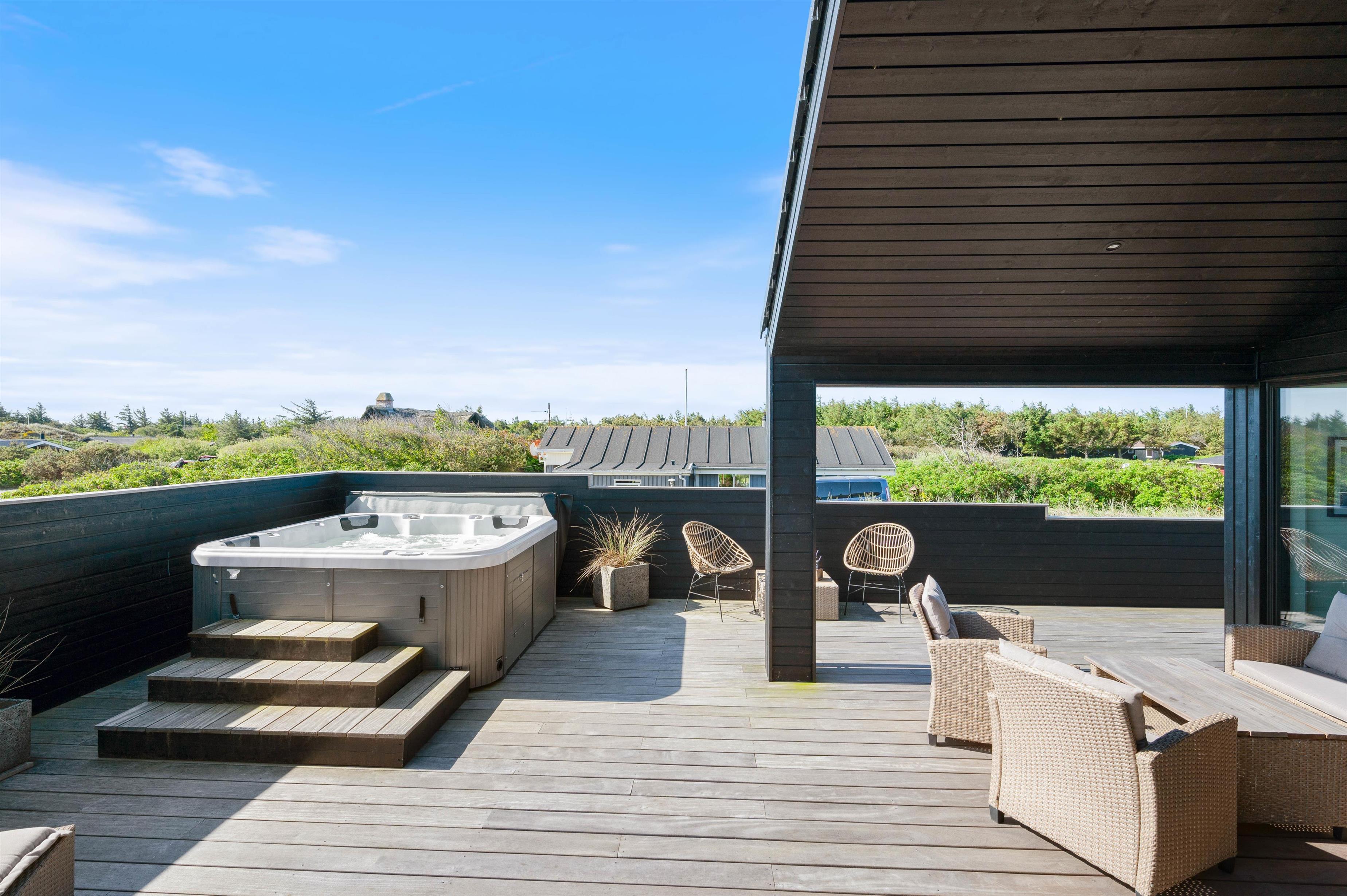 Rundt om feriehuset løber en stor, lukket terrasse med delvis overdækning og afskærmning. Her kan I rigtigt nyde de naturskønne omgivelser, og skal der skrues ekstra op for wellness-fornemmelsen, kan I tænde op i det lækre udendørs spabad. Den afslappende session i udespaen kan passende nydes med et koldt glas rosévin ved siden af, takket være feriehusets vinkøleskab.