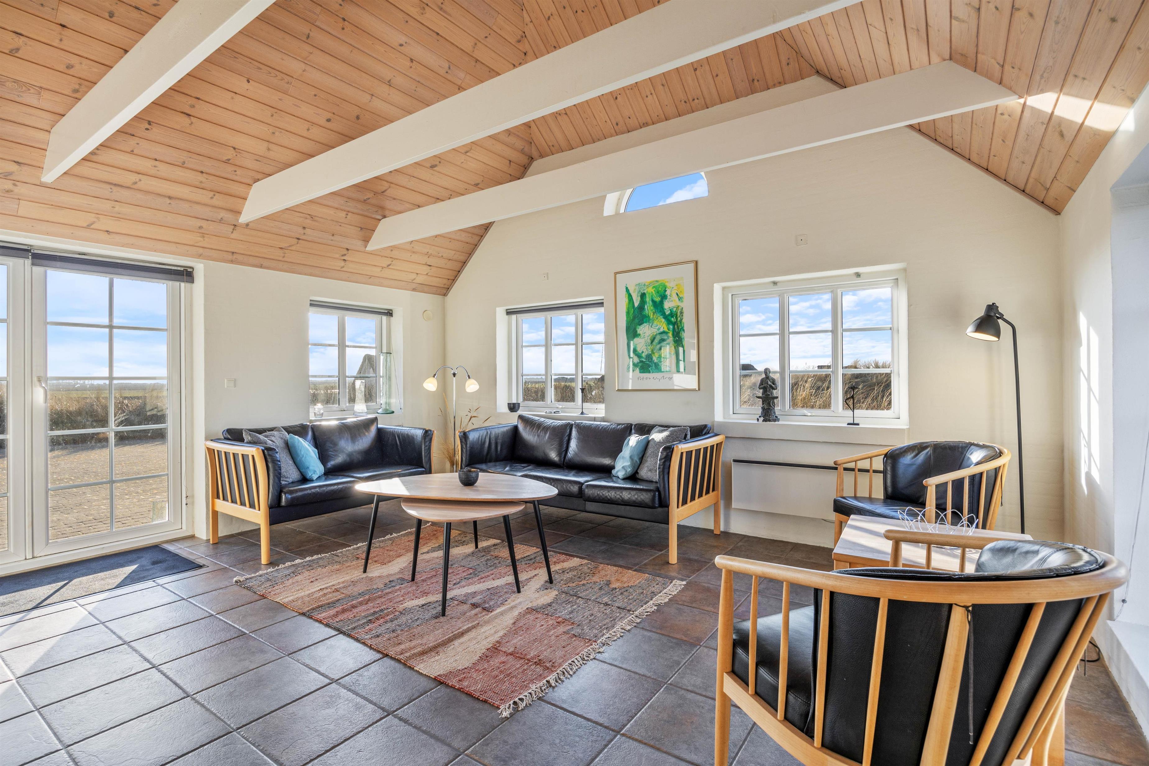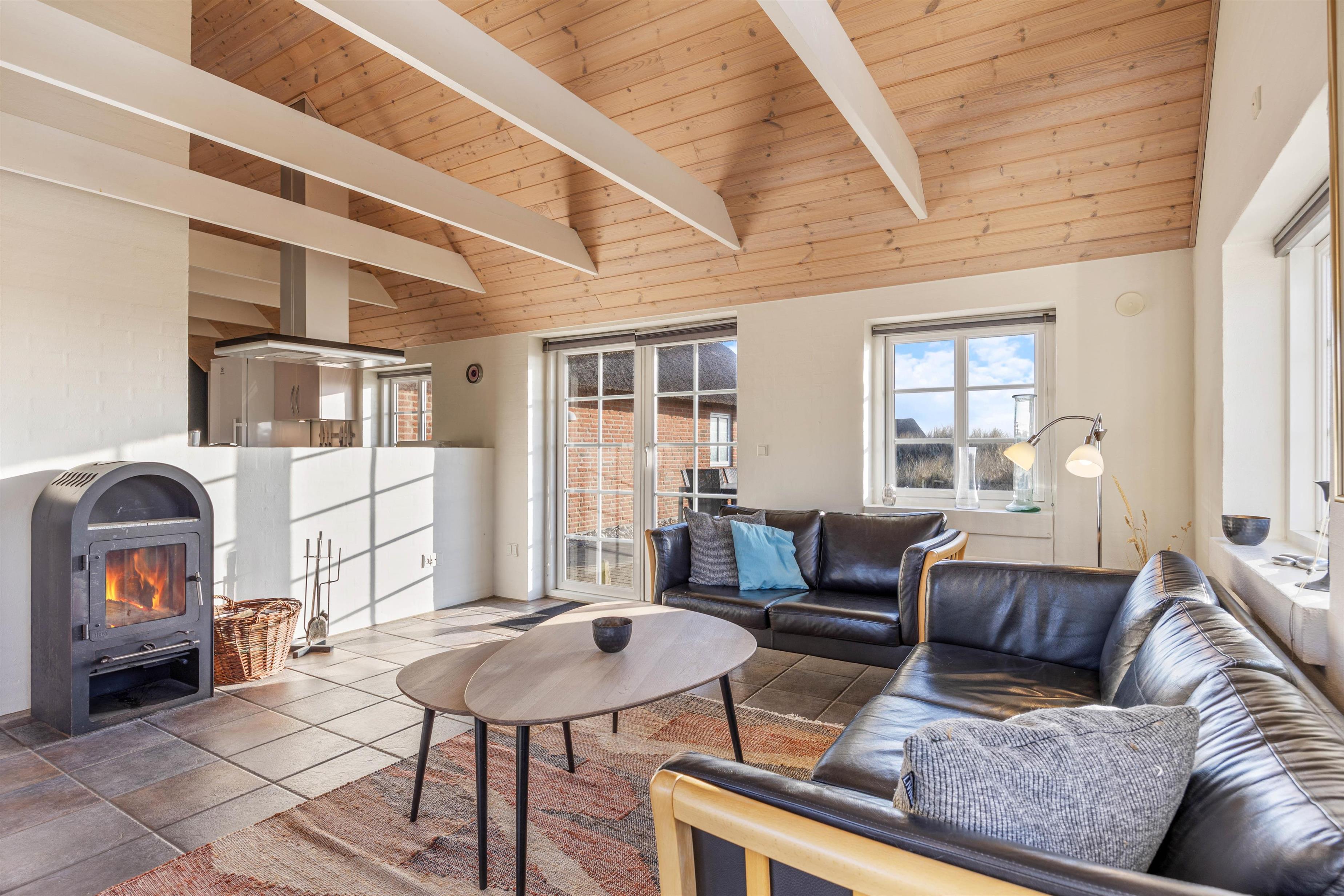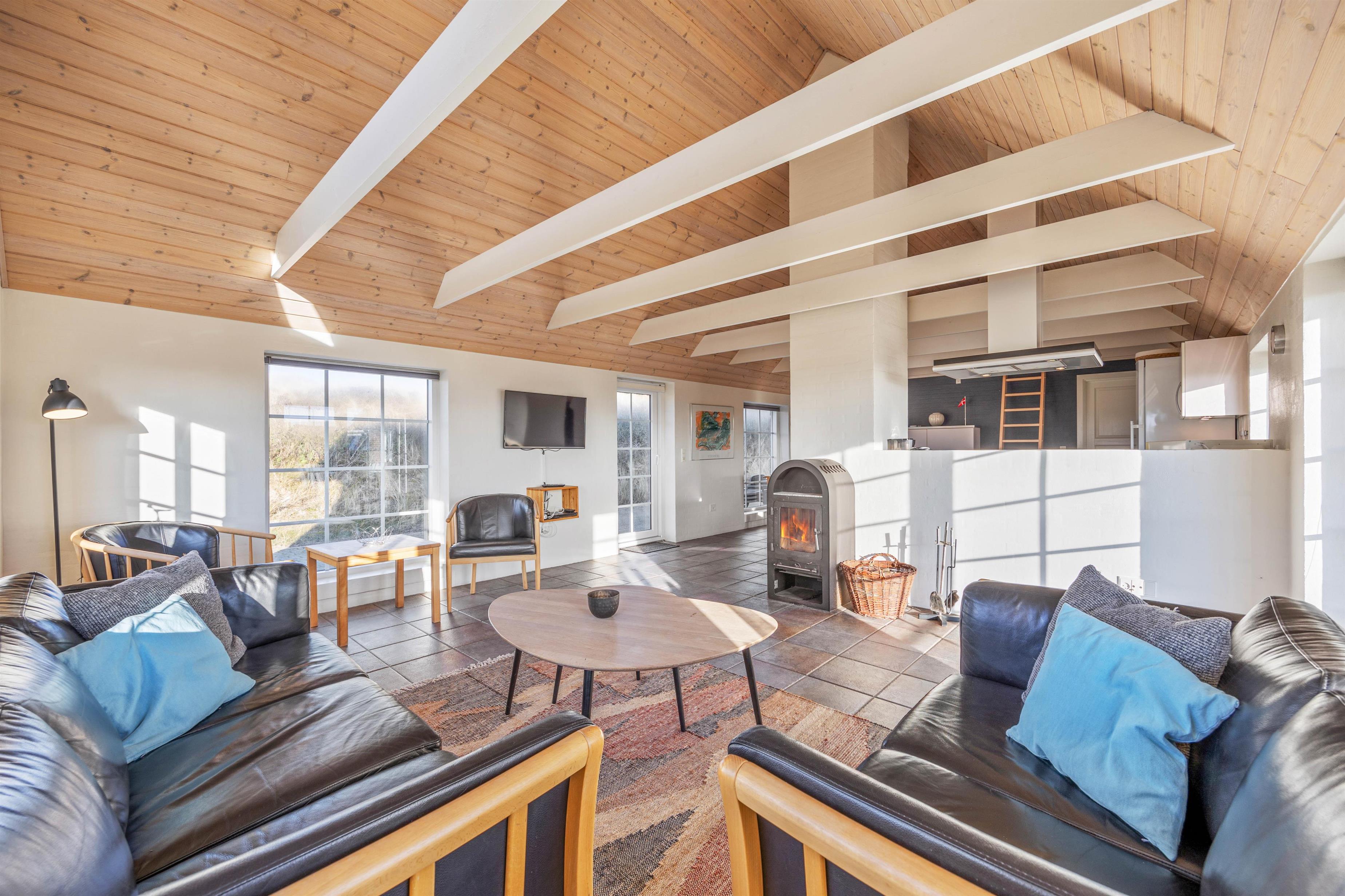 Der er naturligvis også en dejlig stue, hvor I kan sætte jer godt til rette og se en film og eventuelt tænde op i brændeovnen. I hele opholdsrummet er der loft til kip og synlige loftsbjælker, hvilket skaber en dejlig luft om ørene og en god rummelighed.