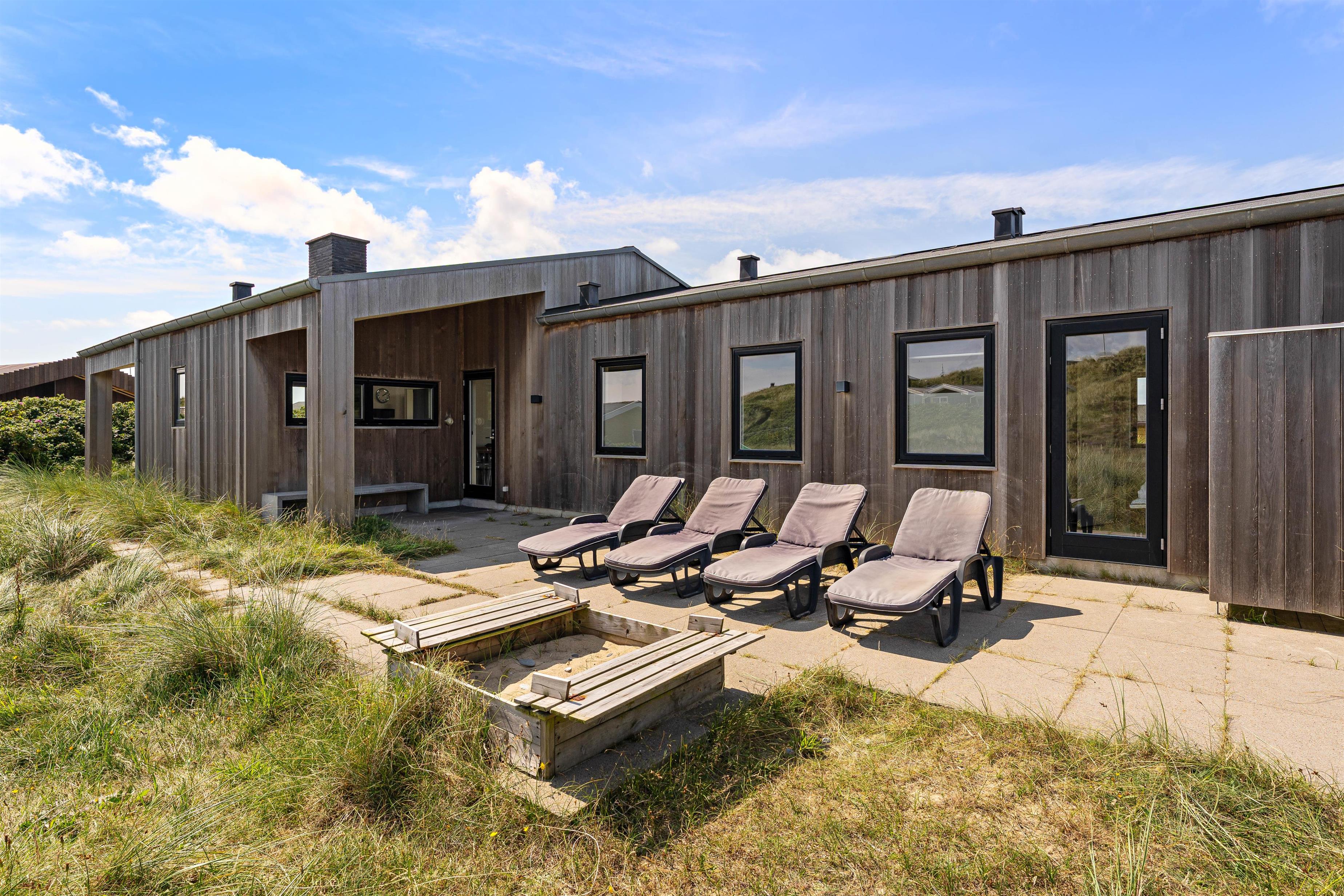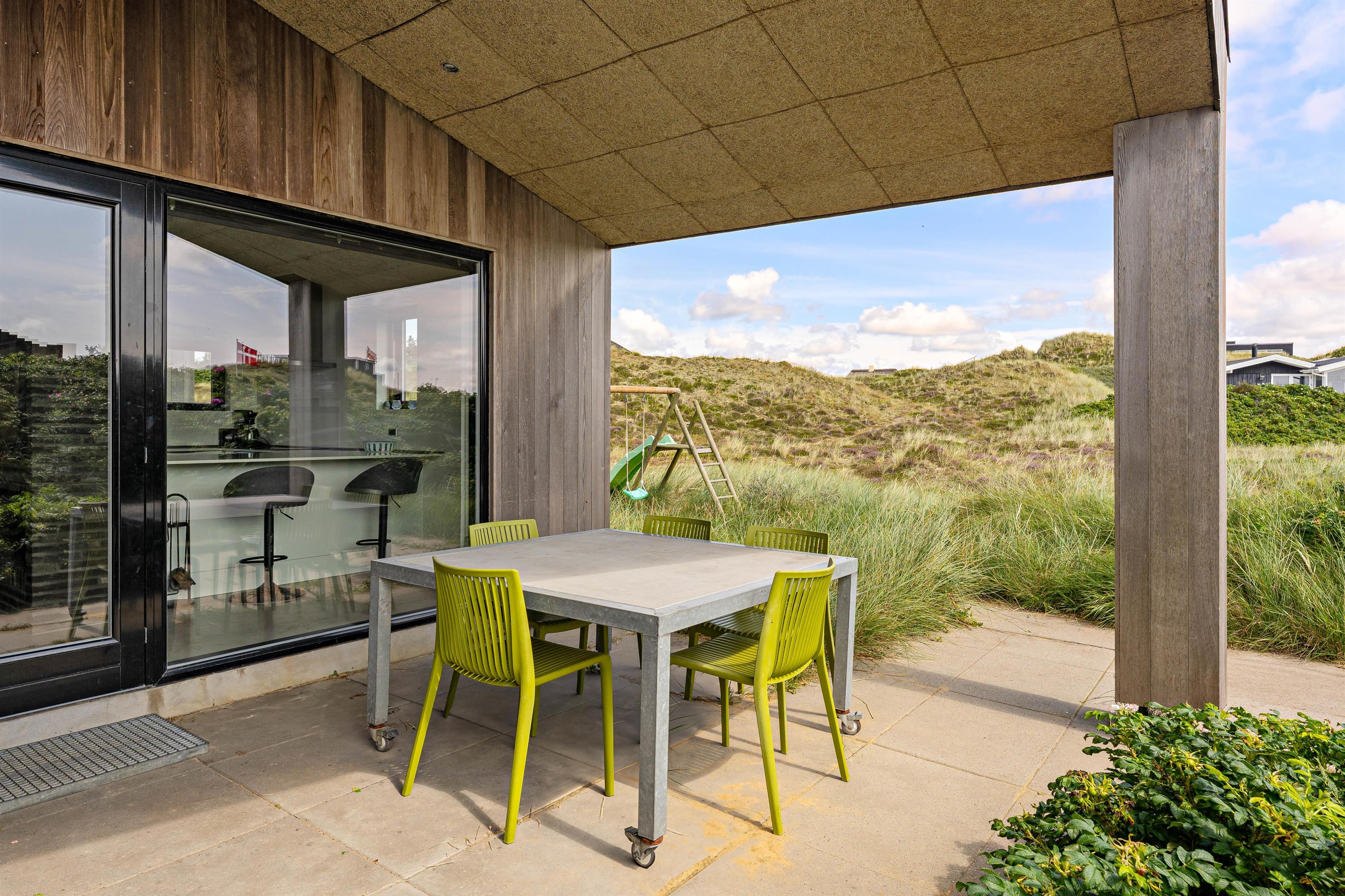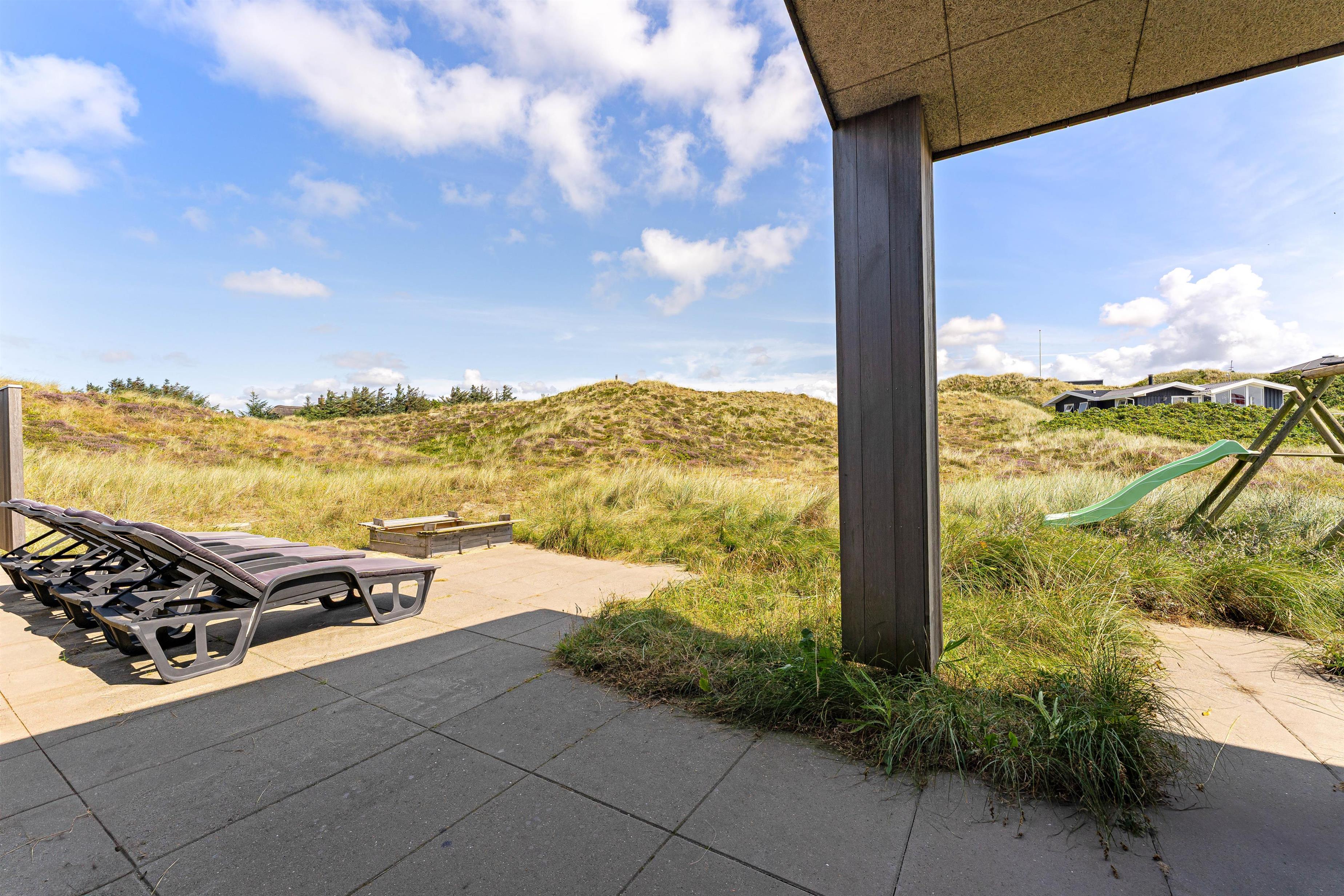 På de 3 overdækkede terrasser er der indbygget spot til belysning på de lune aftener. I har altid mulighed for læ, sol, skygge eller ugenerthed, gode havemøbler, som solvogne og en stor grill er en selvfølge. Den store åbne fliseterrasse, med klitlandskabet helt op imod, sørger for god plads til hele familien, hundene mv. Her findes også gynge med rutsjebane, sandkasse mv.