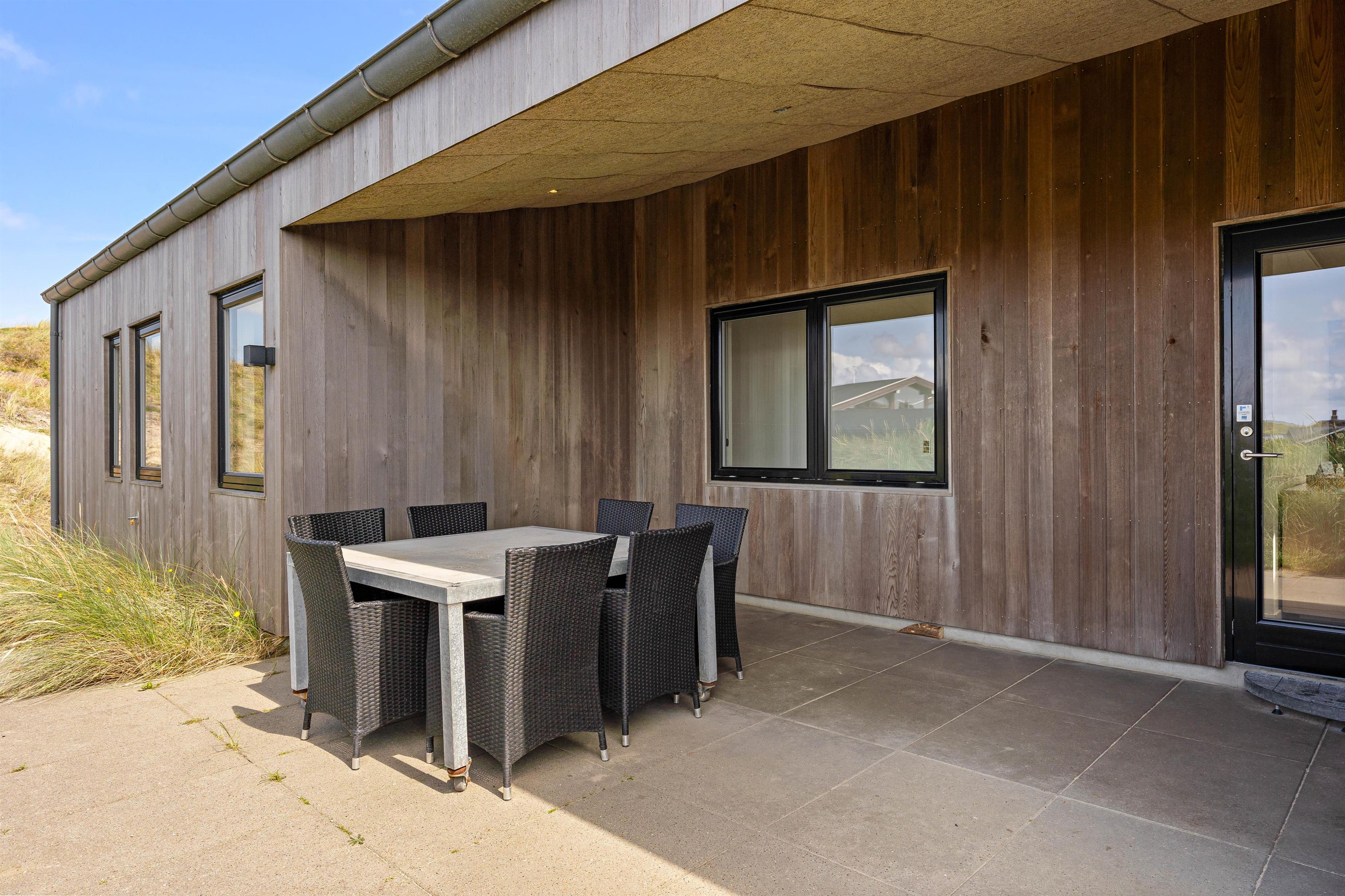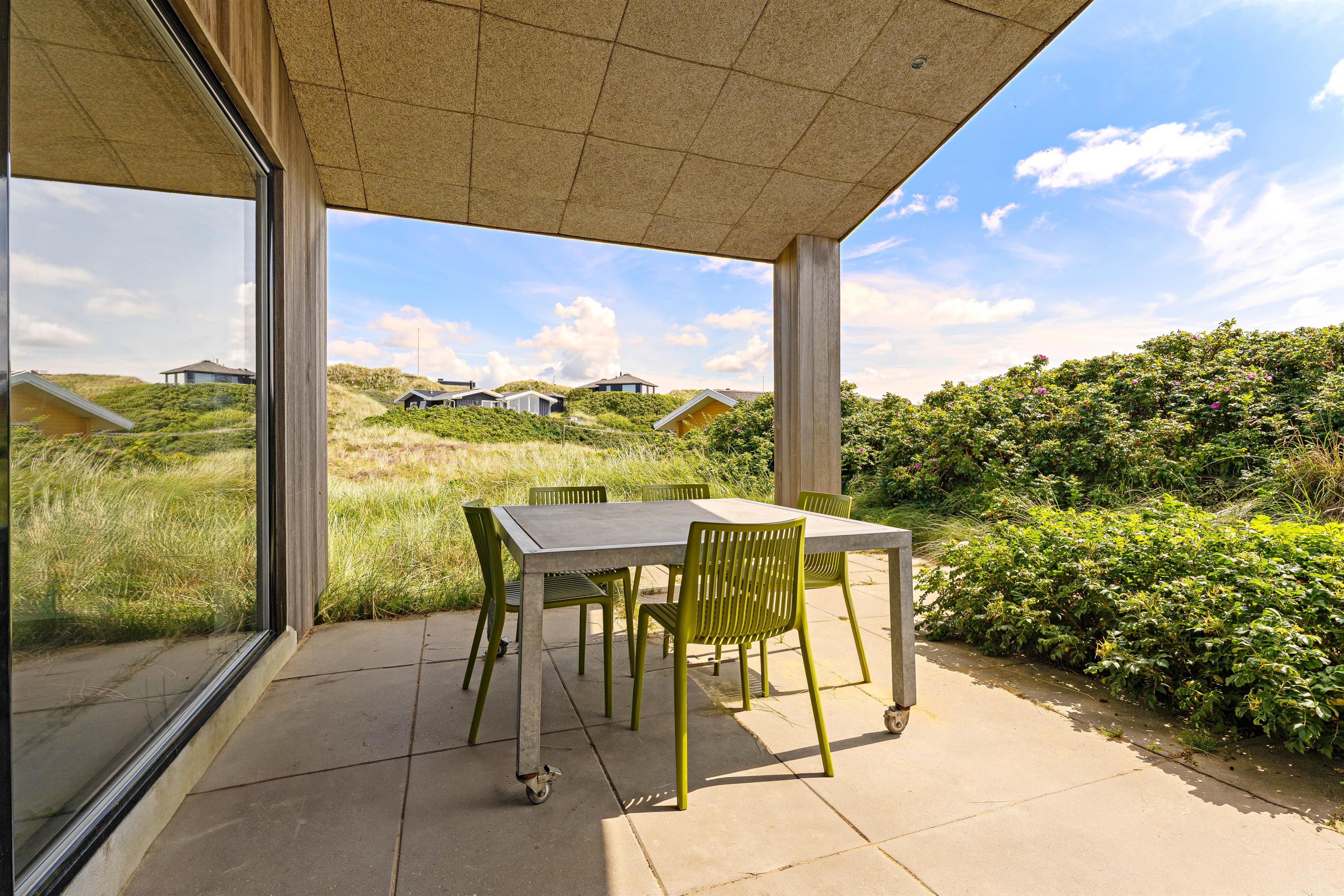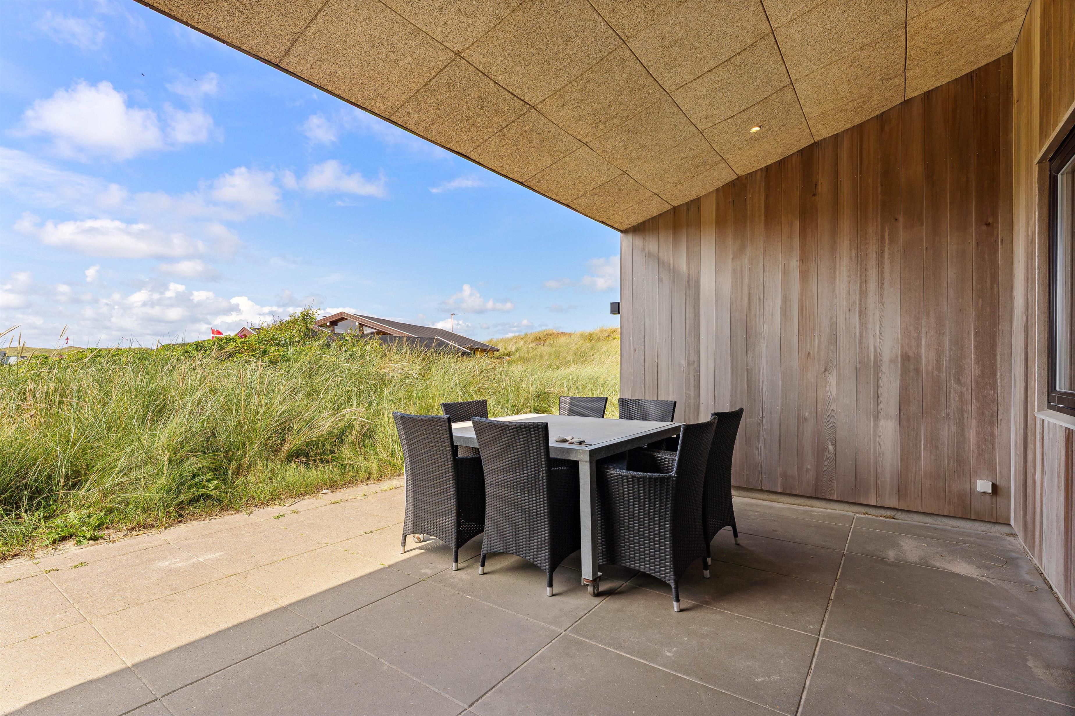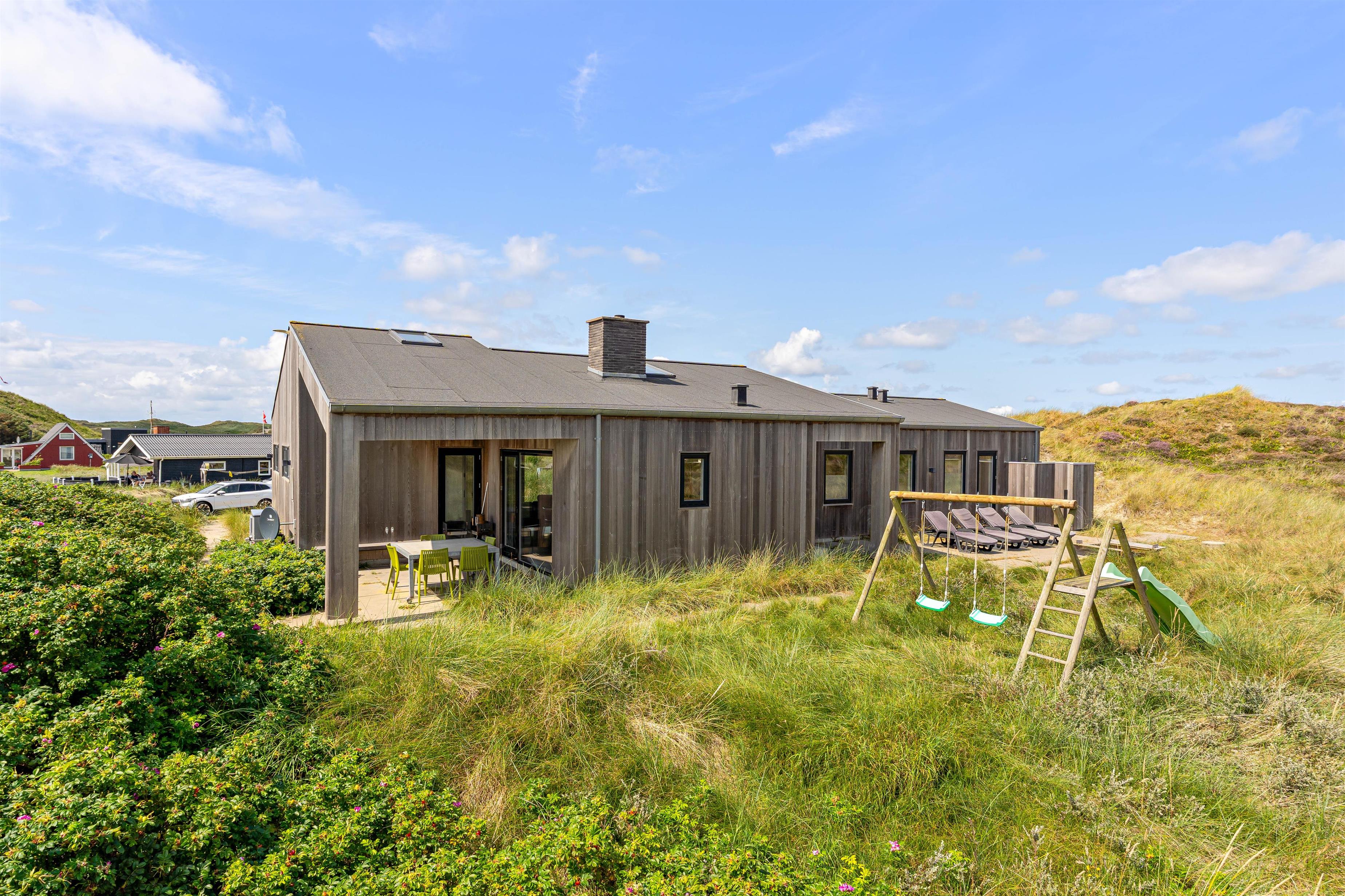 På de 3 overdækkede terrasser er der indbygget spot til belysning på de lune aftener. I har altid mulighed for læ, sol, skygge eller ugenerthed, gode havemøbler, som solvogne og en stor grill er en selvfølge. Den store åbne fliseterrasse, med klitlandskabet helt op imod, sørger for god plads til hele familien, hundene mv. Her findes også gynge med rutsjebane, sandkasse mv.