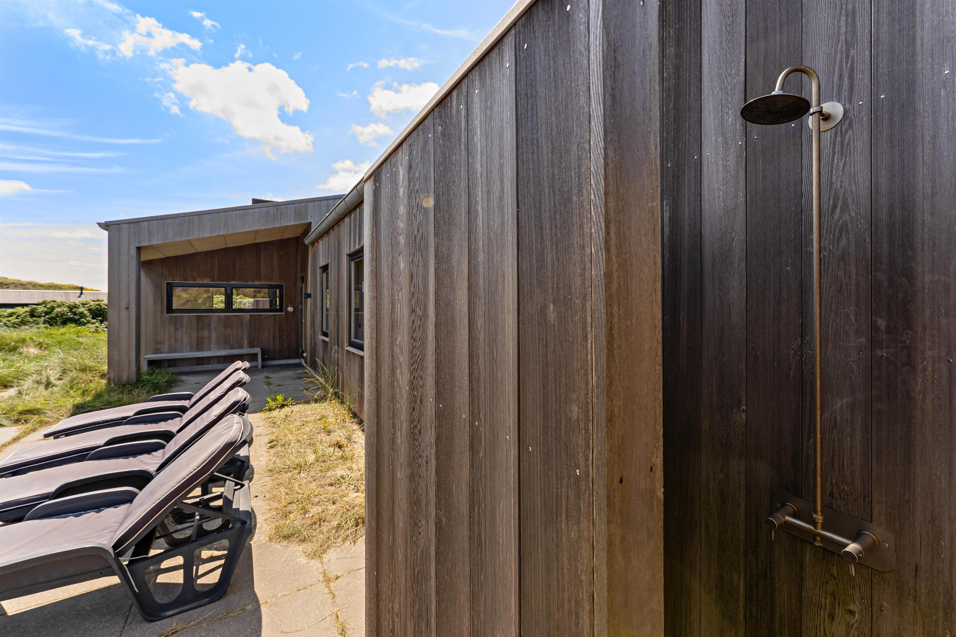 Kun 350 meter fra det flotte hus finder I den skønne brede sandstrand, som er en oplevelse hele året rundt. I sommertiden, når I kommer hjem med sand mellem tæerne, kan I skylle fødderne under husets udebruser på terrassen. Udebruseren kan benyttes i perioden april til november.