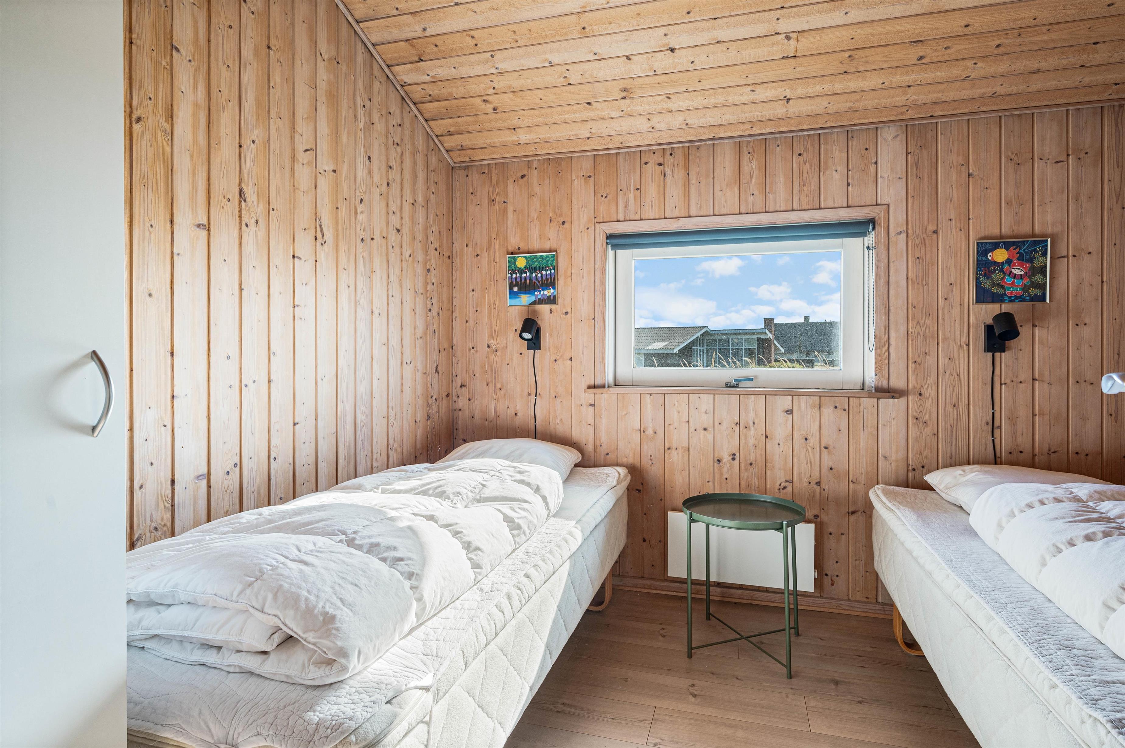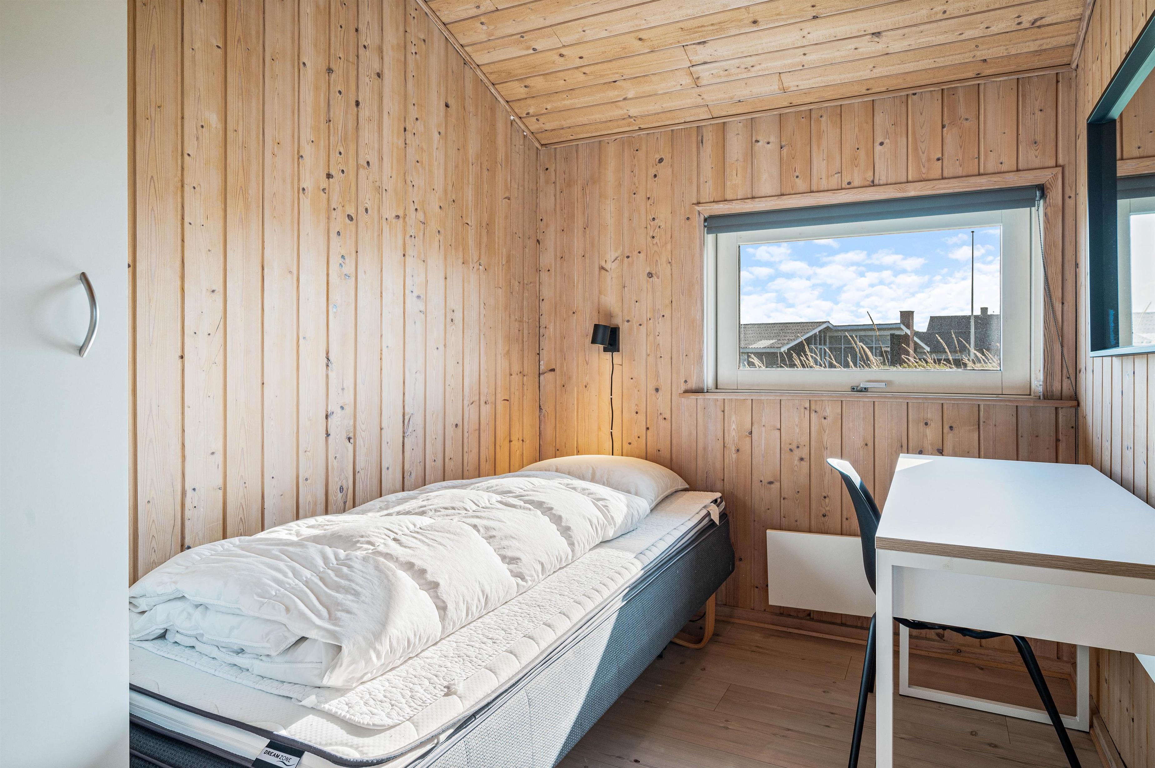 Her er tale om et dejligt feriehus med en klassisk indretning med vægge beklædt med træpaneler. Selve sommerhuset fordeler sig på 4 gode soveværelser; 2 værelser med dobbeltsenge, 1 med enkeltsenge samt yderligere 1 værelse med en enkelt seng. Køkken og spisestue ligger i åben, direkte forbindelse, så alle kan følge med i madlavningen. Efter en lang spadseretur i den Jyske natur er det oplagt med lidt selvforkælelse i husets badekar og udesauna. Her kan I rigtig sidde og få ladet jeres batterier op.