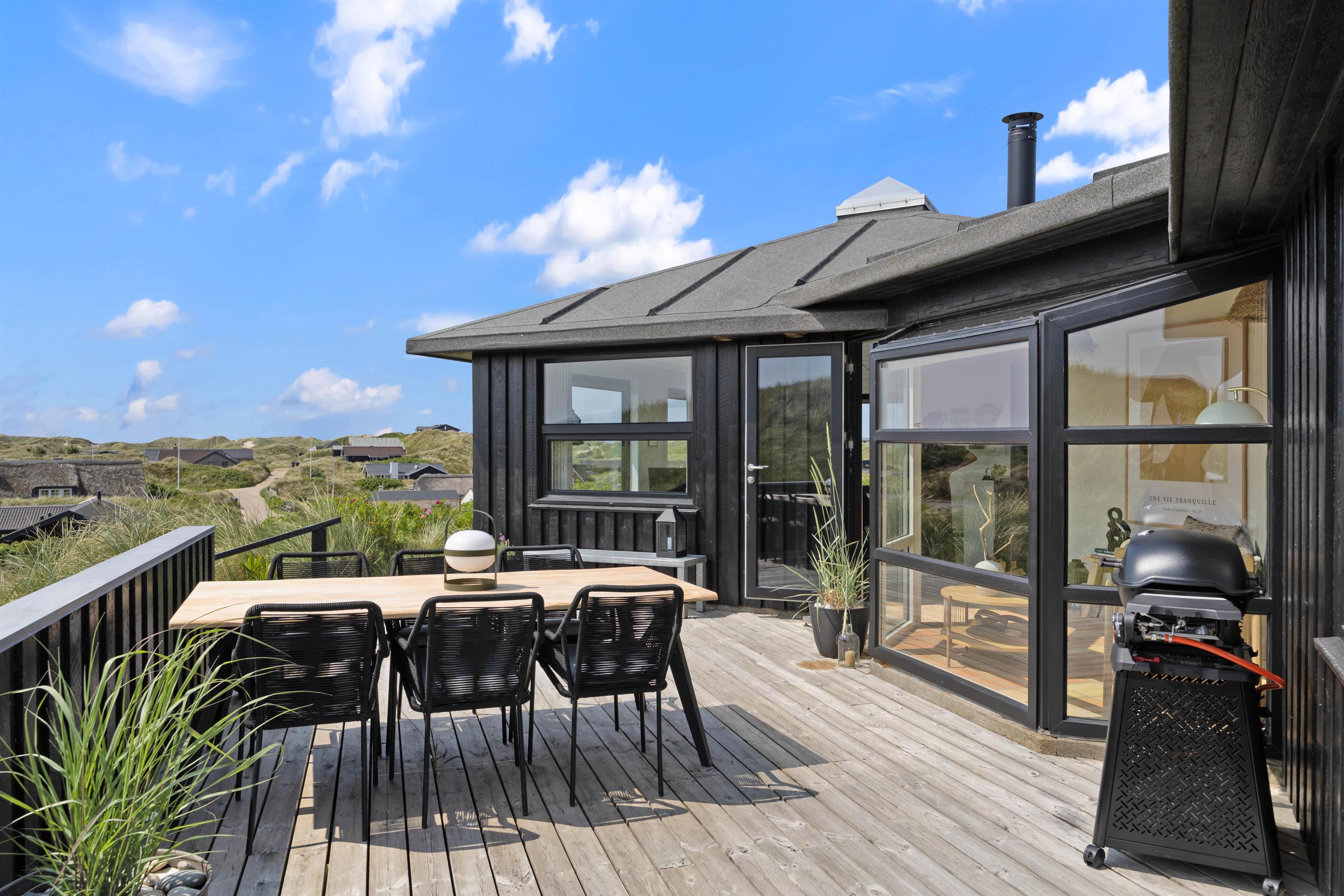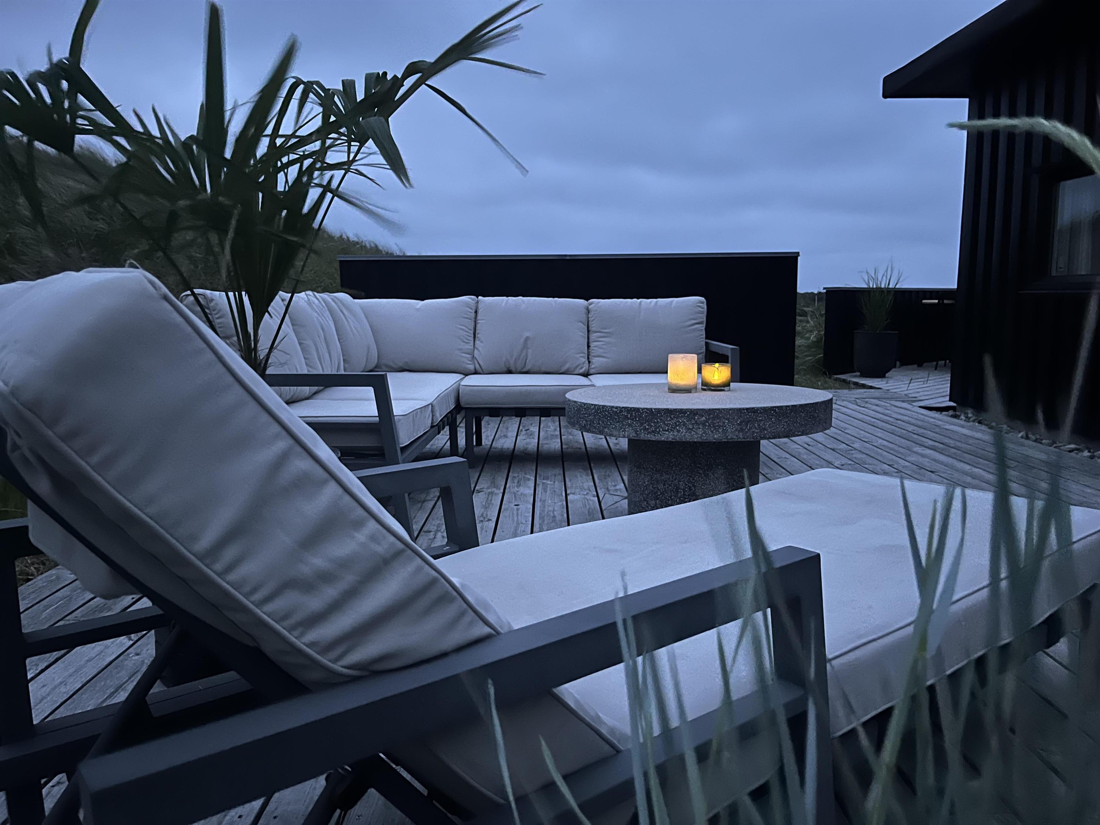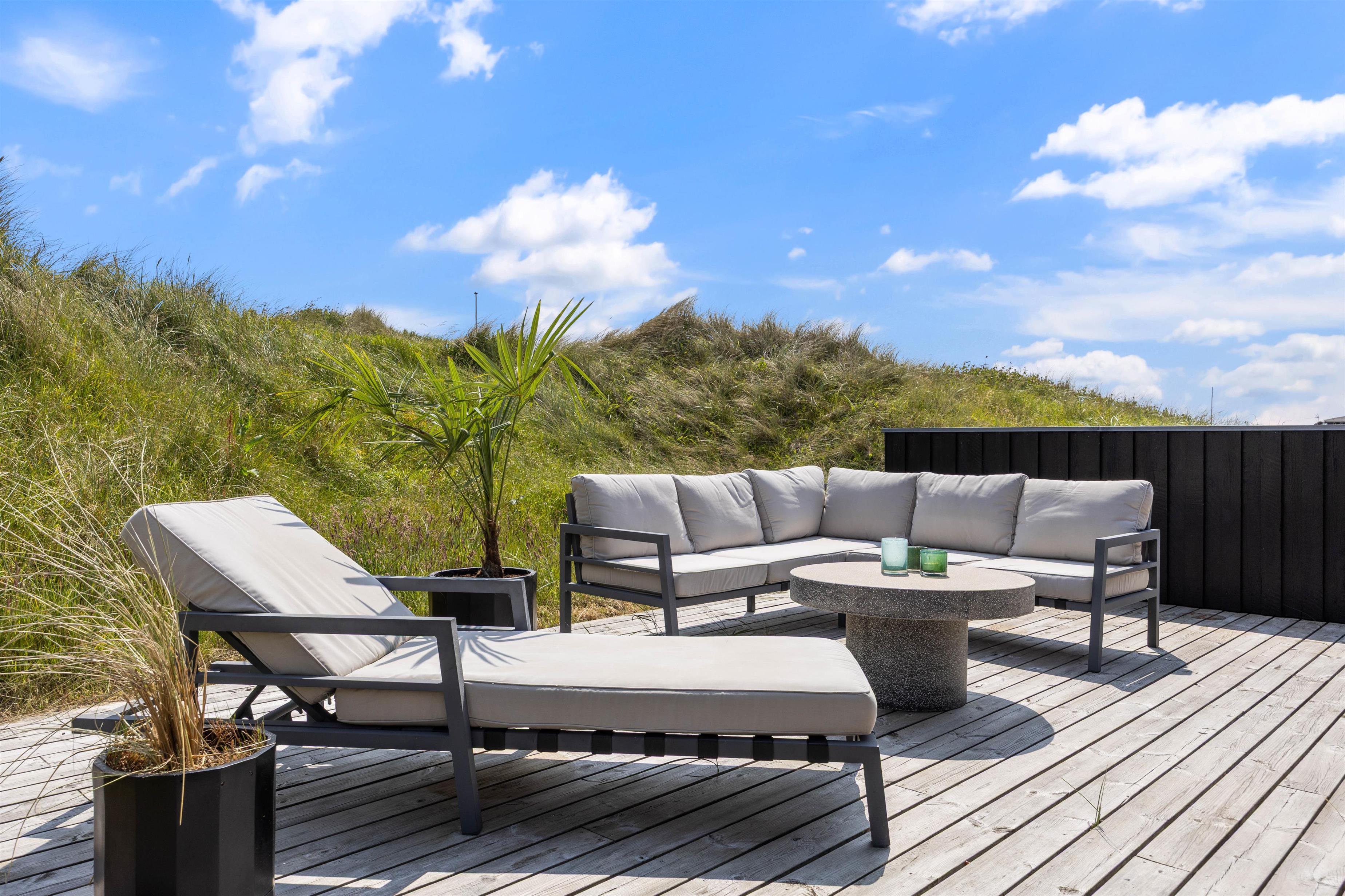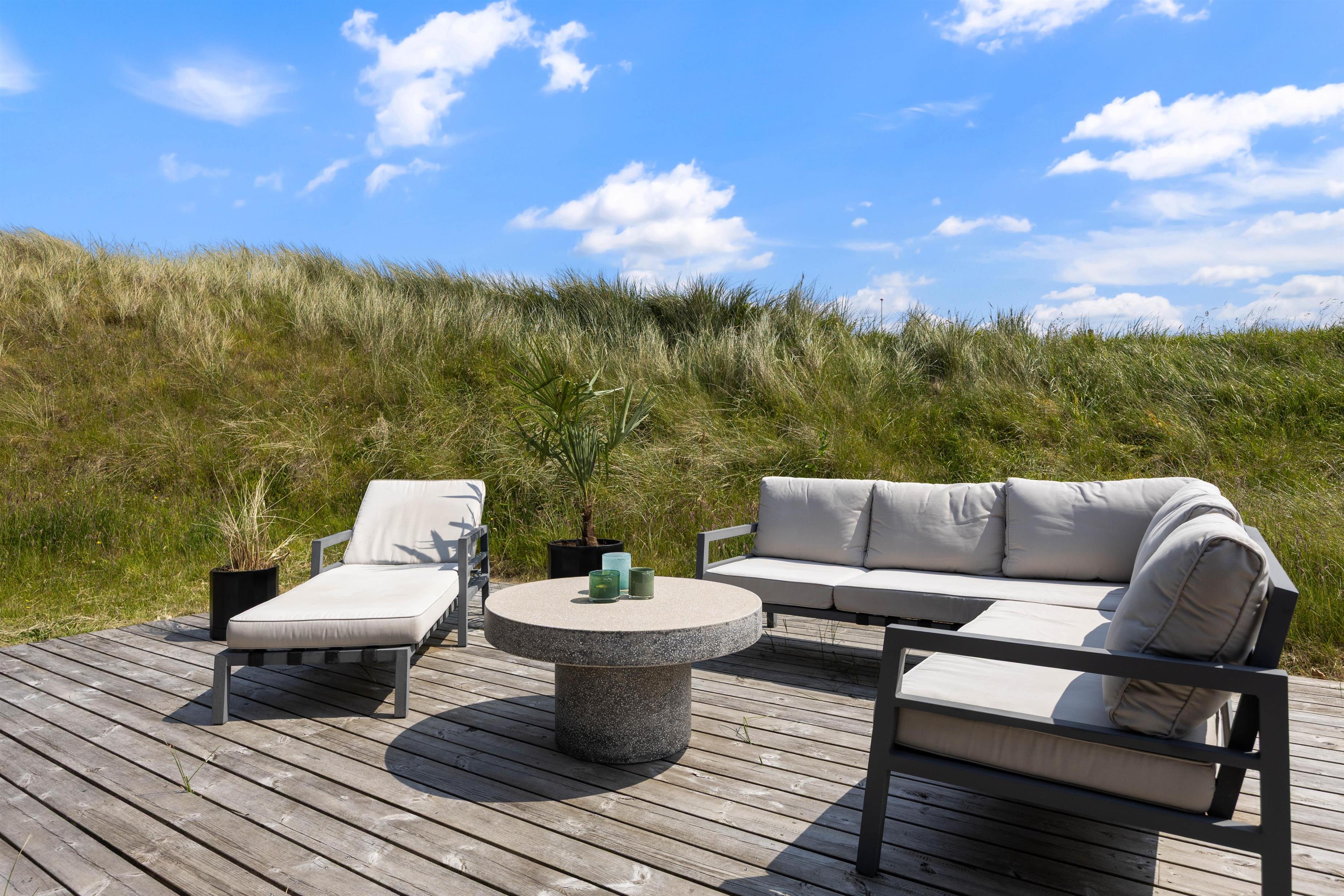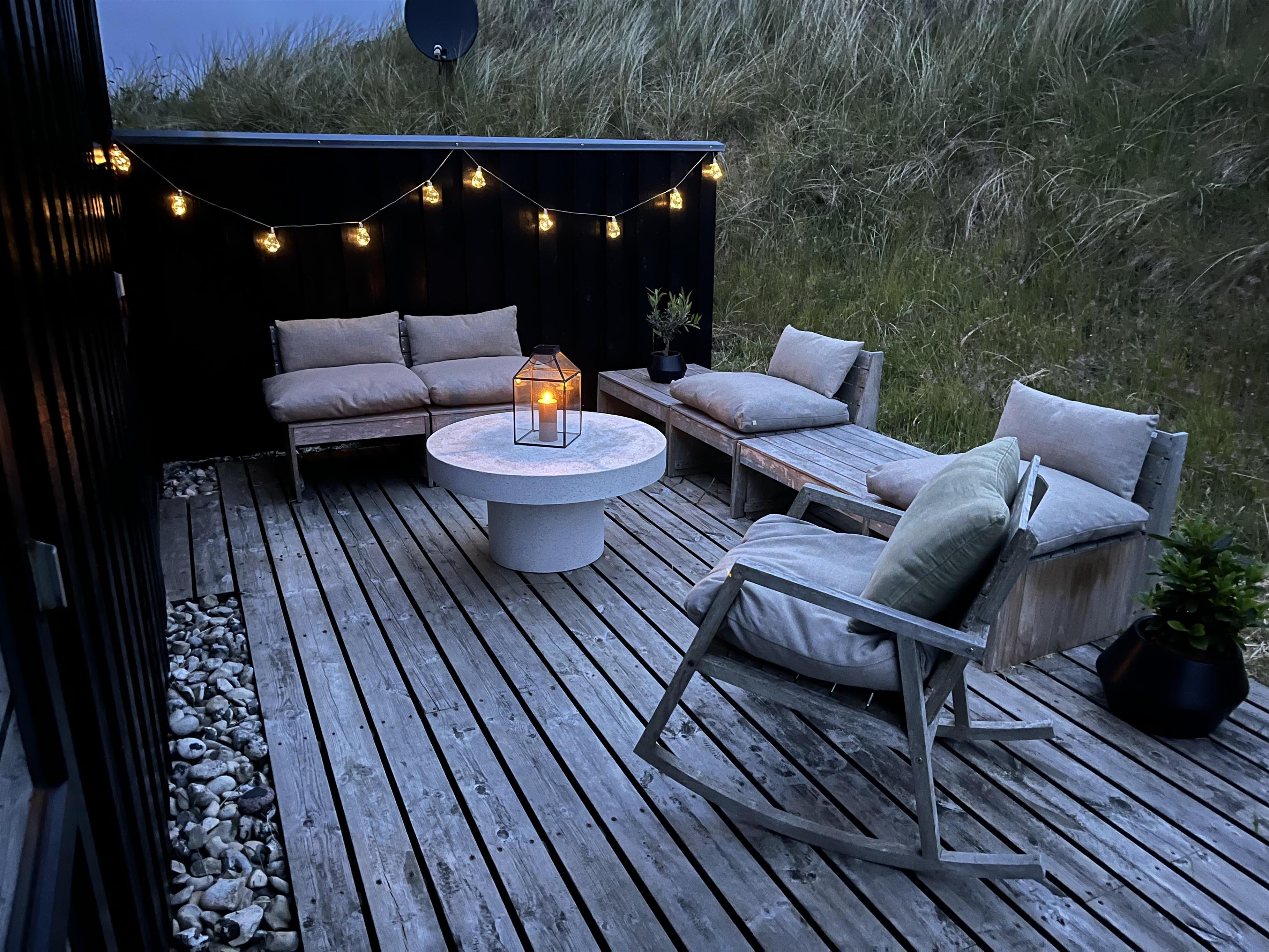 Udendørs venter der jer noget helt særligt. Sommerhuset ligger hævet på en klittop, og I skal op ad en trappe for at nå op – men belønningen er en fantastisk beliggenhed og udsigt, der tager pusten fra jer. Rundt om sommerhuset breder der sig en stor, stemningsfuld træterrasse mod øst, syd og vest – med skønne læfulde kroge, hvor I kan nyde sol, frisk havluft og ro fra morgen til aften. Terrassen er møbleret med flotte loungemøbler og komfortable havestole – perfekt til morgenkaffen, afslapning med en bog eller en grillmiddag i aftensolen.