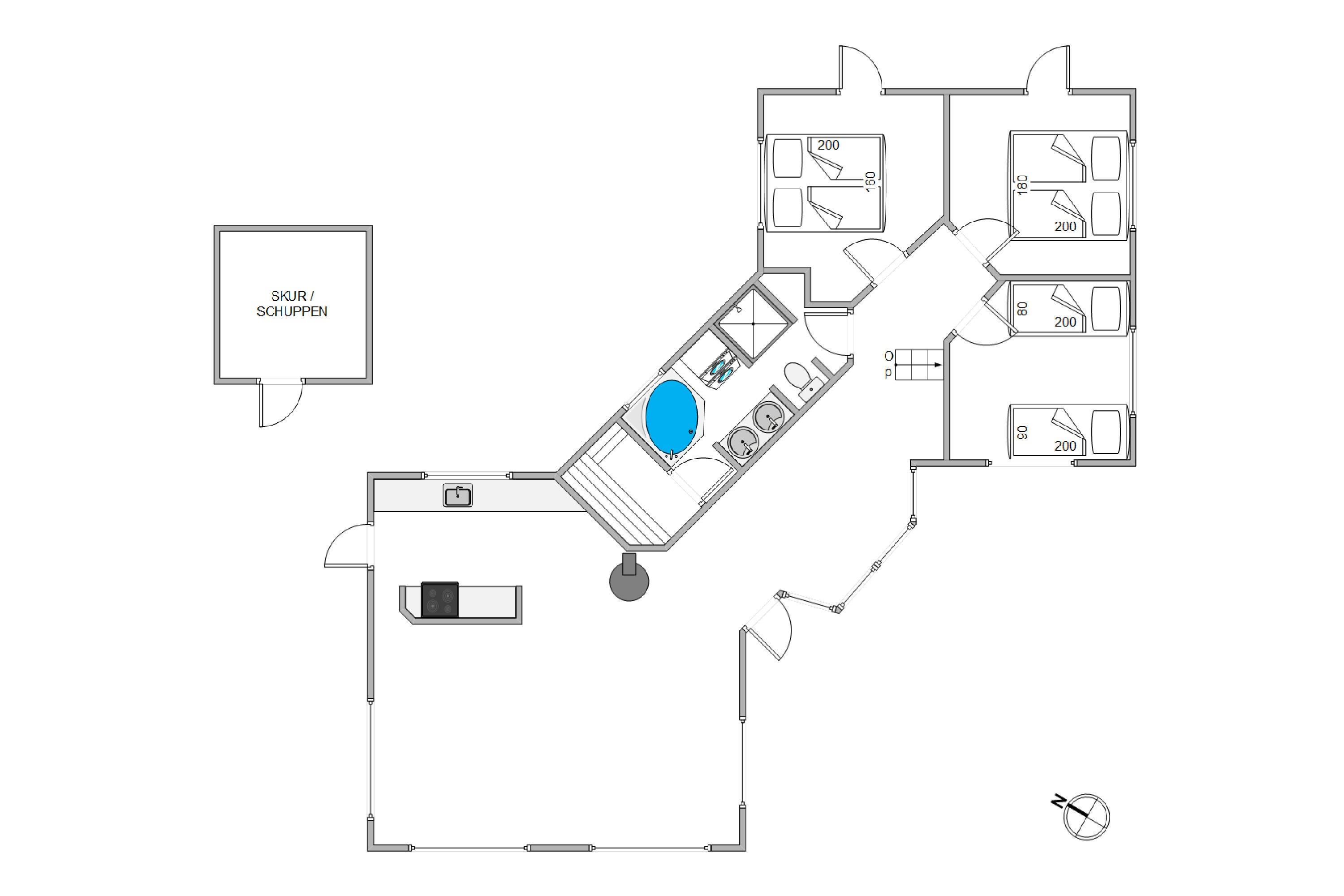 I sommerhusets anden afdeling finder I tre lækre og gode soveværelser – alle med skabsplads og god komfort, så I kan vågne udhvilede op til en ny feriedag. Badeværelset er rummeligt og lækkert indrettet med gulvvarme, bruseniche, spabad og sauna. Her er der virkelig mulighed for selvforkælelse og hjemmewellness, hvad enten I vil varme jer i saunaen efter en tur ved stranden eller slappe af i spabadet med et glas vin i hånden.
