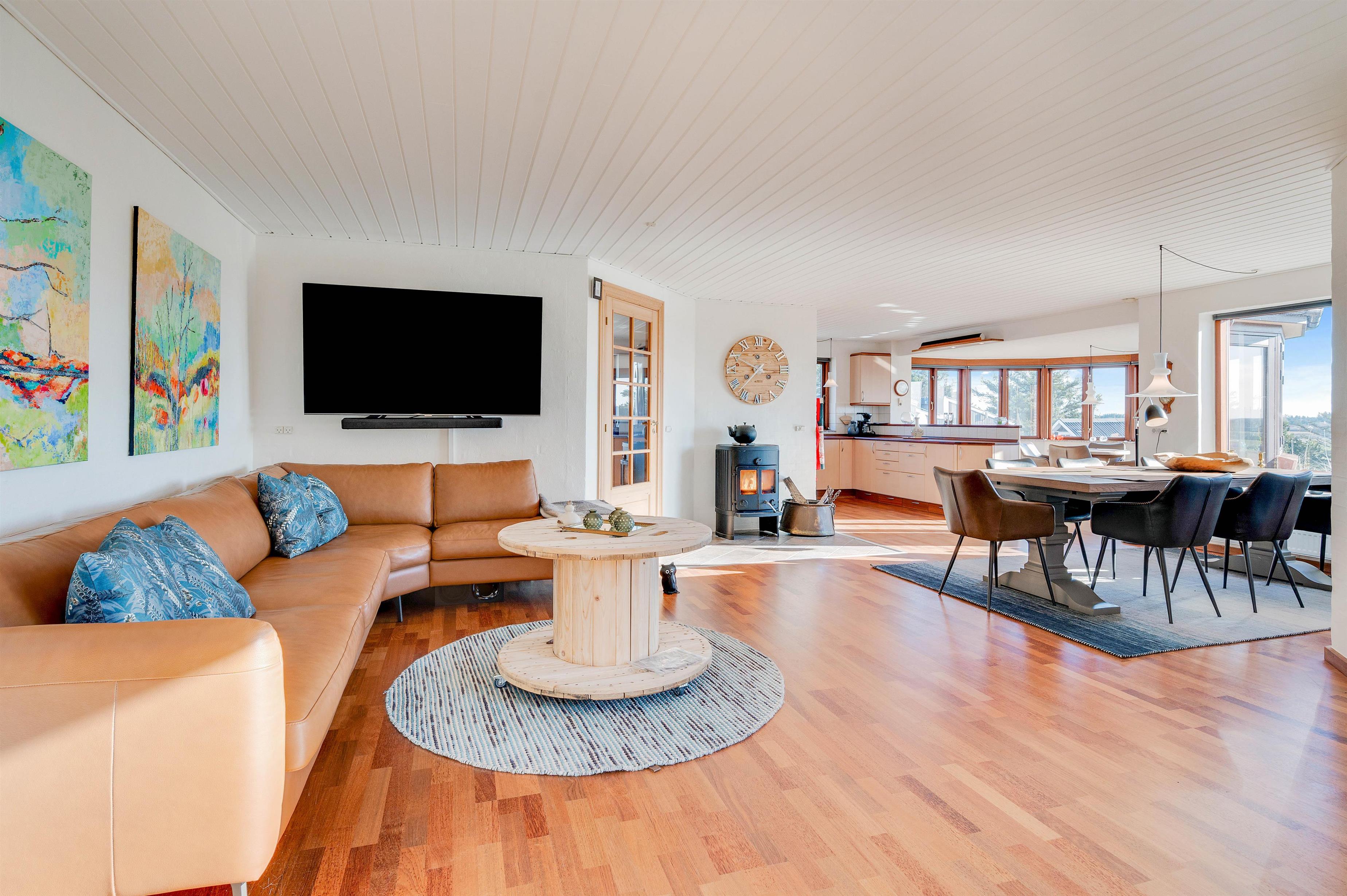 Fra den hyggelig stue er der direkte udgang til den store omkringliggende terrasse, hvor I uanset vind og vejr kan finde en krog i læ. Så tilberedningen af bøfferne er sikret – også selvom det blæser. Bag huset går en lille sti til en højtliggende bænk, hvorfra I kan nyde en betagende udsigt ud over havet.
