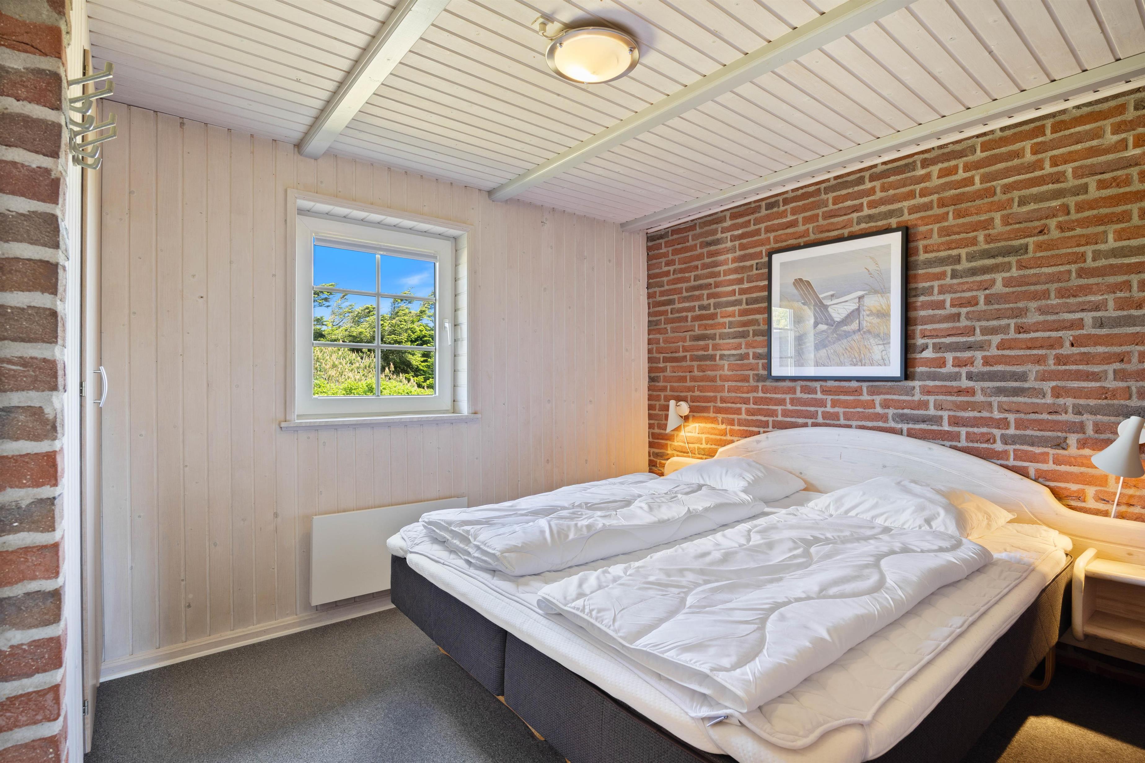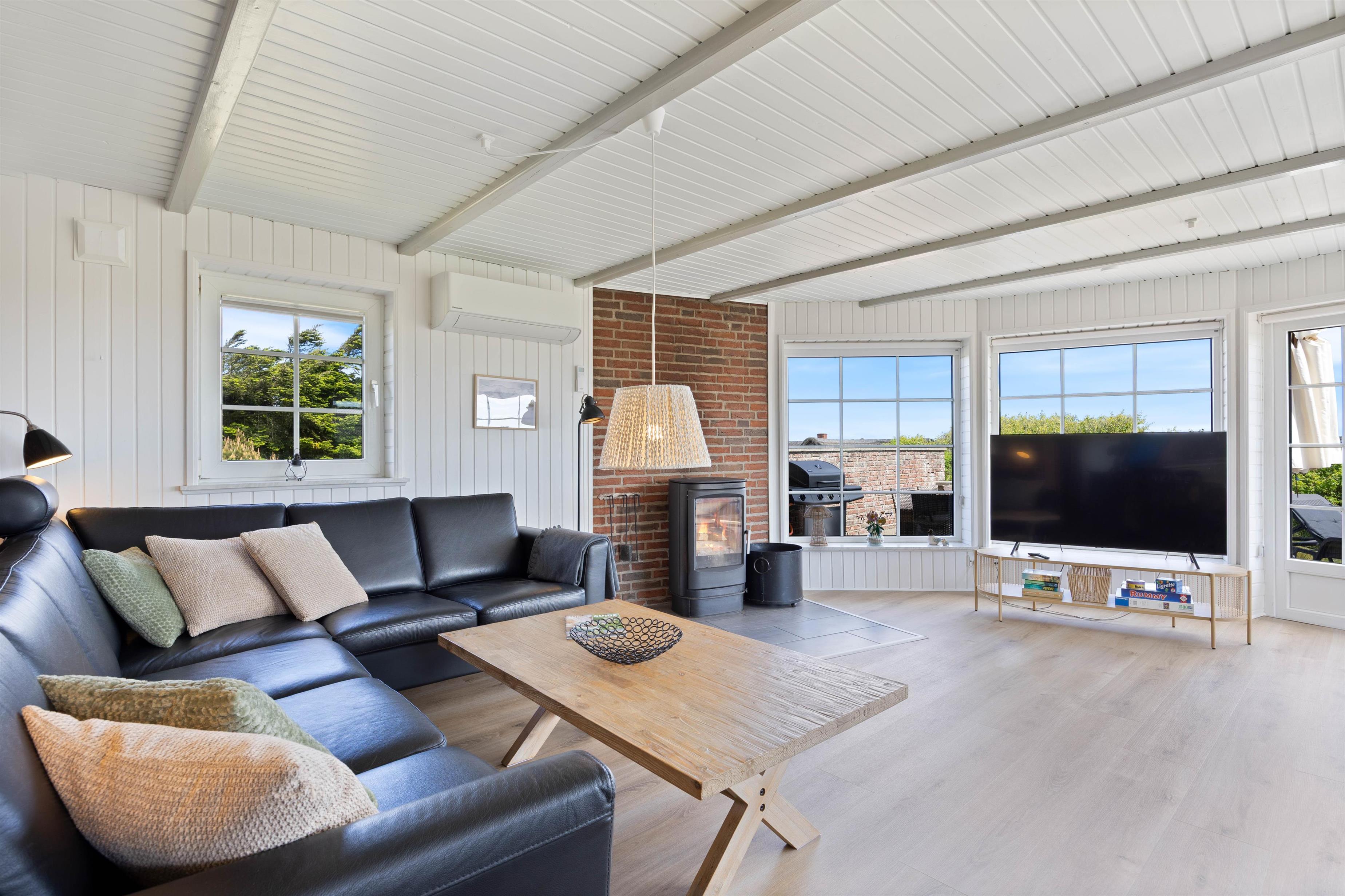Stue, køkken og spisekrog flyder sammen i ét stort opholdsrum, der uden tvivl vil blive epicenteret på jeres ferie. Her kombineres rå murstensvægge med lyse paneler, hvilket giver huset sin helt egen karakter og personlighed. Herfra kan i nyde udsigten mod øst, og lade møblerne give jer en velfortjent og afslappende ferie. Stuen er nemlig hyggelig indrettet med gode møbler, en skøn flydersofa, TV, og brændeovn, mens I i køkkenet finder blandt andet opvaskemaskine og mikroovn.