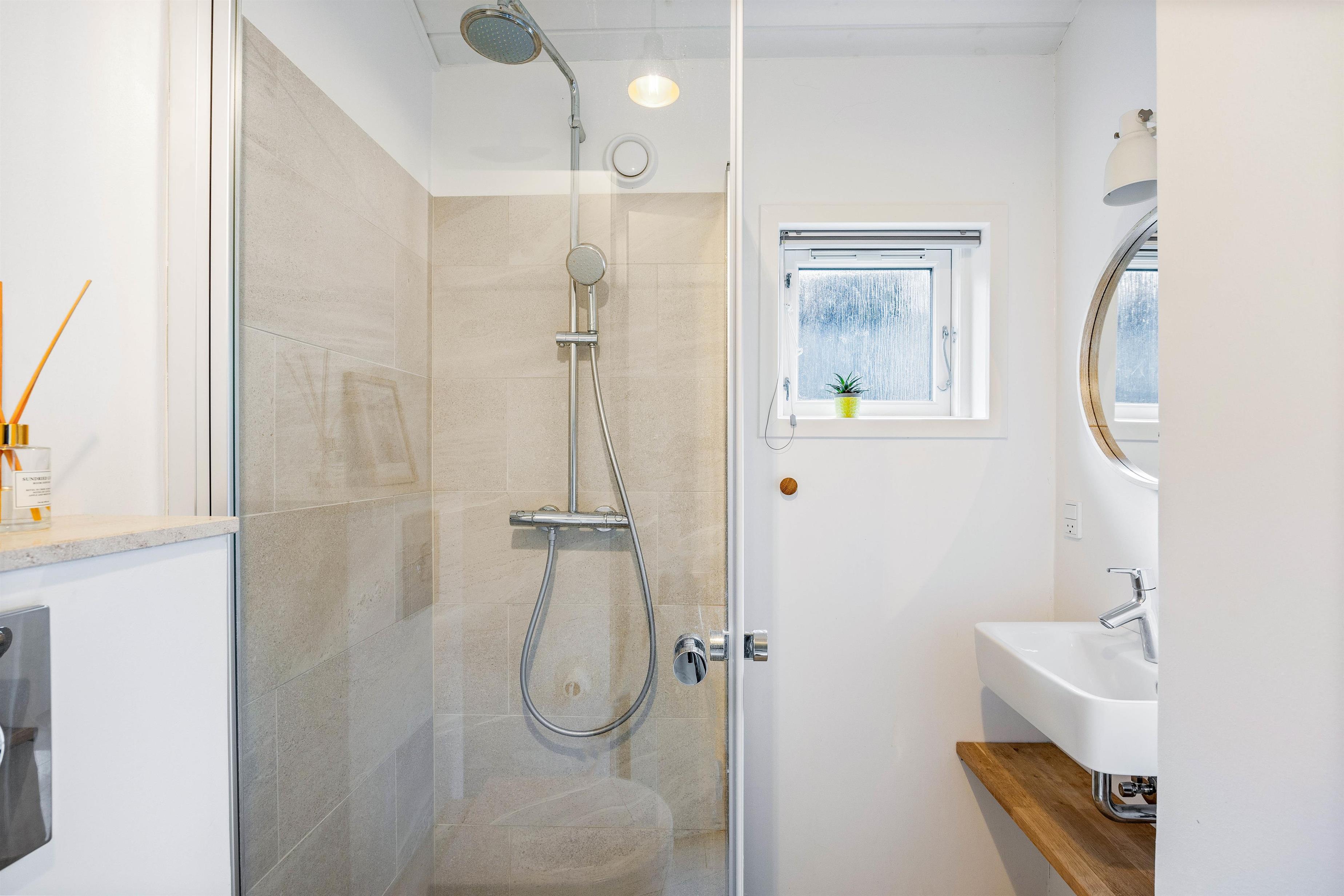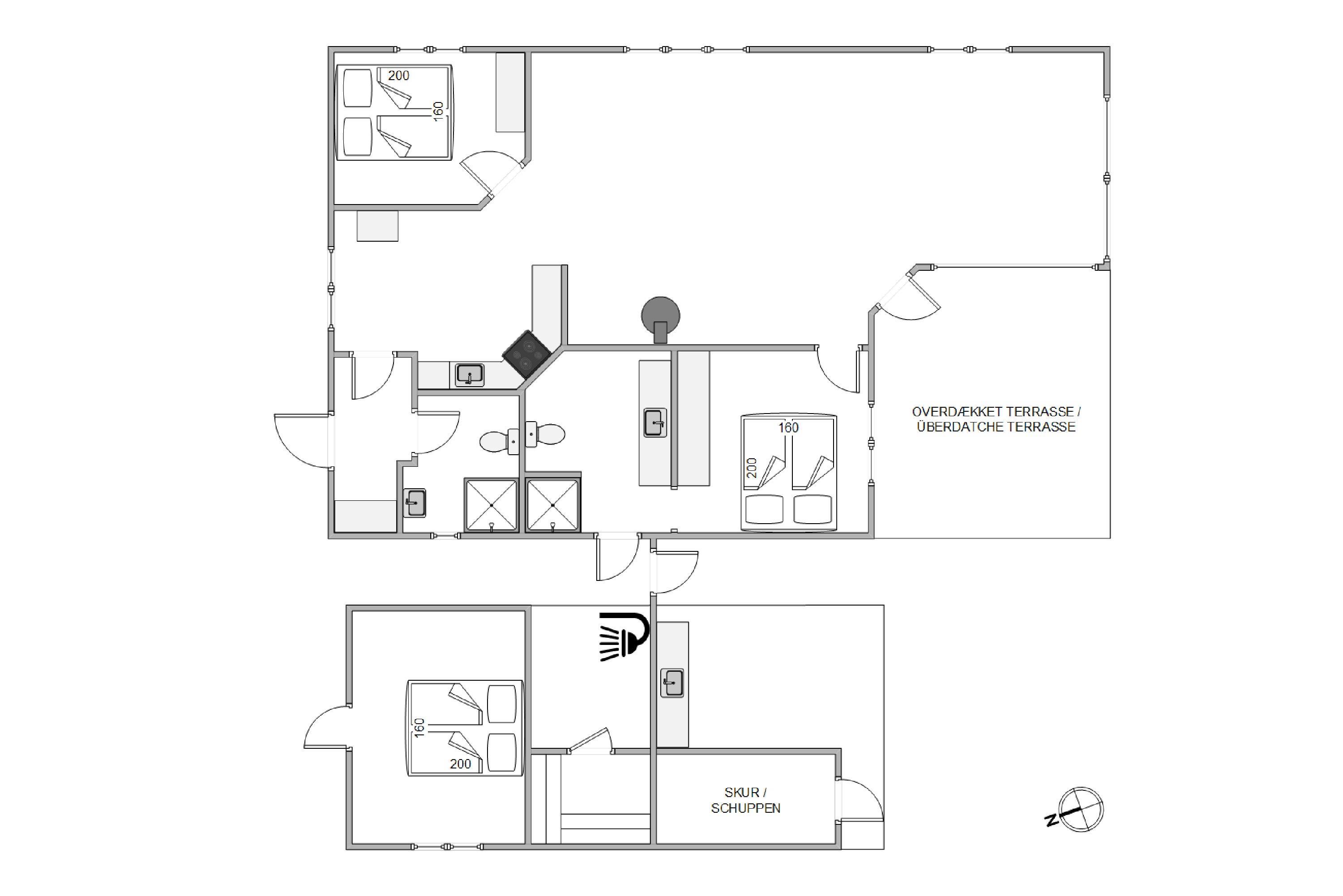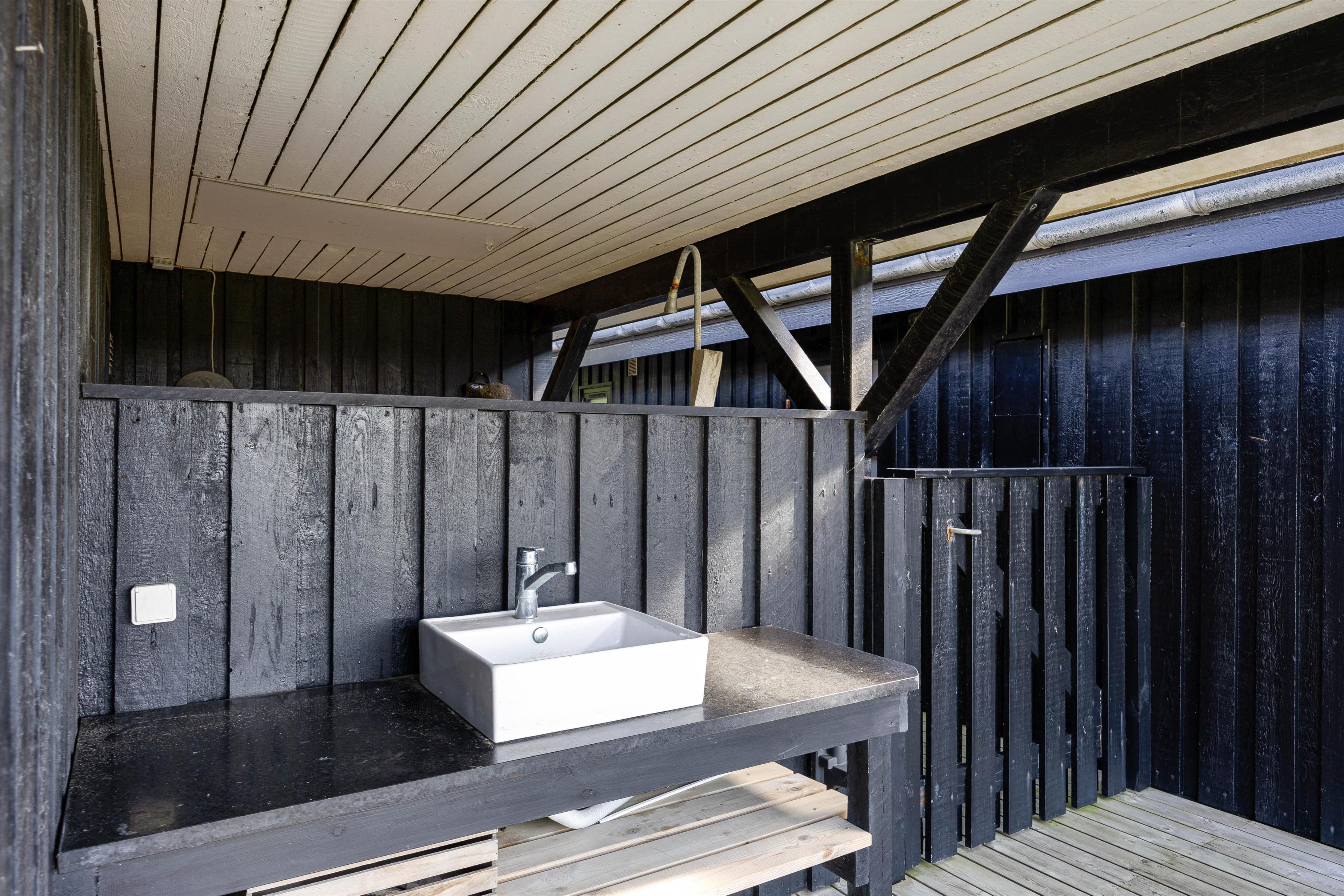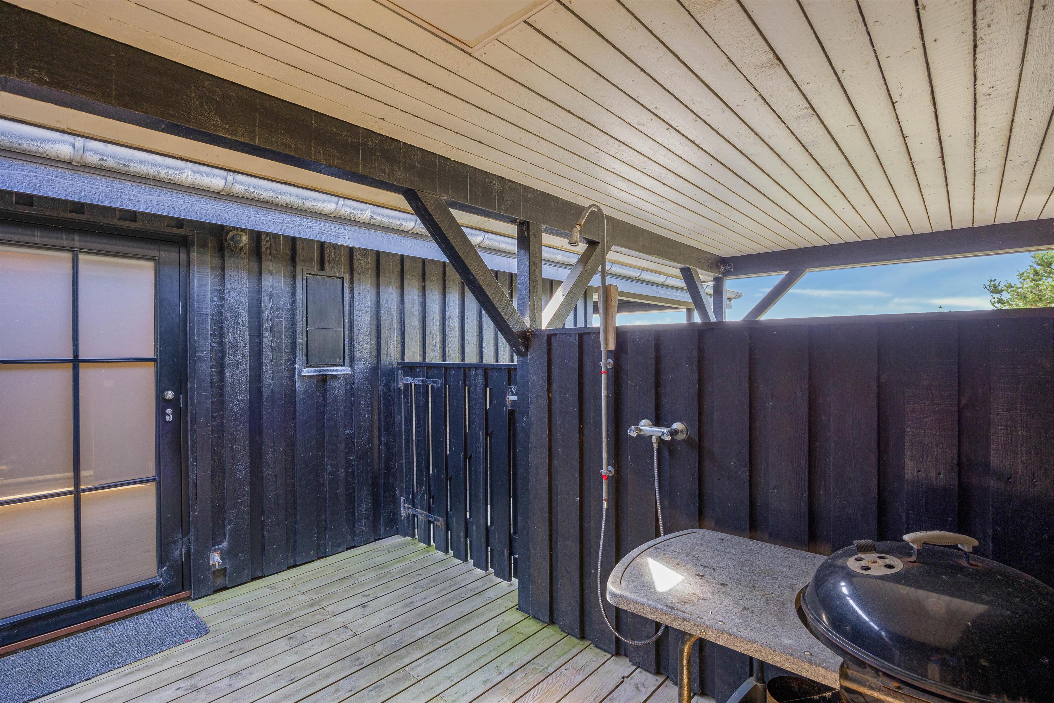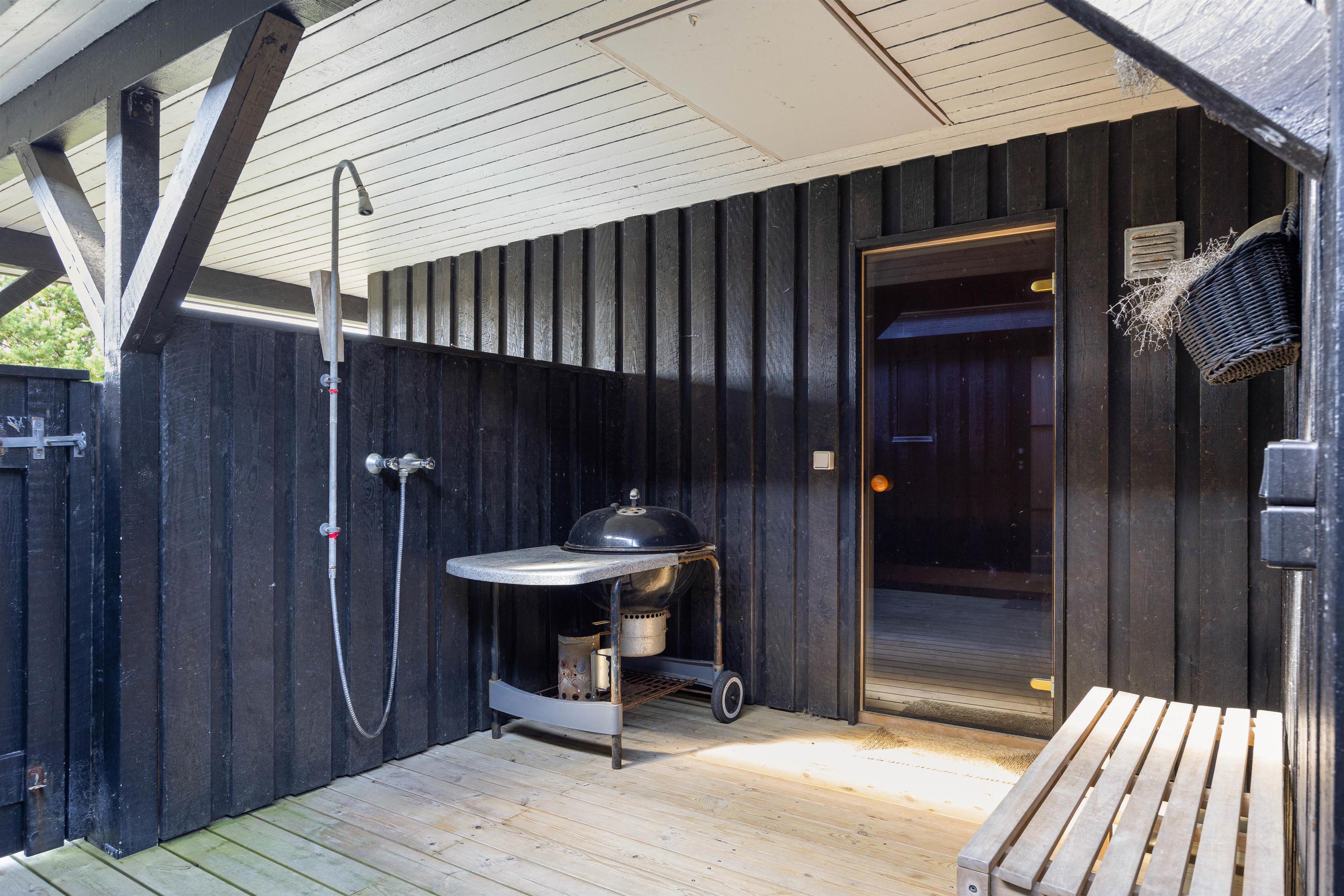 Udenfor sommerhusets mure finder også flere skønne terrasser. Den ene af terrasserne er overdækket, hvilket giver jer muligheden for at nyde terrassen uanset vind og vej. Her kan I nyde en skøn grillaften, hvor I også kan benytte jer af feriehusets lille udekøkken, hvor der både er varm og koldt vand i hanen. Udover den overdækket terrasse finder I også endnu en lækker afskærmet terrasse, der sikrer at I kan nyde solens stråler uanset tidspunktet på dagen. Terrassen går hele vejen rundt om huset, og fører også om til husets udebruser og sauna, som indbyder til ekstra afslapning under jeres ferie. I vil kunne bruge den udensørs bruser fra april til november.