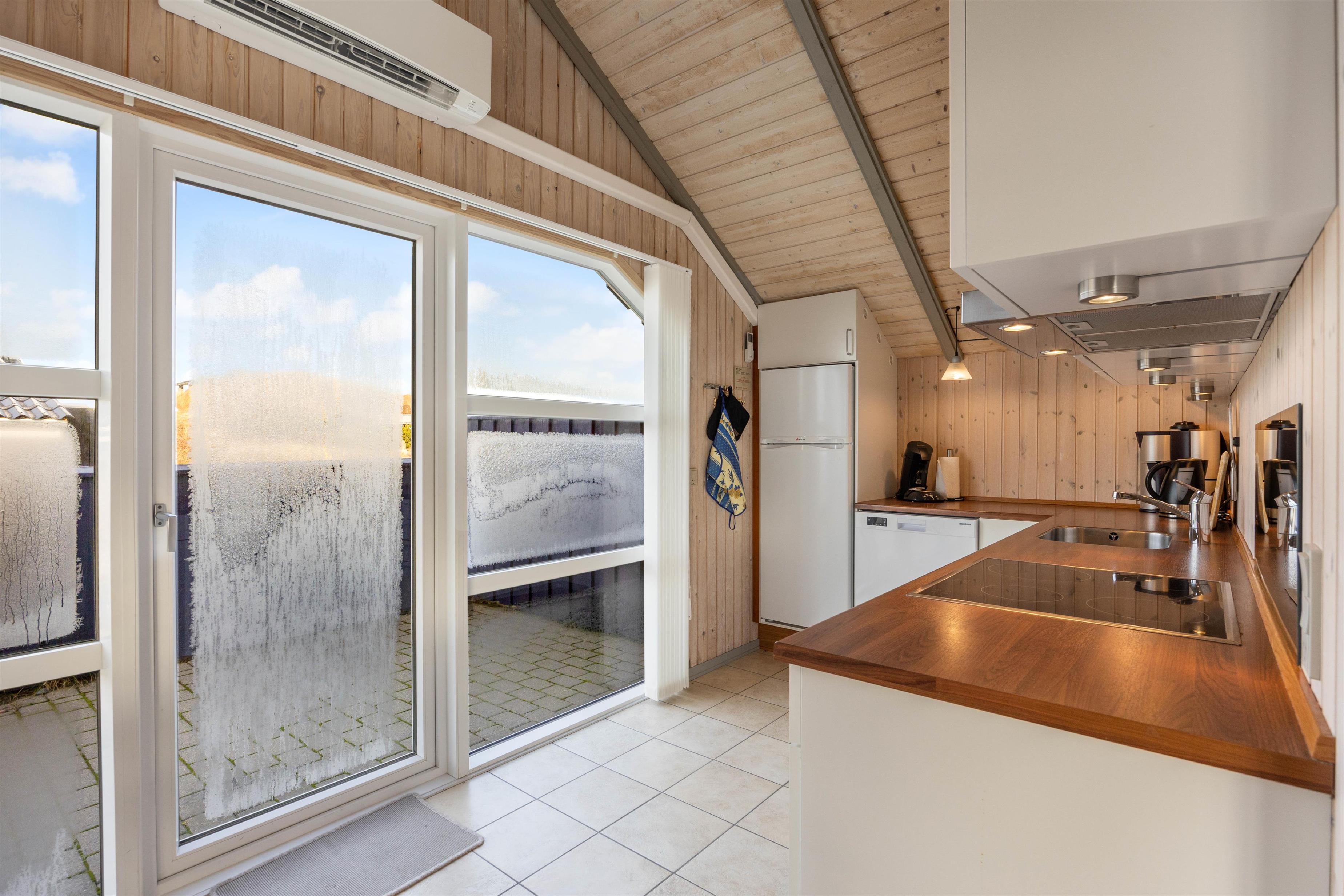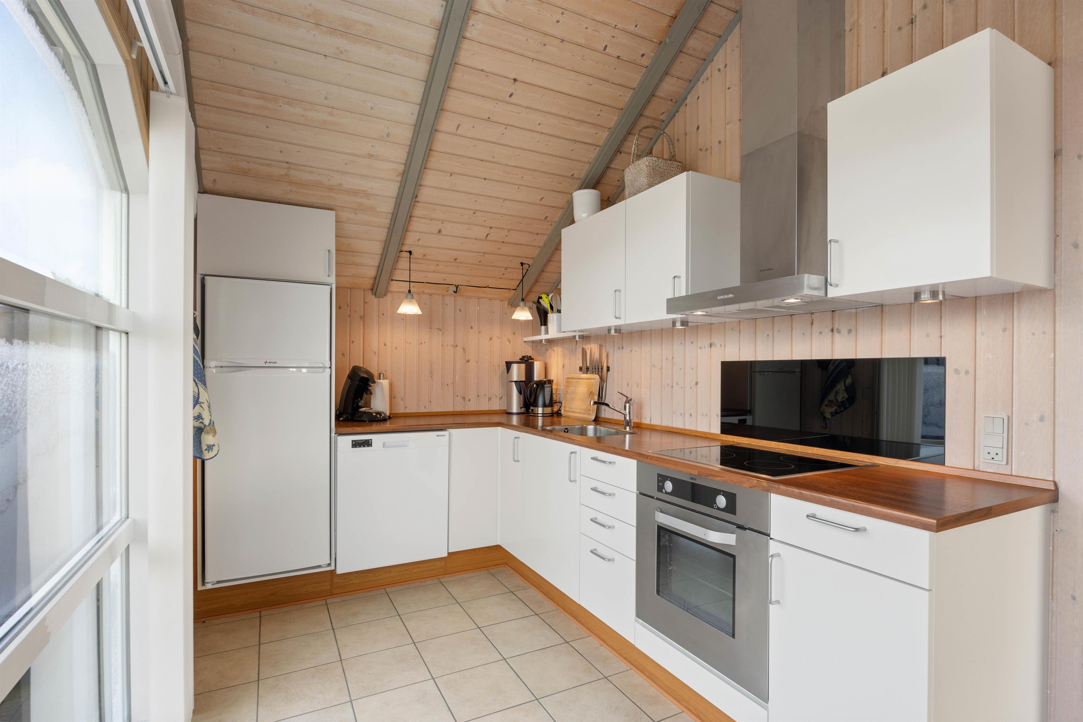 Når I træder ind i sommerhuset, bliver I mødt af en rummelig stue, der ligger i forlængelse af køkkenet. Imens I nyder et måltid fra spisepladsen, kan I lytte til brændeovnens knitren, der samtidig sørger for en lækker, behagelig varme og danner rammen om ægte feriestemning. I sommerhuset finder I ovenikøbet en vaskemaskine og tørretumbler, der gør det nemt for dig at holde dit tøj rent og frisk under hele dit ophold.