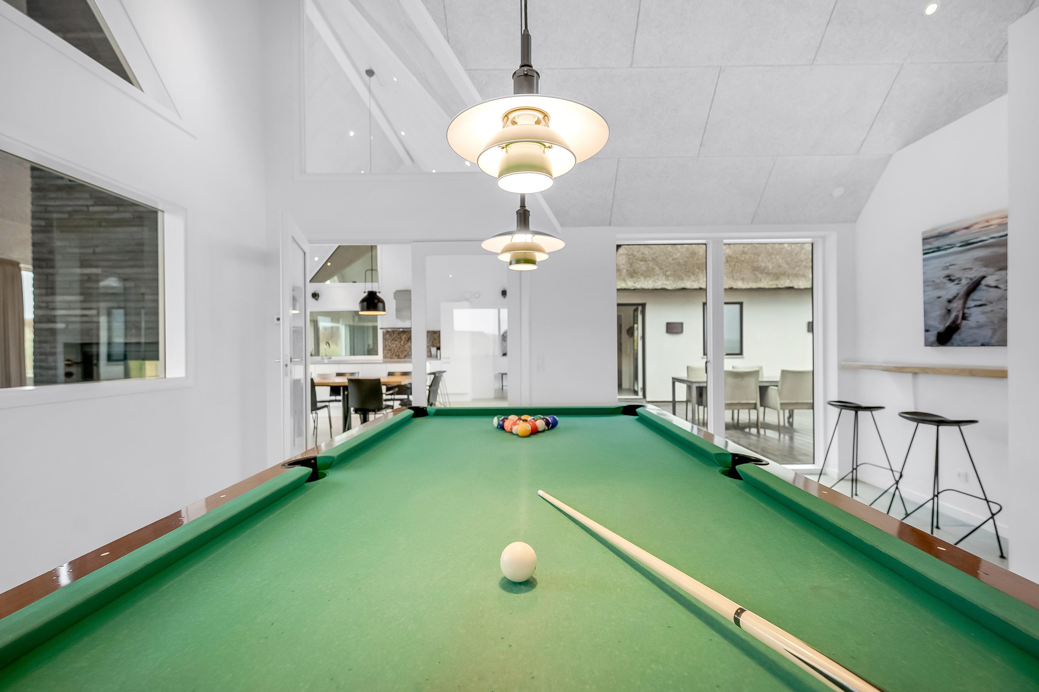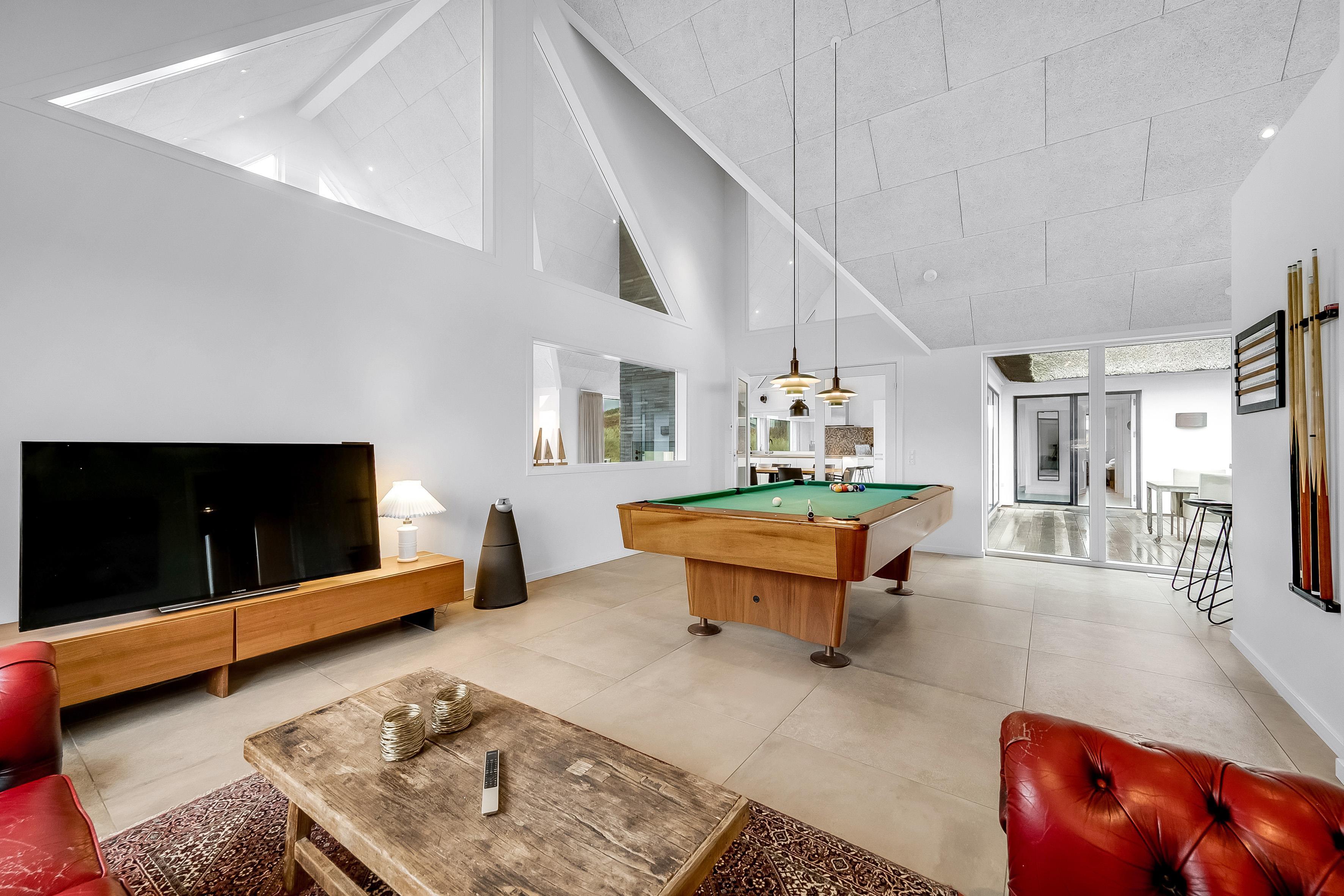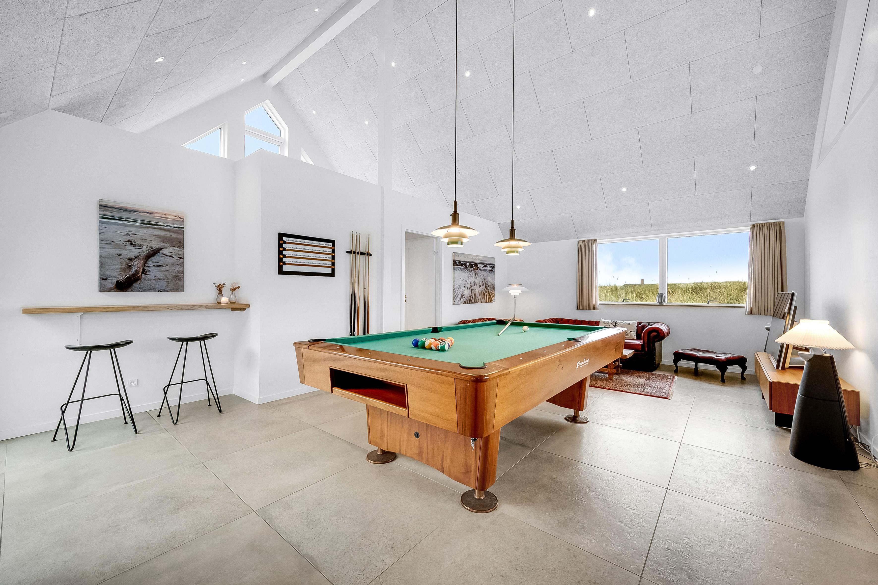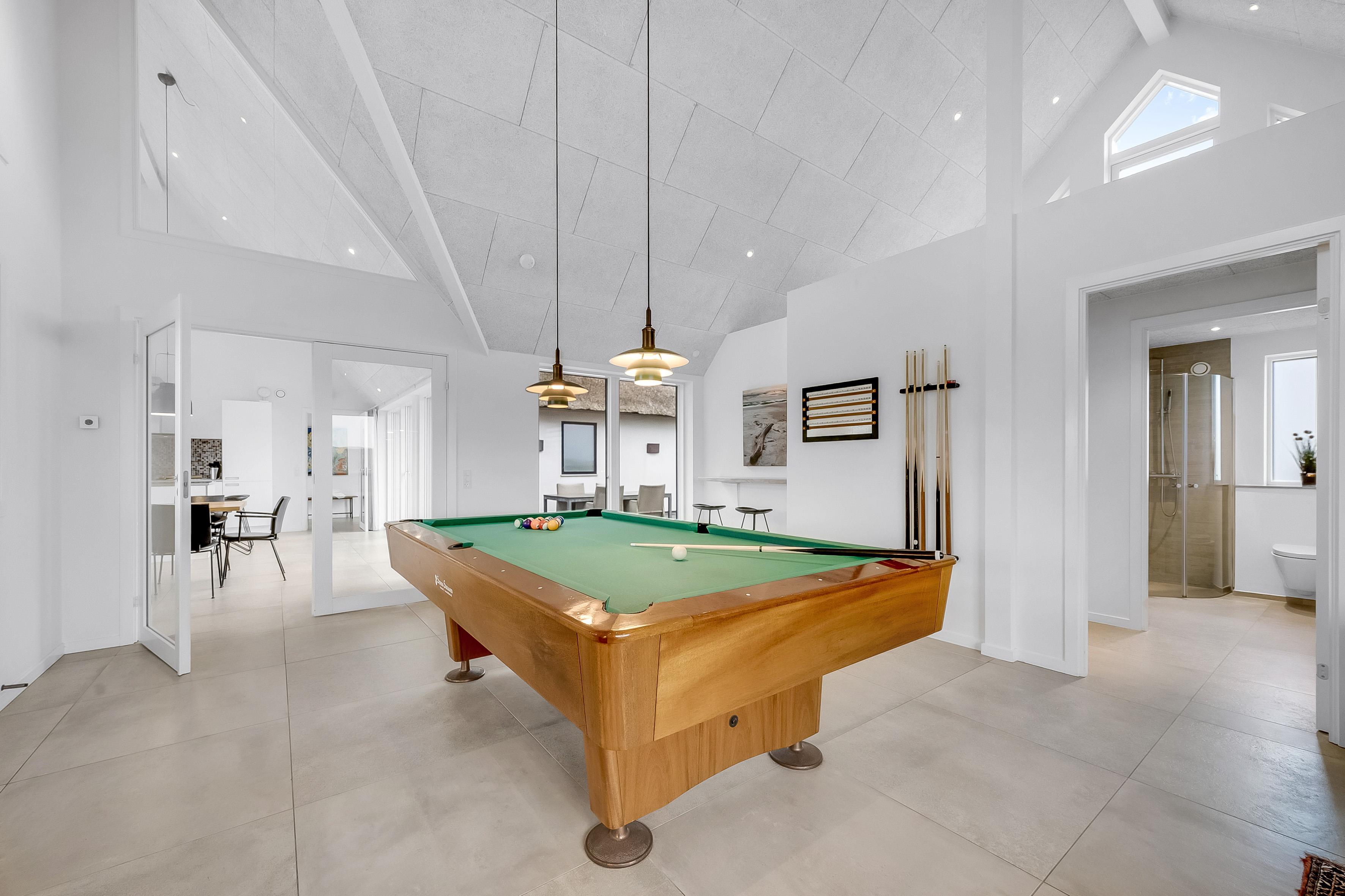 For dem, der elsker at underholde, er der et aktivitetsrum med pool/billard, bordfodbold og meget mere. Dette rum er perfekt til at tilbringe tid sammen med venner og familie, mens I nyder en sjov aften. Huset har også en indendørs spa, der kan rumme 2 personer, samt en udendørs sauna, hvor du kan slappe af efter en lang dag.