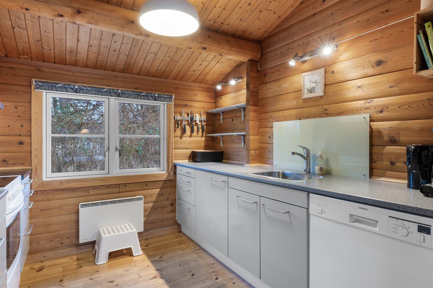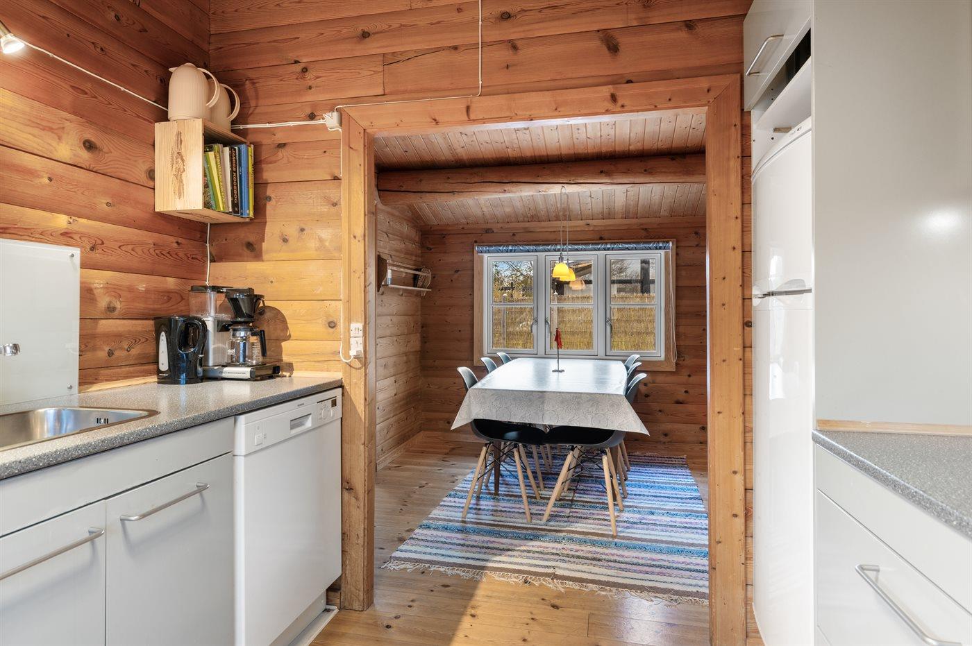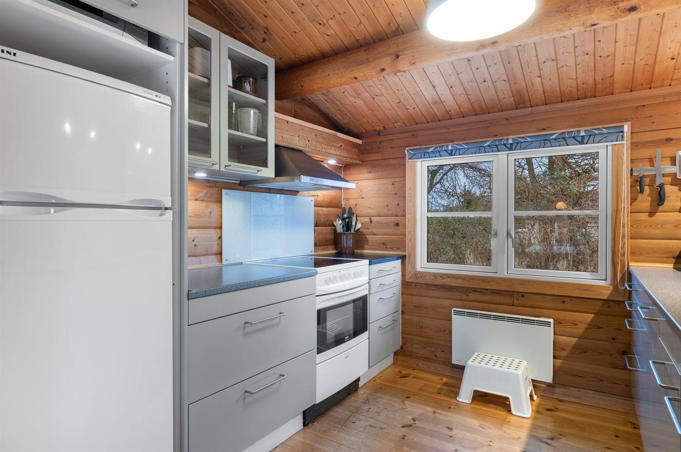 Køkkenet er udstyret med 1 køleskab. Der er 4 keramiske kogeplader, varmluftovn, mikrobølgeovn samt opvaskemaskine.