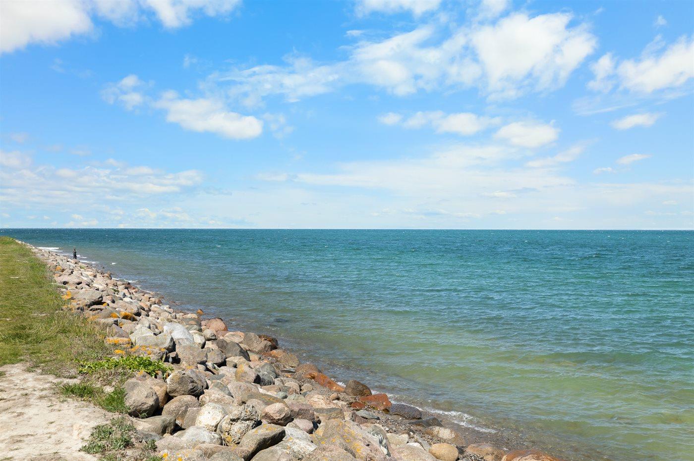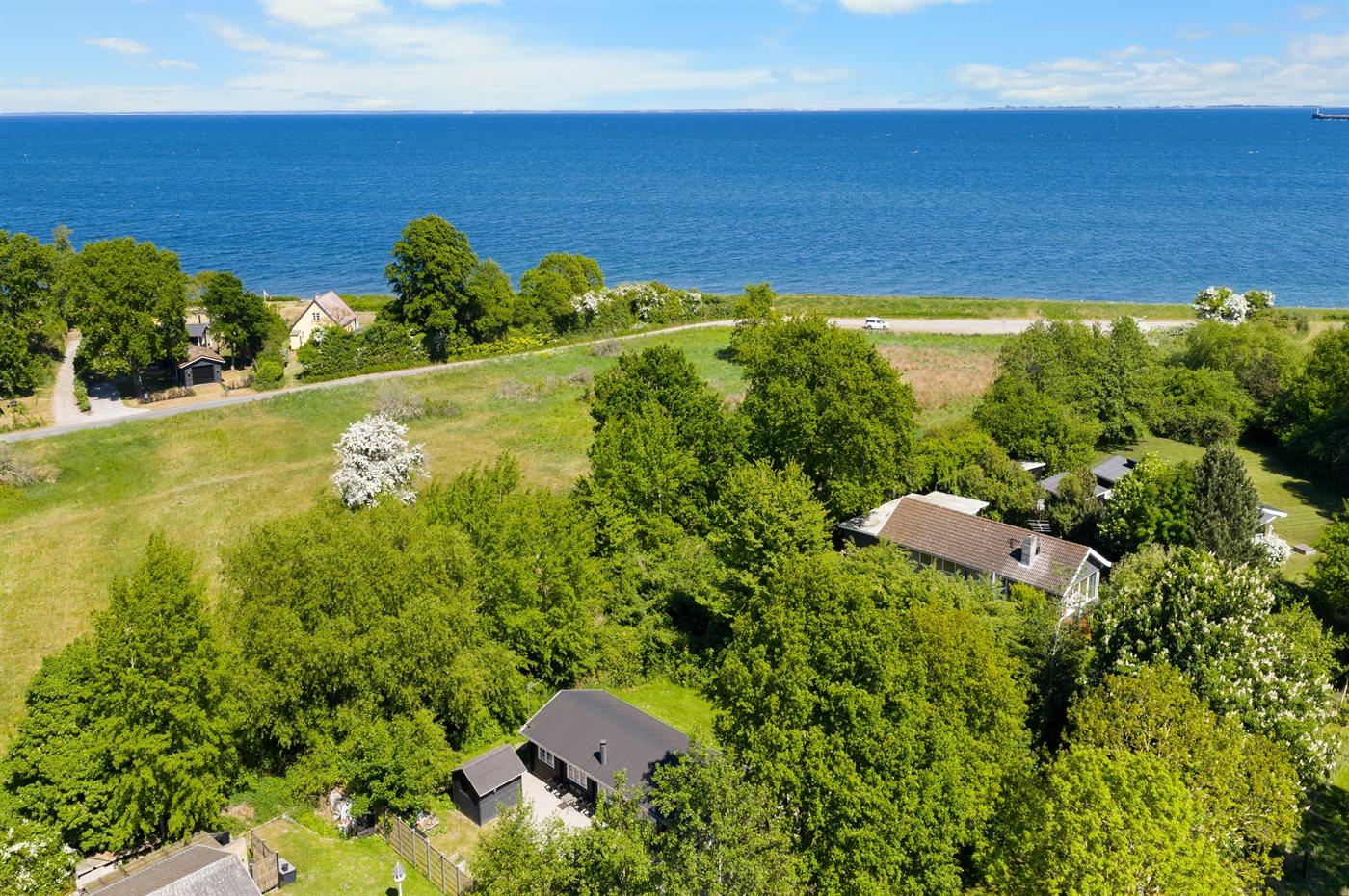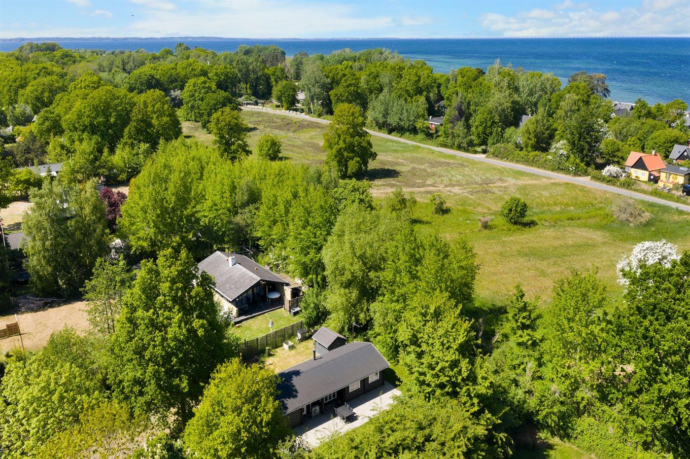 Til huset hører flere fine terrassearealer og det ligger på en stor grund, hvor der er god plads til udendørs aktiviteter. Ved stranden er der i sommerperioden opsat fælles badebro.