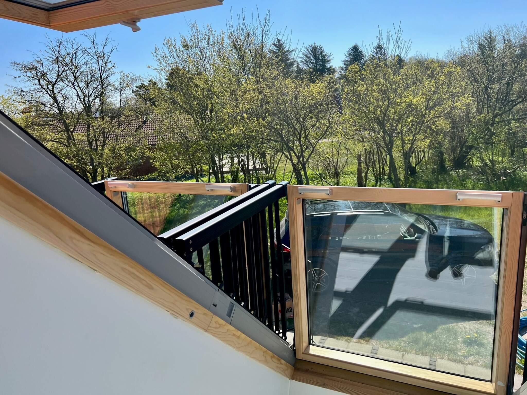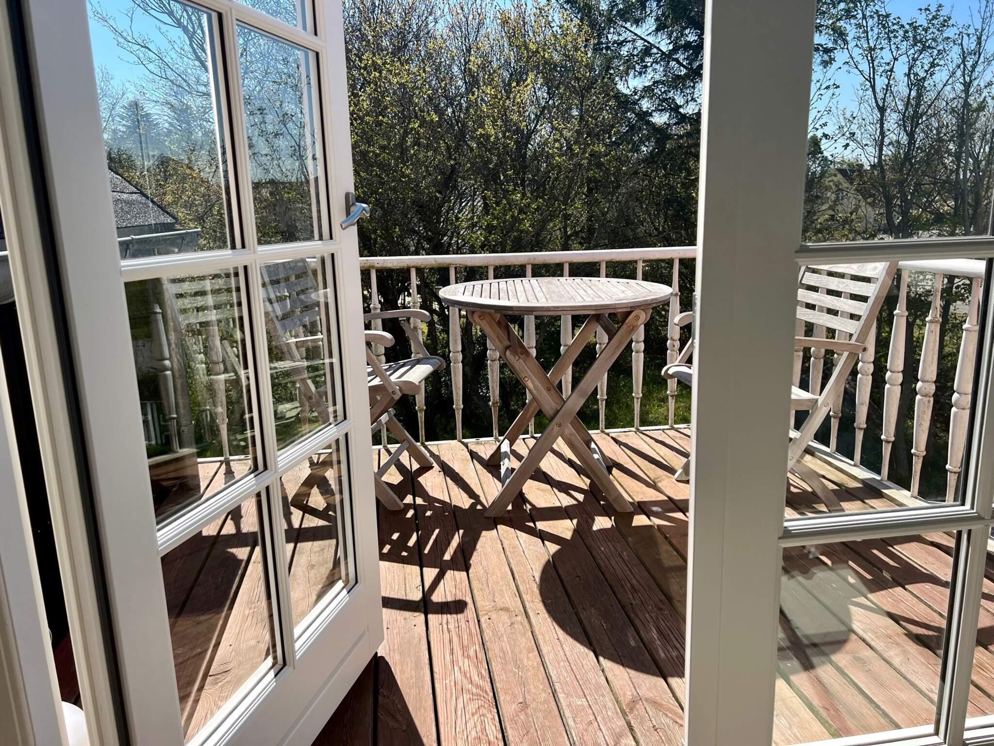 På 1. sal er der stor, lys stue med vinkel. Der er adgang til skøn altan og der er to dobbeltsenge i hver sin ende af det store loftrum med fritliggende spær.