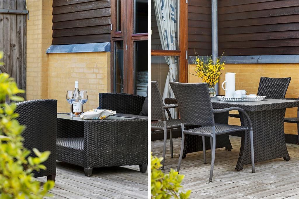 Fra stuen er der direkte adgang til de skønne terrassearealer, hvor du kan nyde feriedagene i fulde drag. Her finder du solkroge og læhjørner, der gør det nemt at finde det perfekte sted til morgenkaffen, eftermiddagens boglæsning eller aftensmaden på grillen. Når du trækker vejret dybt og hører fuglene synge over Hulsigs fredelige landskab, mærker du hurtigt ferieroen sænke sig. De grønne omgivelser indbyder til leg, boldspil og afslapning, og på de stille aftener kan I tænde et par lanterner og nyde solnedgangen, mens lyset langsomt falmer over klitheden.