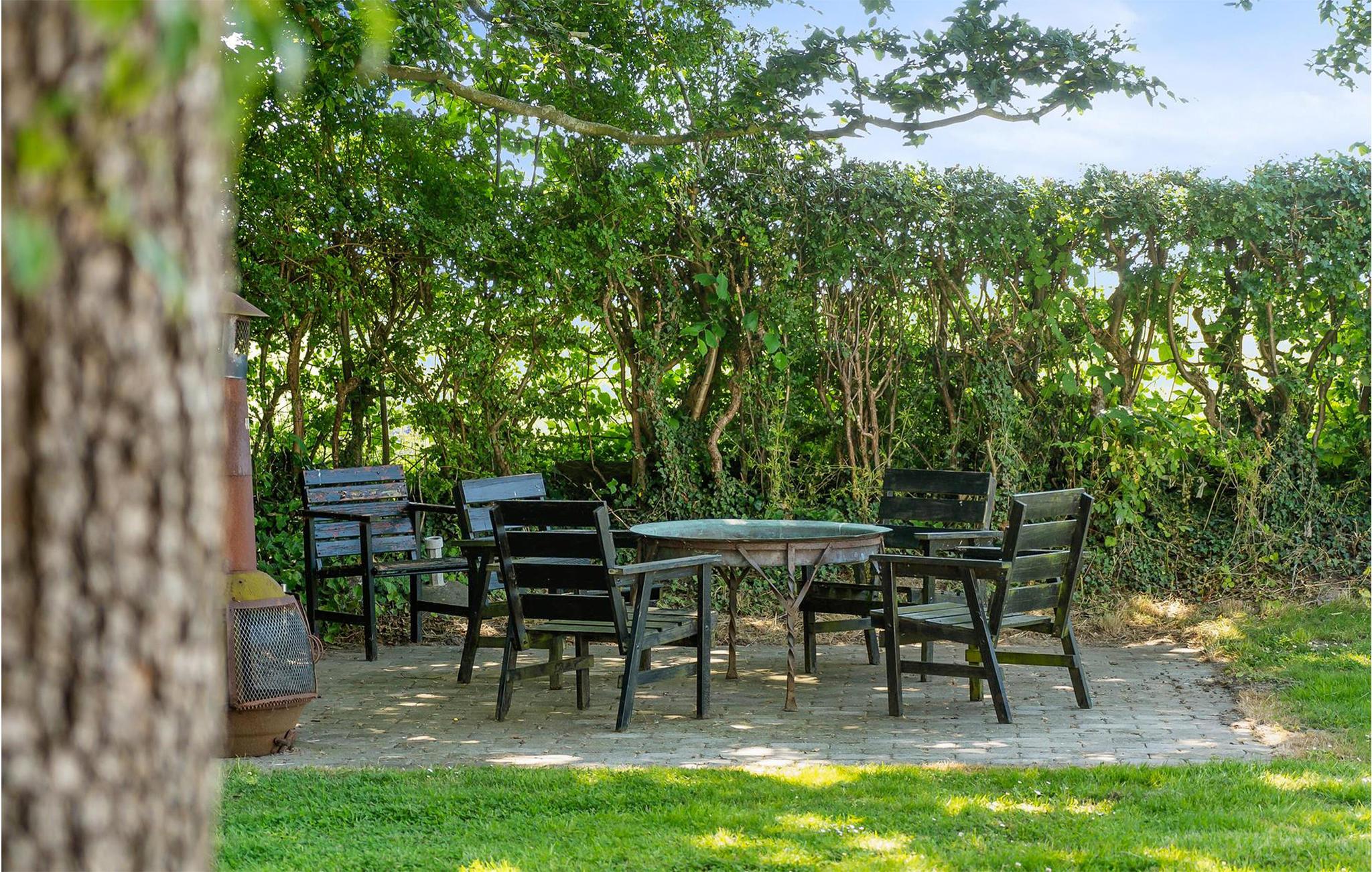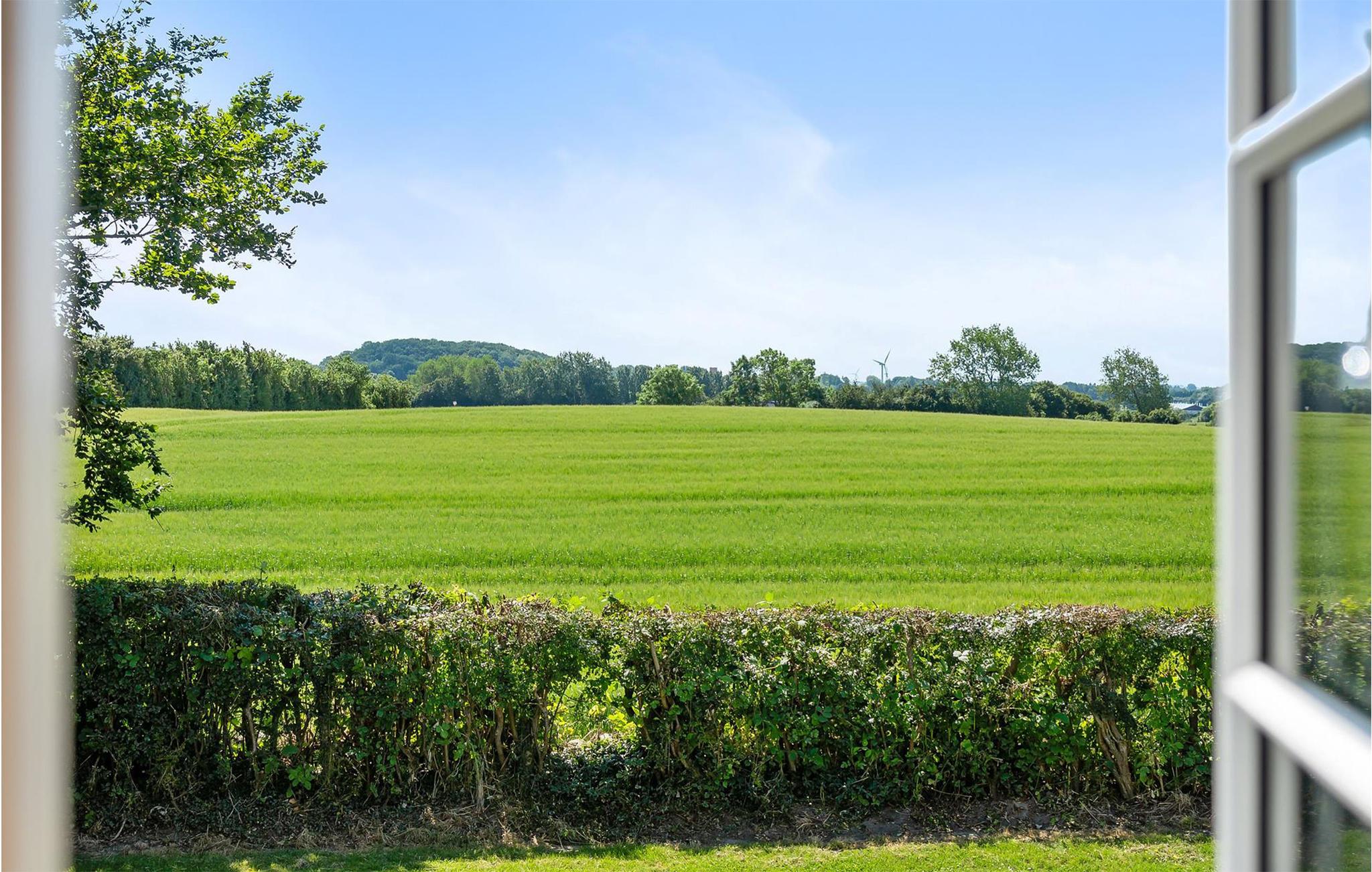 Oplev det romantiske Drostgaarden i Humble med charme, store terrasser og udsigt til marker på Sydlangeland.