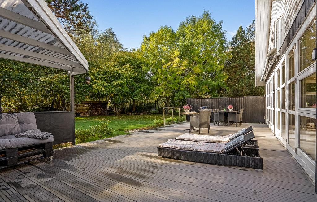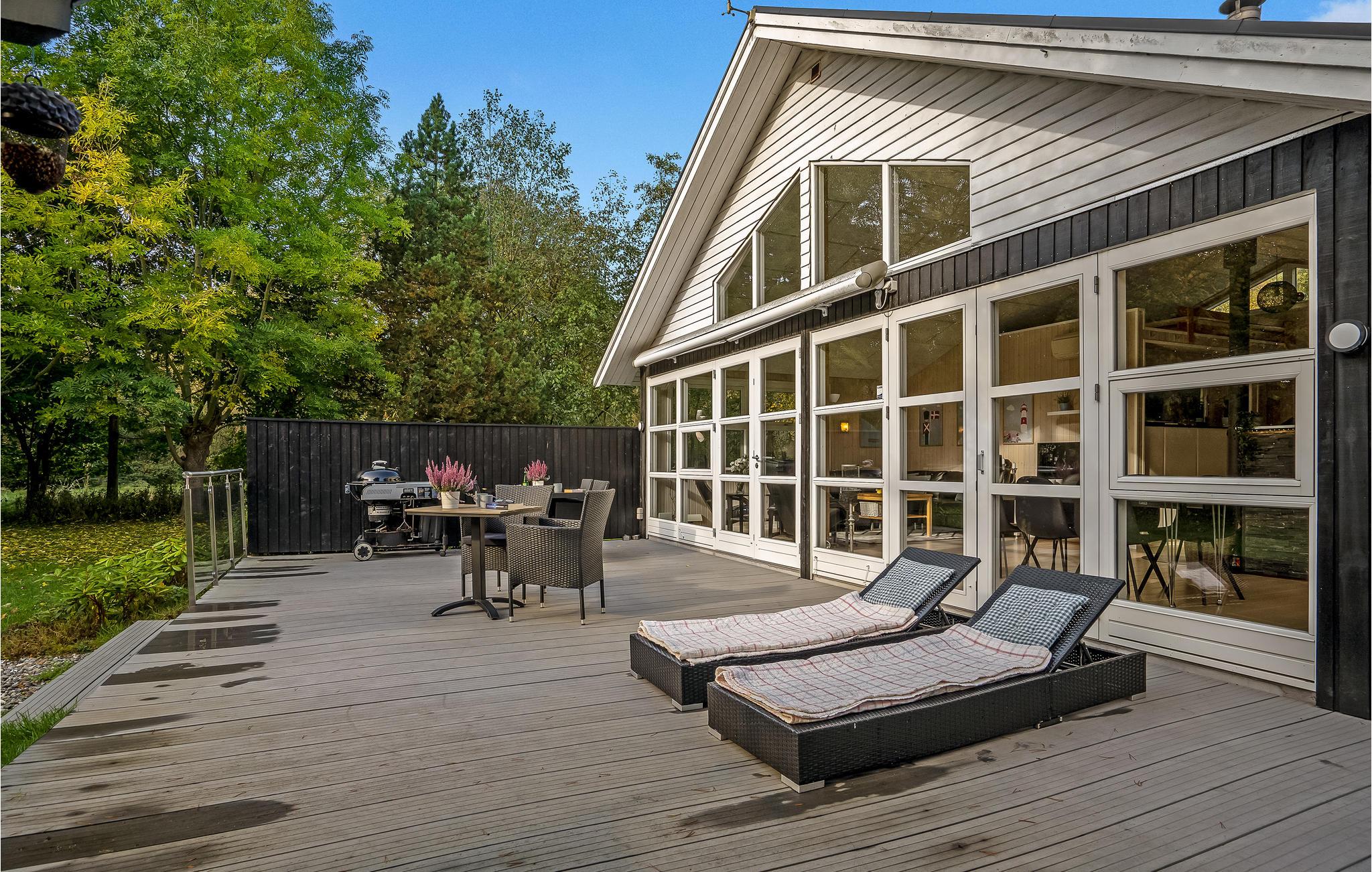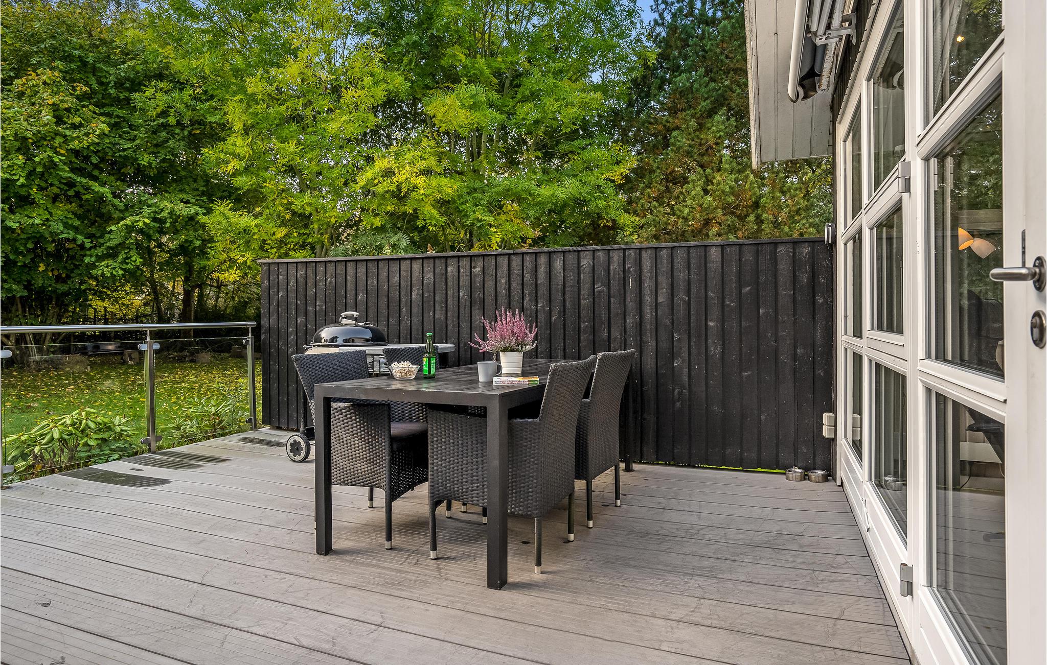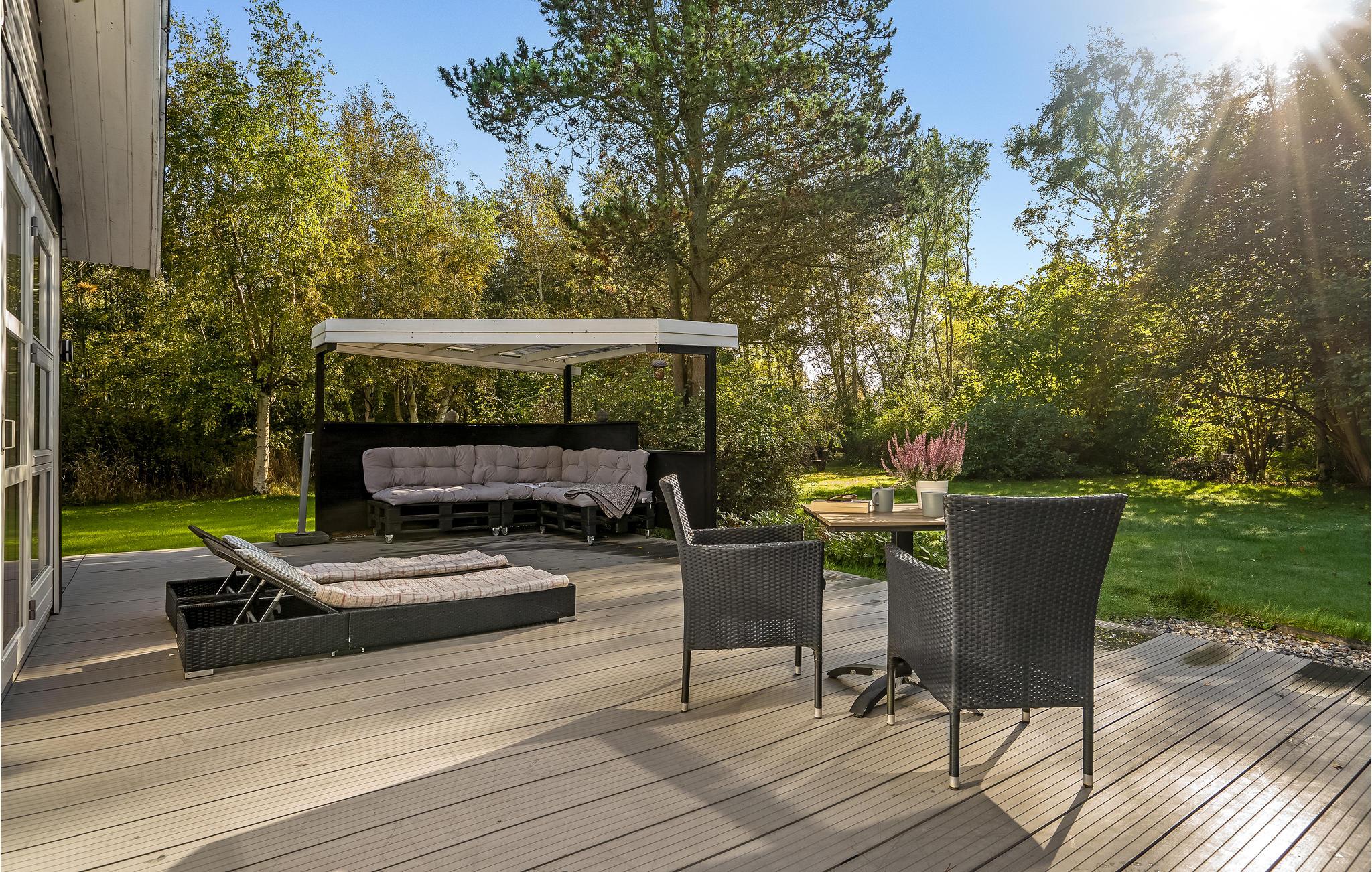 Huset ligger på en dejlig naturgrund med store træer og plads til, at jeres børn og hund kan bevæge sig. I kan både finde sol og skygge i terrassens mange hyggekroge, hvor det er skønt at læne sig tilbage med en bog efter en lang dag på farten. Der er både grill og havemøbler til de lune sommeraftener, hvor I helst vil spise ude i det fri.