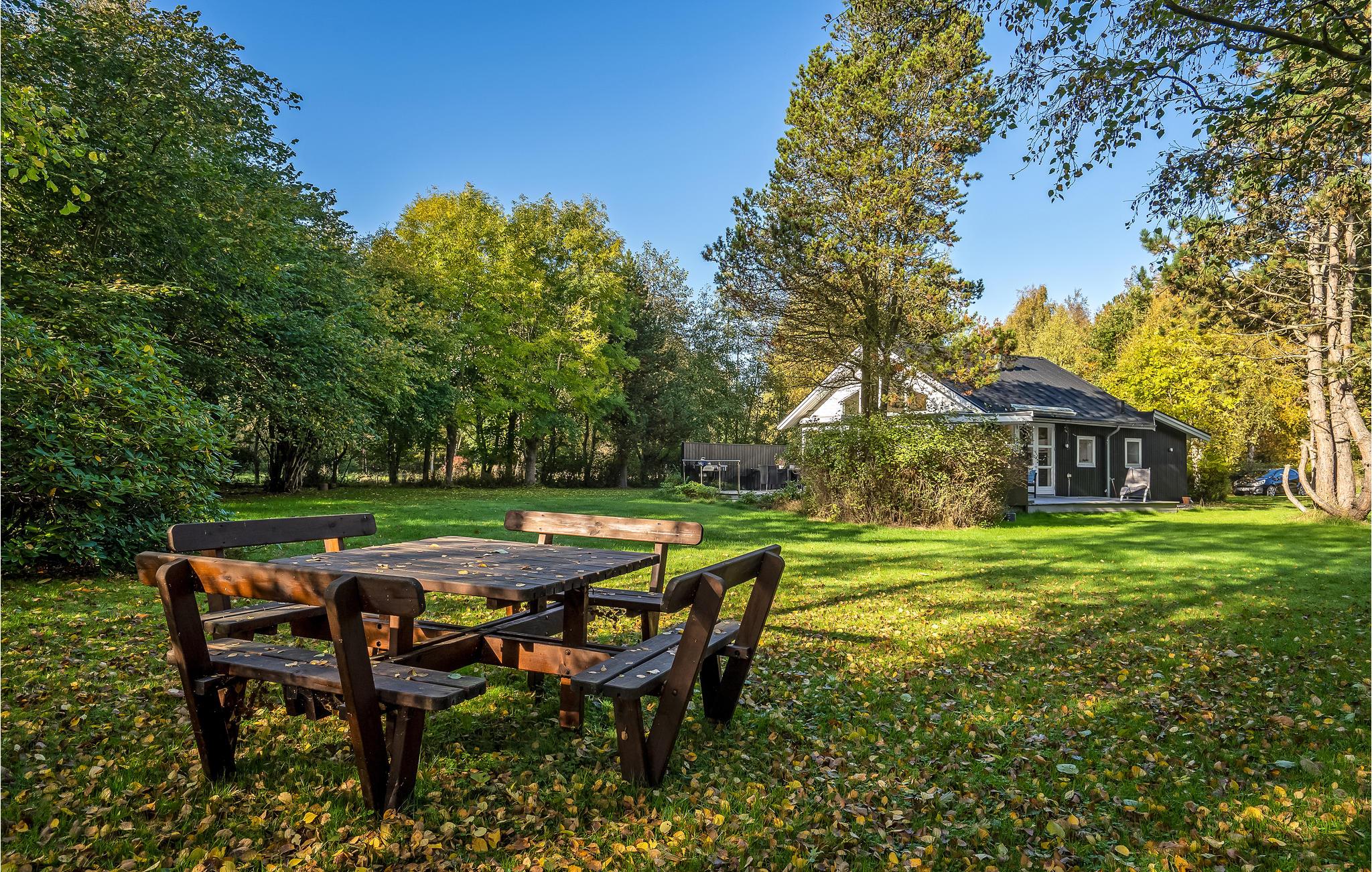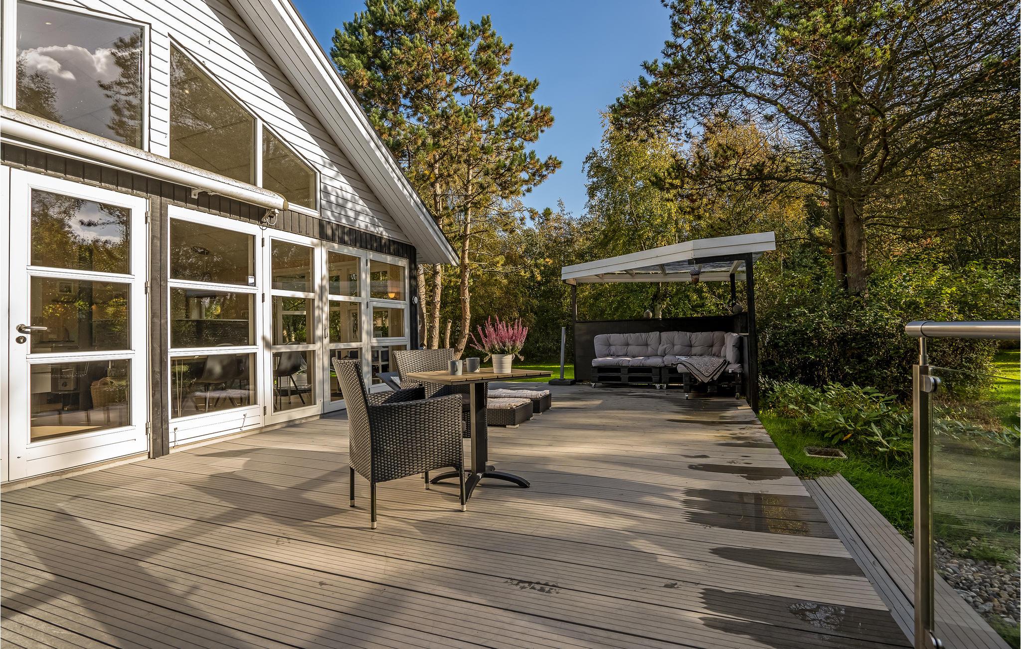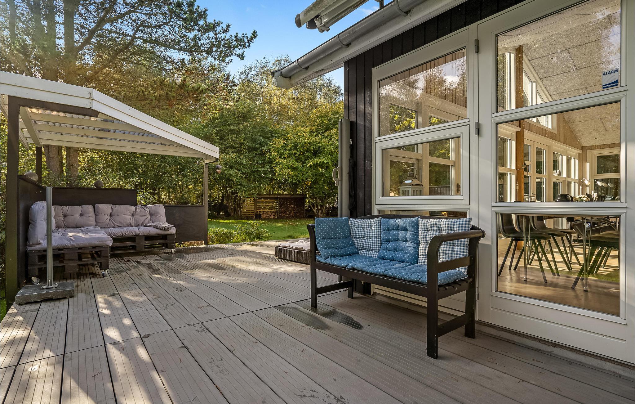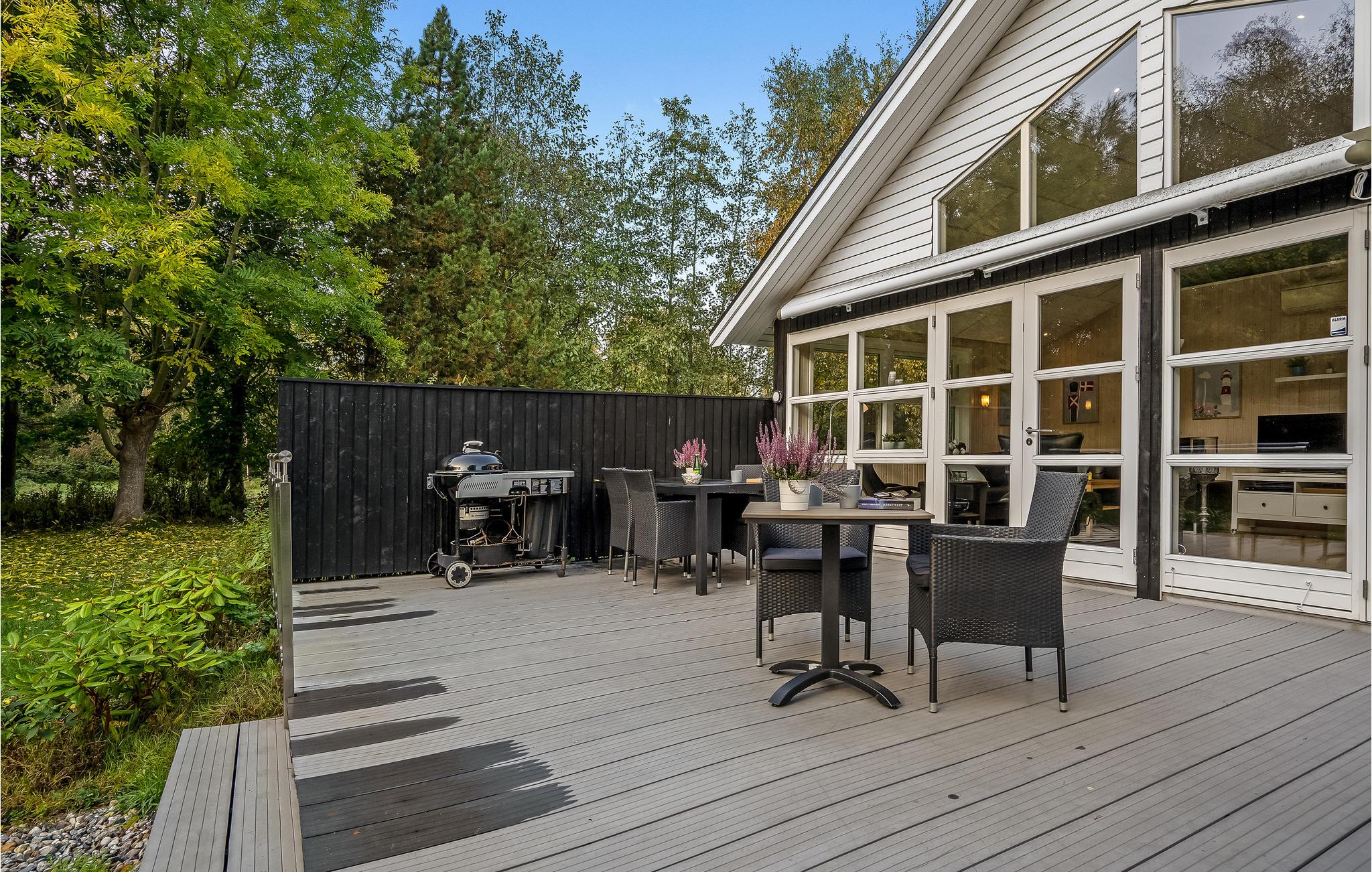 Huset ligger på en dejlig naturgrund med store træer og plads til, at jeres børn og hund kan bevæge sig. I kan både finde sol og skygge i terrassens mange hyggekroge, hvor det er skønt at læne sig tilbage med en bog efter en lang dag på farten. Der er både grill og havemøbler til de lune sommeraftener, hvor I helst vil spise ude i det fri.
