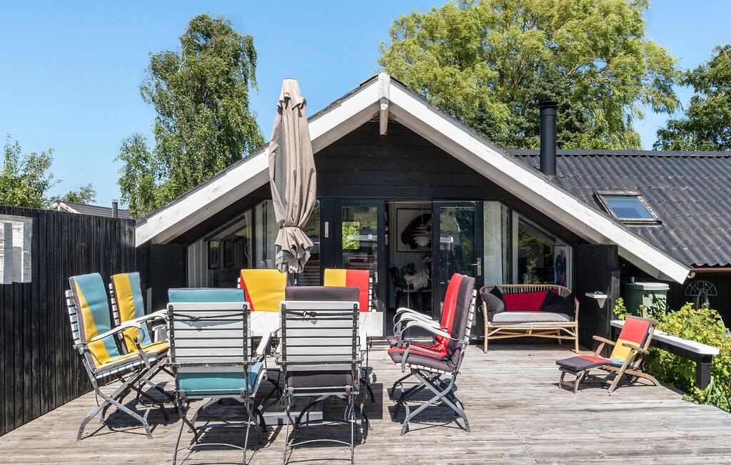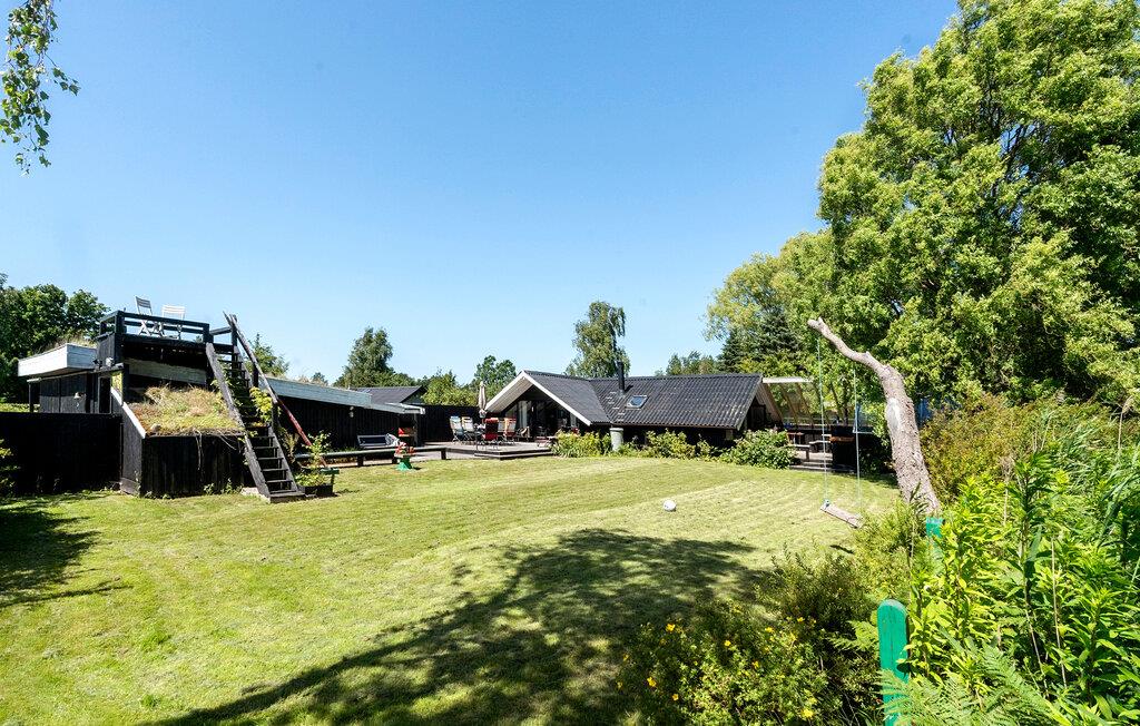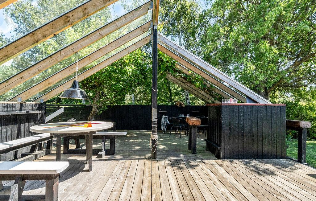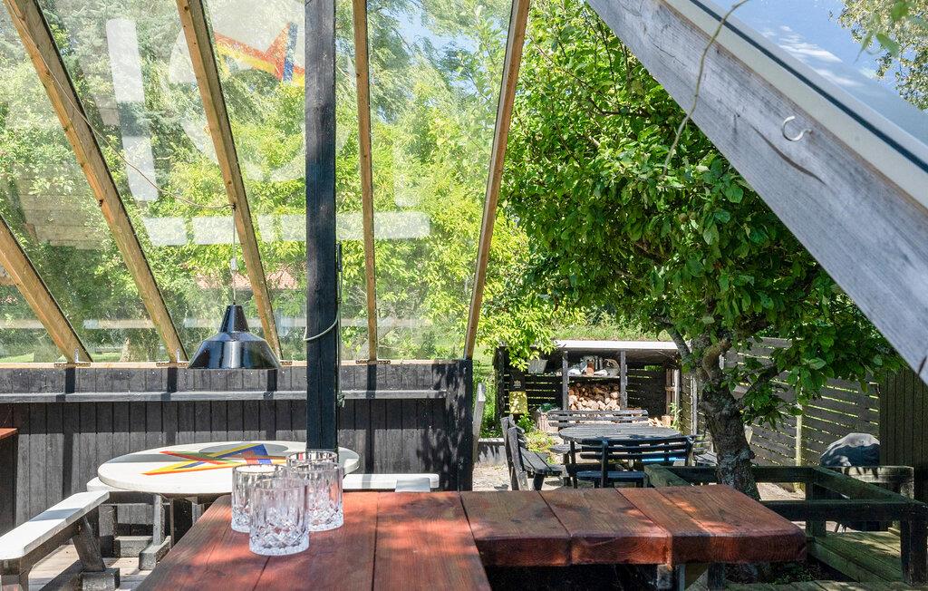 På den store solterrasse kan I rigtig nyde sommerdagene i de farverige havemøbler. Tænd op i bålfadet om aftenen og lyt til de knitrende flammer, mens mørket falder på. Hvis I trænger til en rolig stund, er der en skøn fred og ro på den lille udsigtsplatform med udsigt over haven, og i klart vejr kan I se til Tyskland. Sæt jer her og hold øje med fuglelivet eller nyd en drink oven på dagens program. Omkring huset er der masser af plads til leg, læsning eller en lille pause i solen. I det overdækkede shelter falder lyset ind gennem taget og gør det dejlig lunt på en forårs- eller efterårsdag. Om sommeren kan I lave mad i det overdækkede udekøkken, inden I serverer retterne ved spisepladsen. Huset ligger ugenert ved siden af et stort fredet område mod øst og er i kort gåafstand fra havet. Mod vest er hele grunden skærmet med en væg uden vinduer.