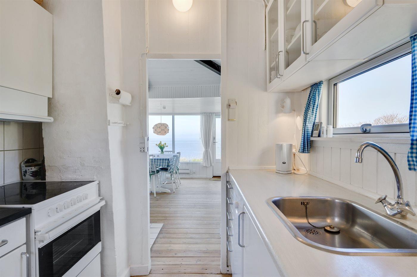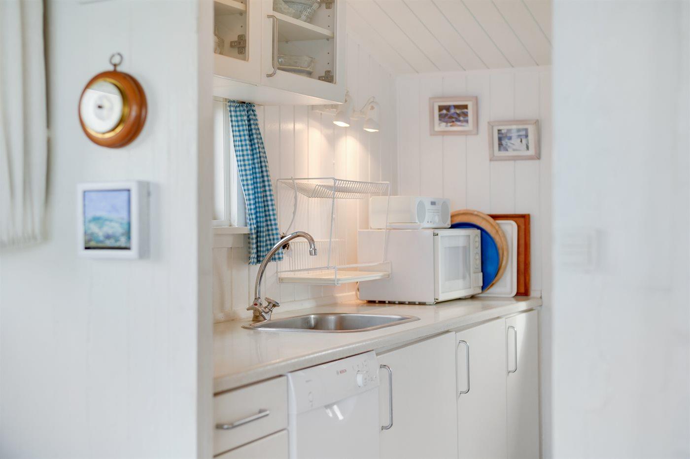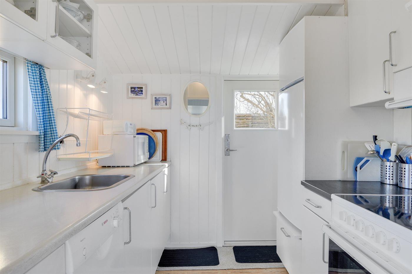 Køkkenet er udstyret med 1 køleskab. Der er 4 keramiske kogeplader, varmluftovn, mikrobølgeovn samt opvaskemaskine.