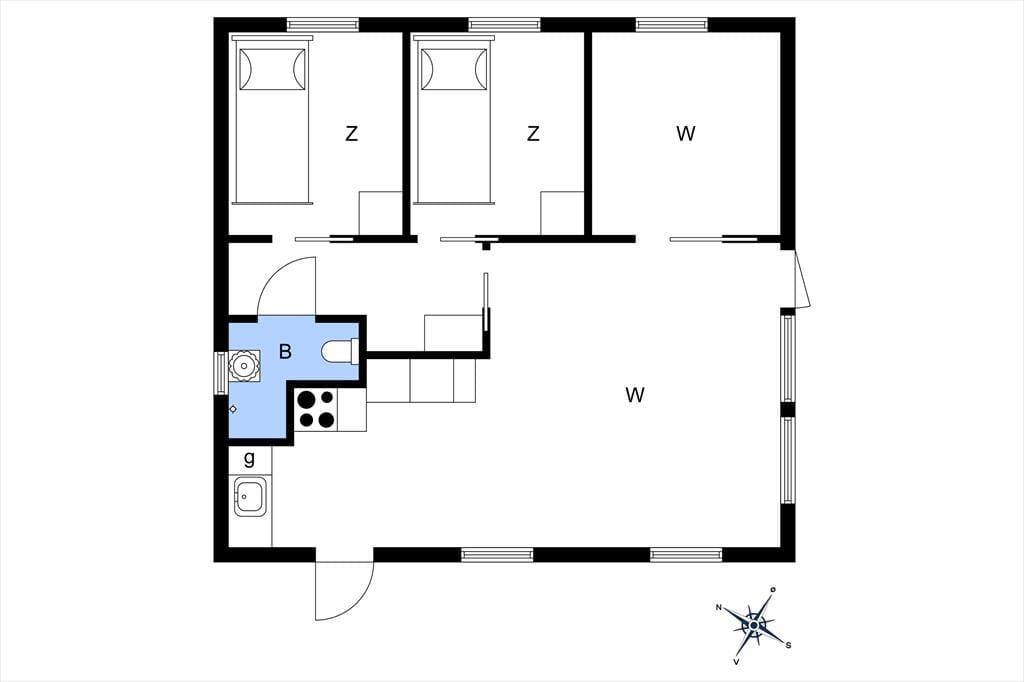 Det åbne køkken er nyere og veludstyret, så du let kan tilberede feriens måltider. Herfra er der ligeledes udgang til terrassen, så du kan tage maden med udenfor og spise i det fri. En lille, hyggelig spisestue samler familien omkring bordet, mens dagens oplevelser deles. Når natten falder på, kan du trække dig tilbage til et af de to soveværelser – det ene med en dobbeltseng og det andet med køjeseng. Badeværelset er med bruser, så du nemt kan skylle sandet af efter en dag ved stranden. Hele huset opvarmes med en luft-til-vand varmepumpe og radiatorer i hvert rum, så komforten er sikret hele året rundt.