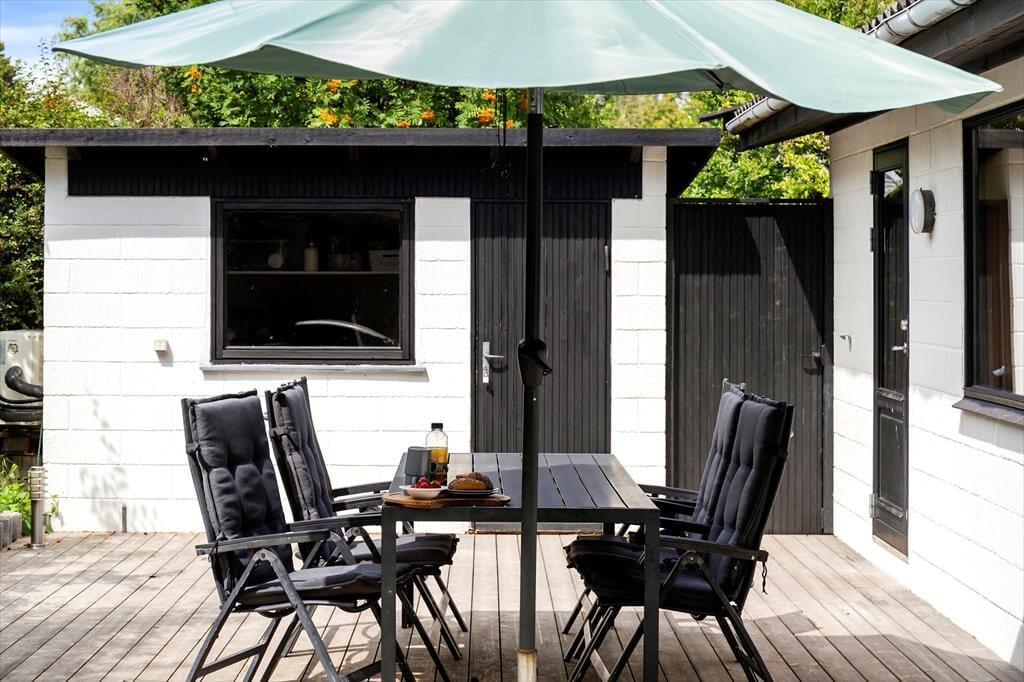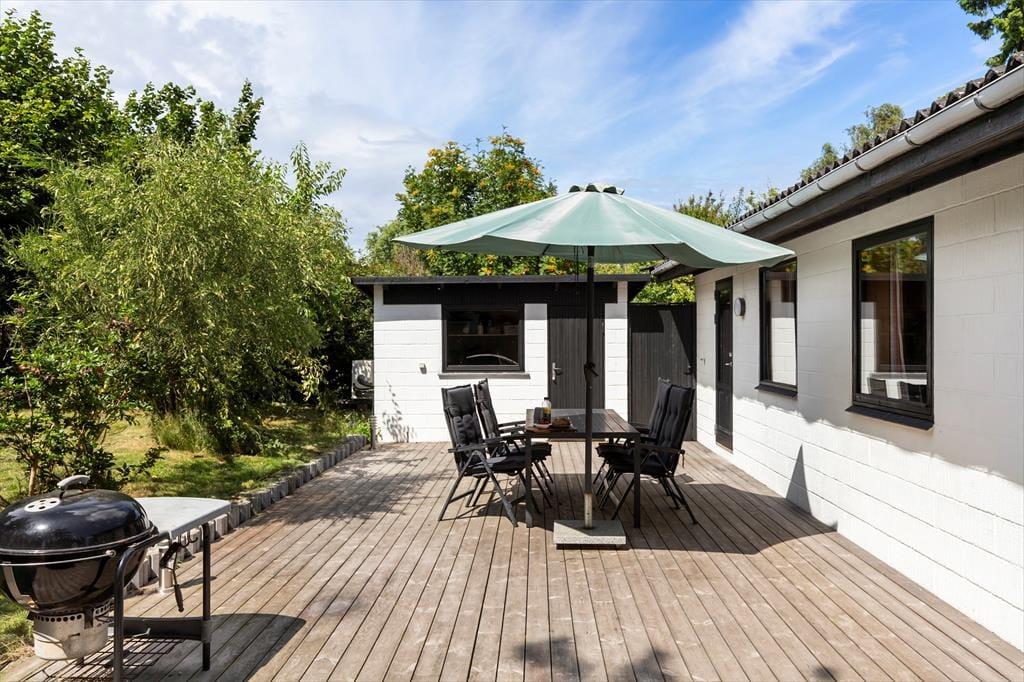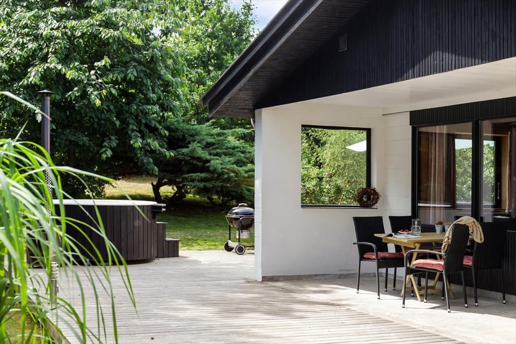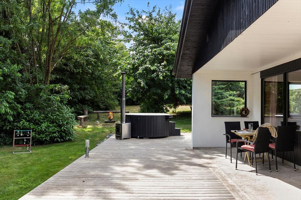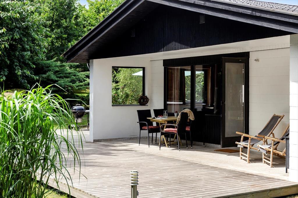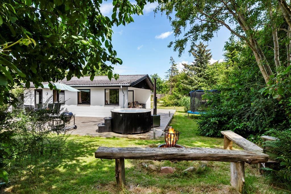 Sommerhuset er omgivet af en dejlig have, hvor både børn og voksne kan nyde naturen og slappe af. På den store terrasse, der delvist er overdækket, kan du nyde din morgenkaffe i solen eller samle familien til grillmiddag på lune sommeraftener. Haven byder også på en trampolin, hvor de yngste kan brænde energi af, og en bålplads, hvor I kan lave snobrød og riste skumfiduser over flammerne.