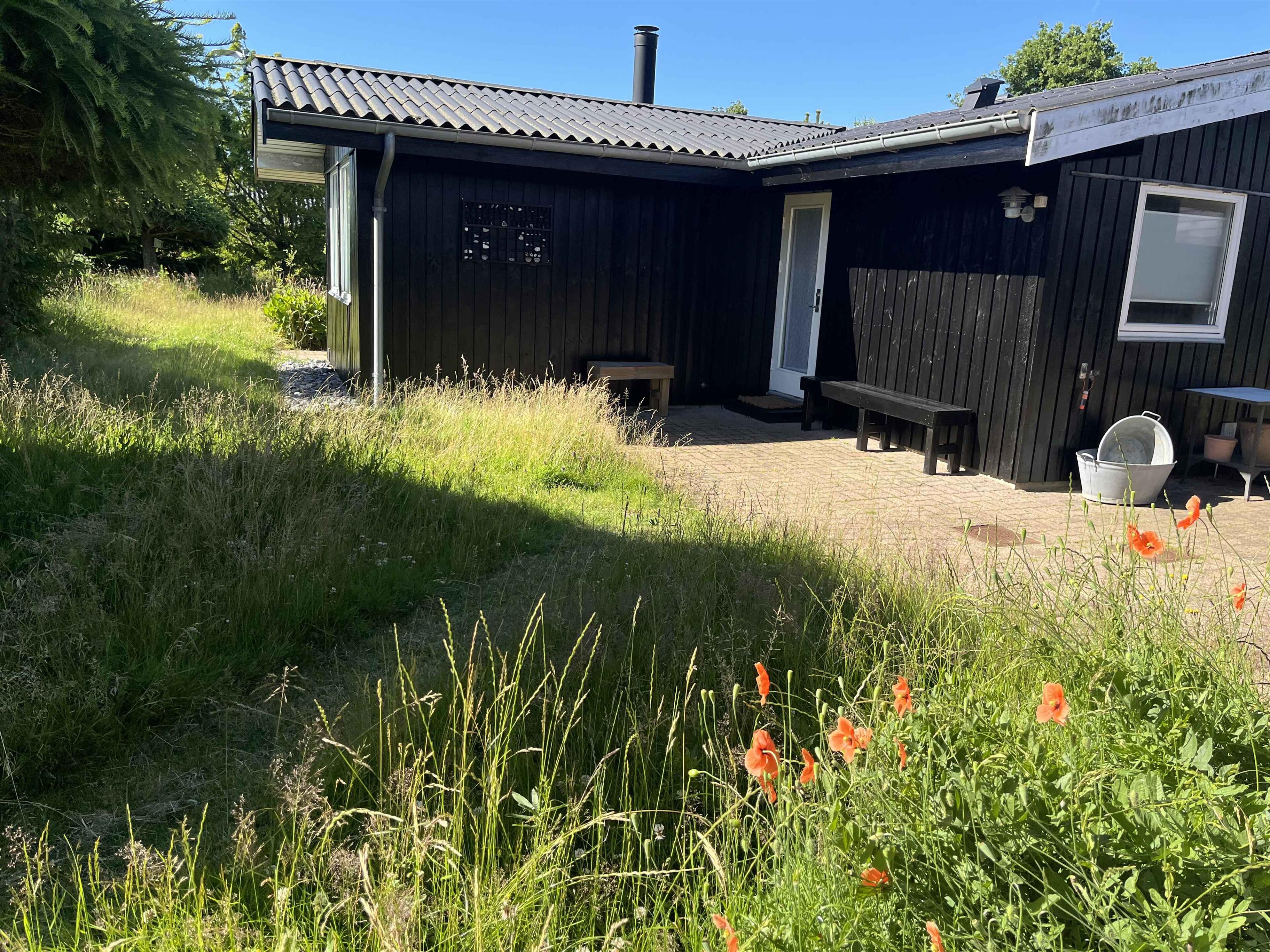 Hyggeligt sommerhus nær stranden i Nødebohuse med stor have og aktiviteter for hele familien.