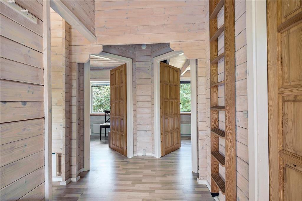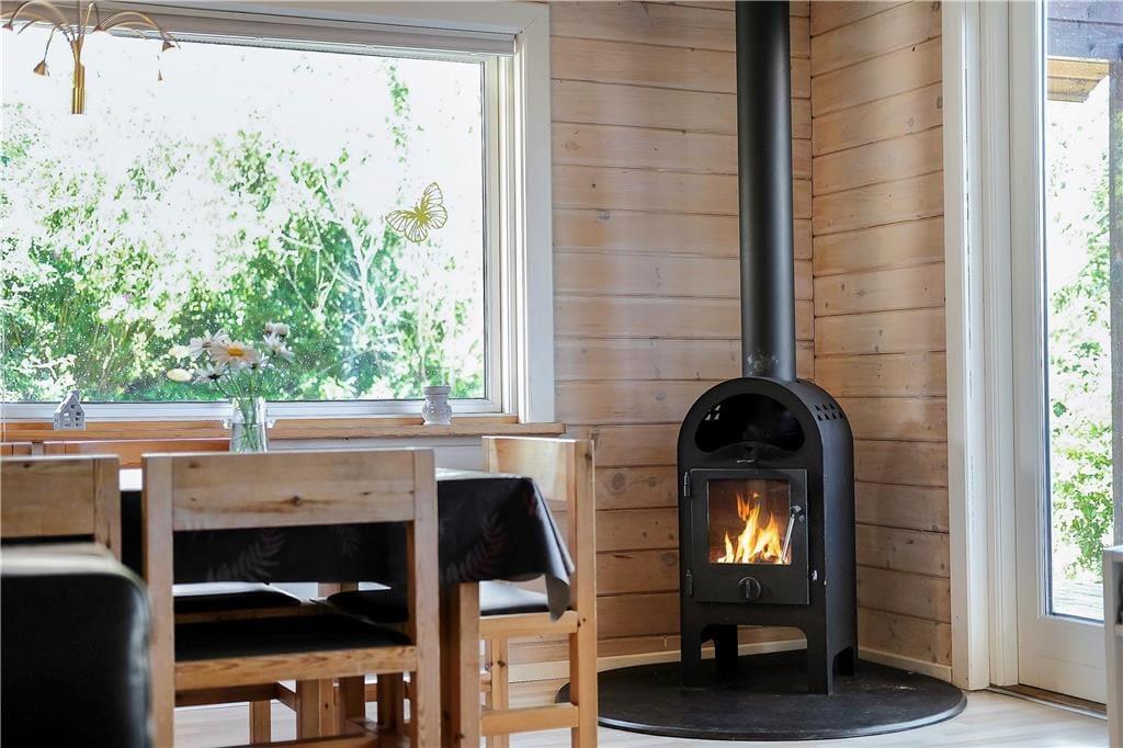 Sommerhuset, der er opført i 2005, har en rigtig hyggelig atmosfære med lys træbeklædning på væggene og loft til kip. Planløsningen gør det muligt at være op til otte personer, for der er tre soveværelser til rådighed plus en god hems med ekstra madrasser. Badeværelset er stort og udstyret med både spabad og sauna, og i stuen er et lækkert køkken integreret i rummet. Det gør det nemt at smutte hen for at hente mere kaffe og snacks, når I spiller brætspil ved spisebordet eller flader ud i sofaafdelingen med en god film. En brændeovn står i hjørnet af stuen, og de to store havedøre skaber en god forbindelse til den delvist overdækkede terrasse.