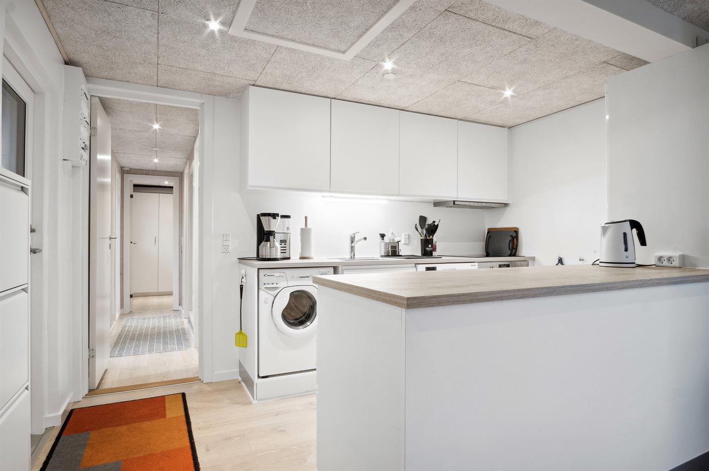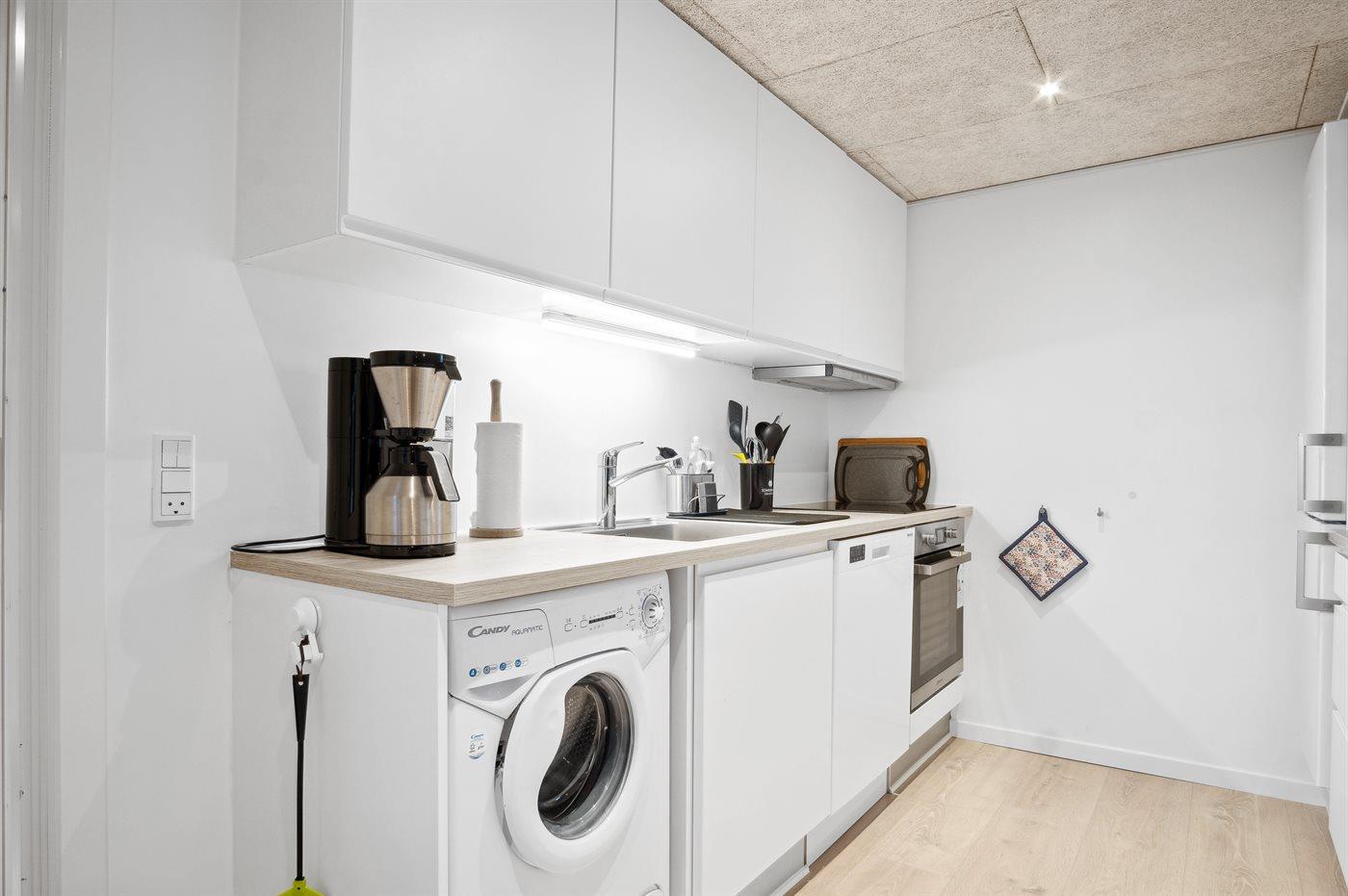 Køkkenet er udstyret med 1 køleskab. Der er 4 keramiske kogeplader, varmluftovn samt opvaskemaskine.