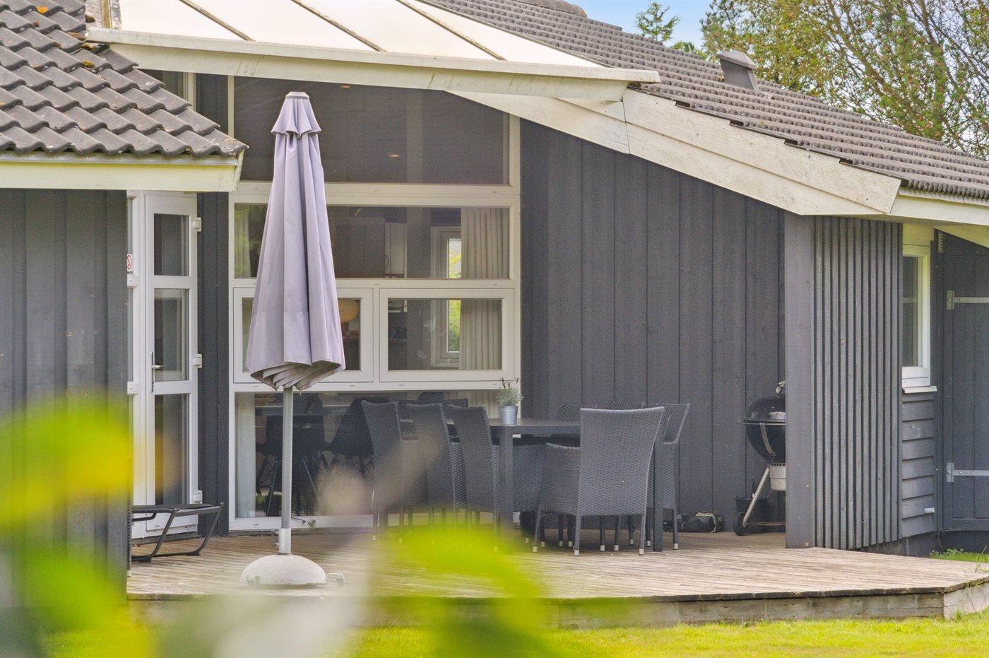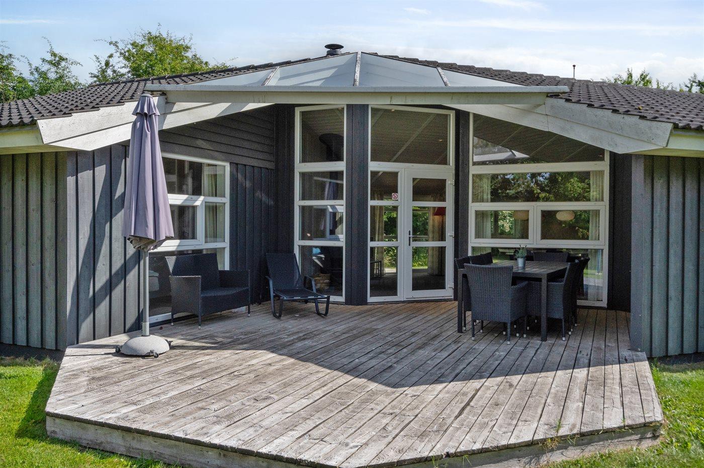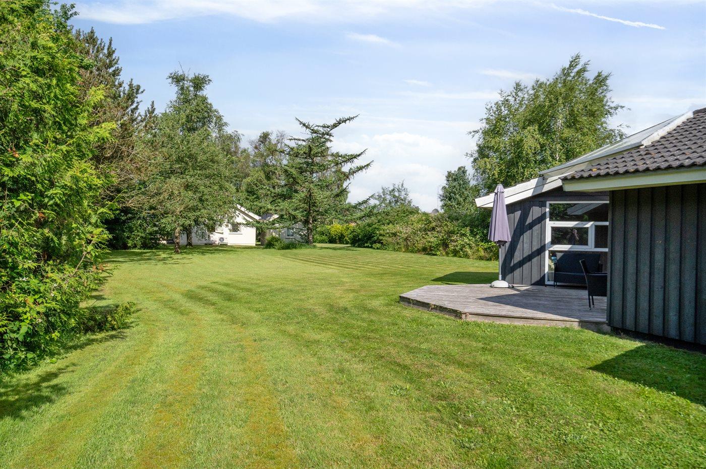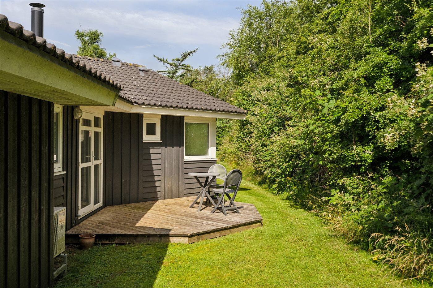 Den skønne have er et herligt sted at opholde sig. Grunden ligger dejlig ugenert, og her er der god plads til, at børn kan boltre sig på den store græsplæne. Sommerhuset har et skønt terrasseareal, som er delvist overdækket således der er mulighed for at nyde de dejlige sommeraftener selv, når duggen falder. På terrassen kan man sidde og nyde stilheden i fulde drag, og der er altid mulighed for at finde et dejligt læfyldt hjørne.