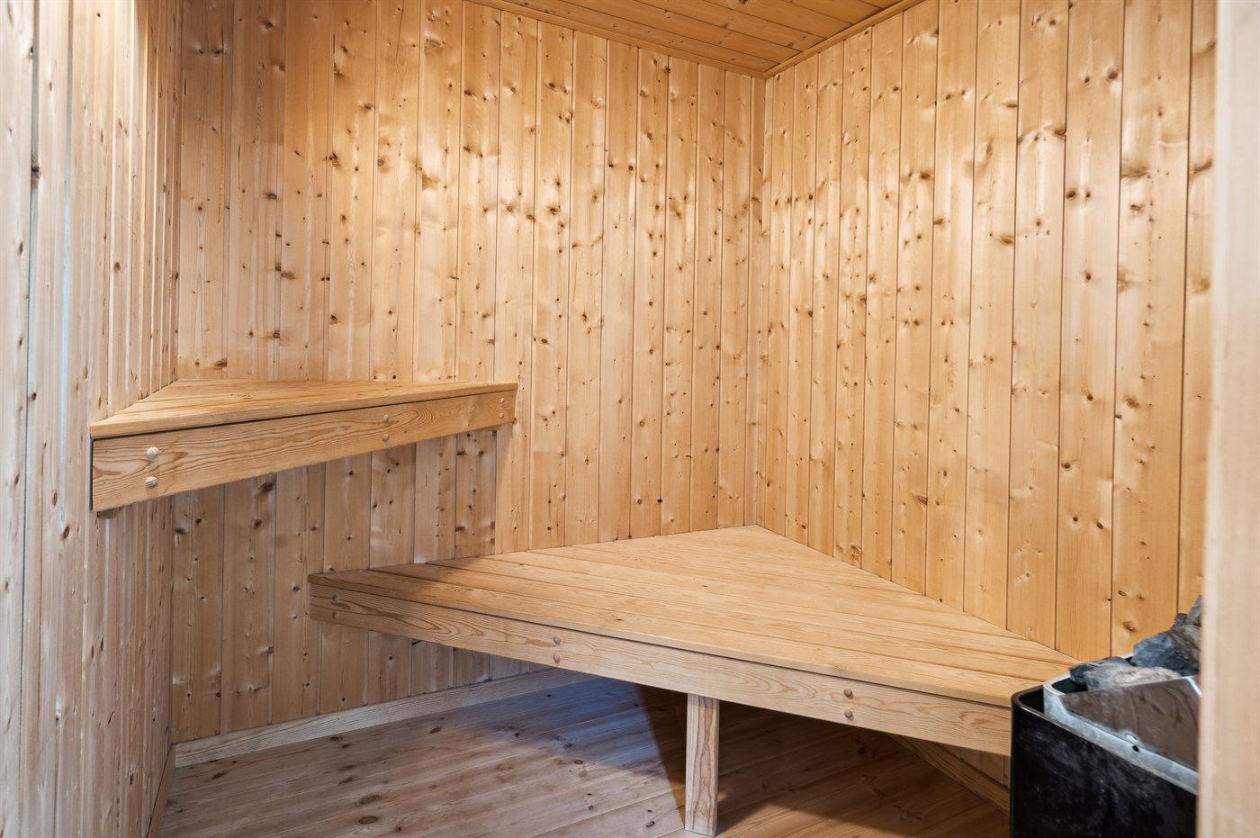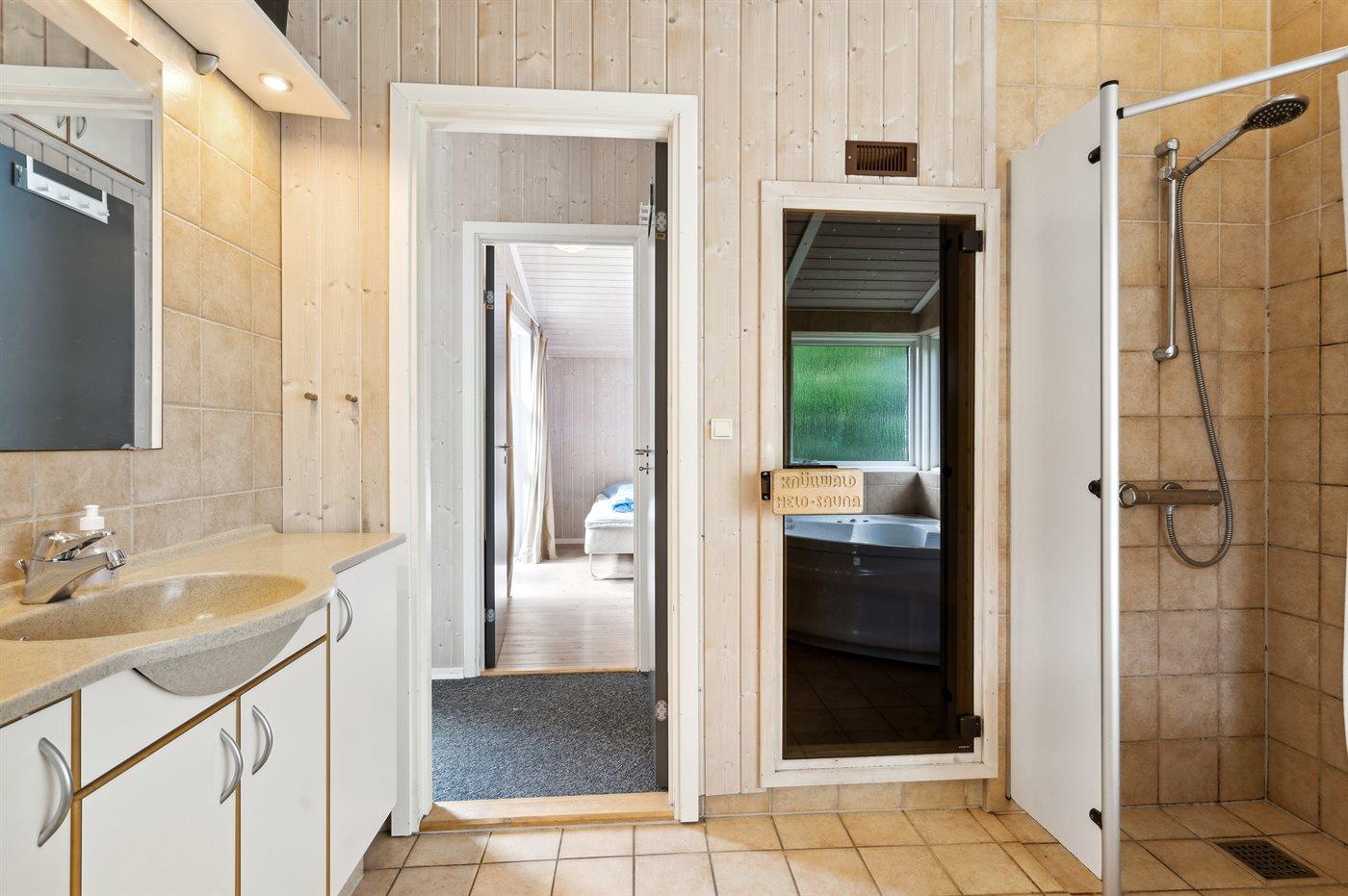 Der er 2 badeværelser med bruseniche og 2 toiletter. Der er gulvvarme på 2 badeværelser. I saunaen er der mulighed for afslapning.